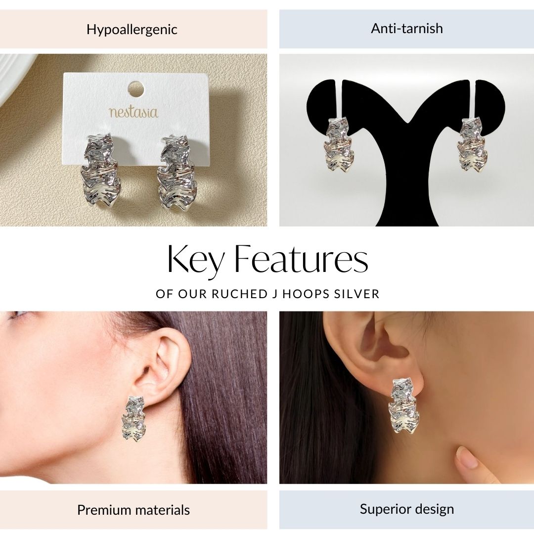 A perfect fusion of modern elegance and timeless style, these J hoop earrings are an exquisite addition to any jewellery collection. Drawing inspiration from the fluidity of movement captured in a structural form, their ruched design evokes a sense of graceful motion, bringing life to the classic hoop shape. The silver hue further amplifies their refined yet bold nature, making them a perfect statement piece for any occasion. Crafted with attention to detail, these earrings offer a blend of modern style and sophistication.