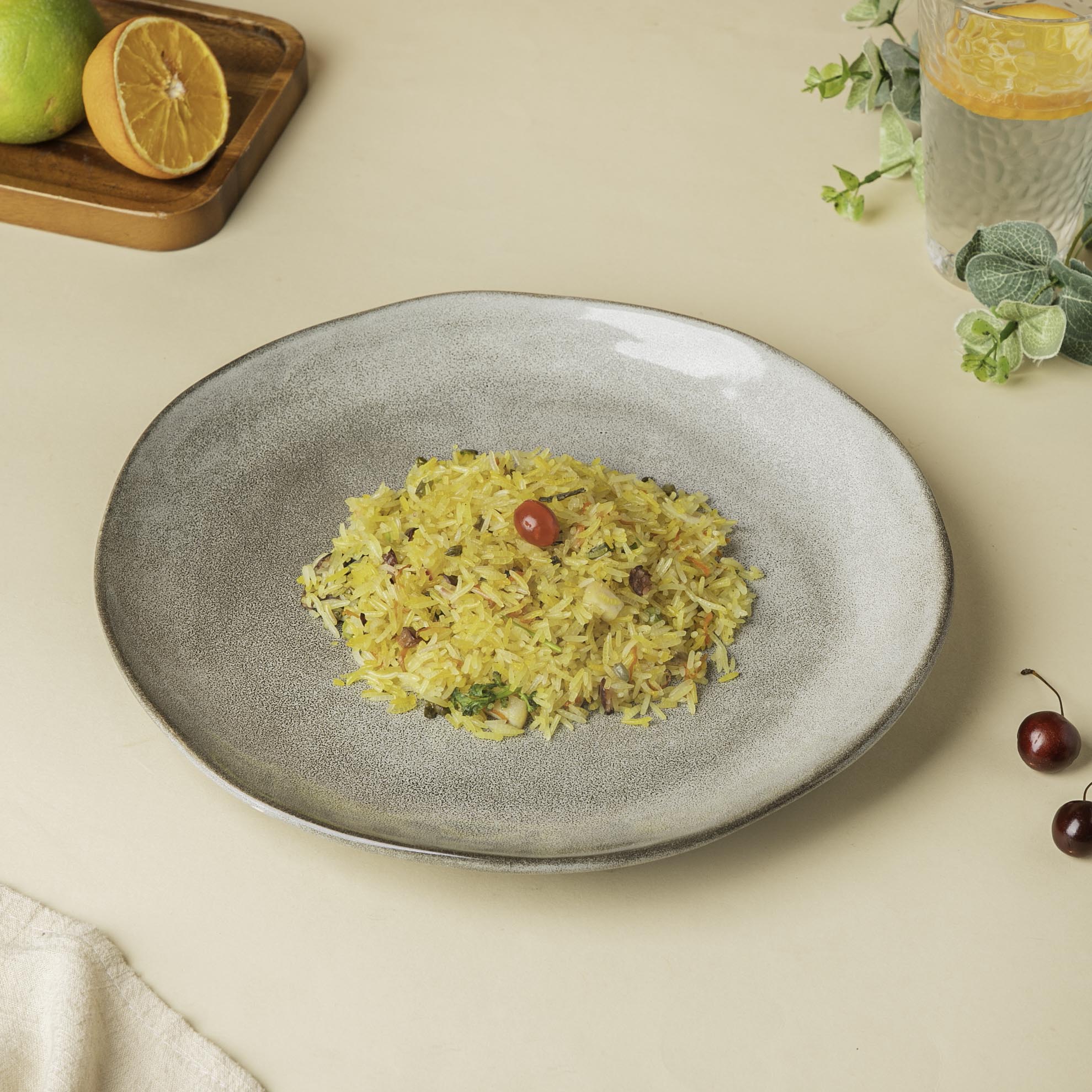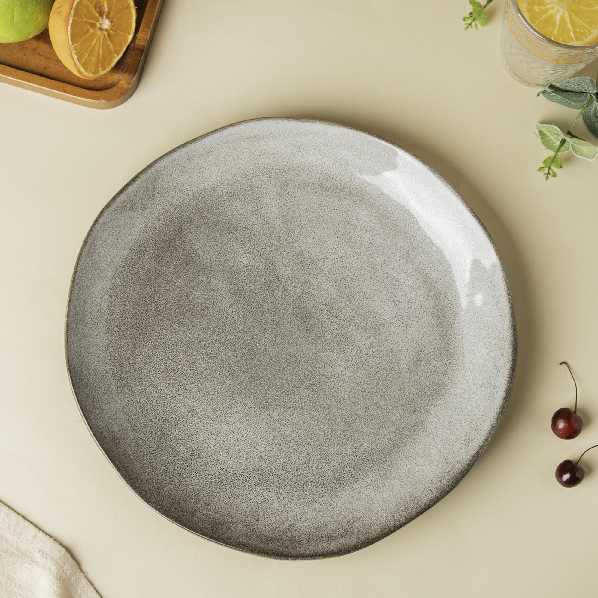 The grey and brown-tinged ceramic dinner plate will make any serving look stylish. With an irregular rim and textured surface, the rustic handmade ceramic dinner plate boasts a unique form. Create an exquisite table spread and impress guests by implementing the ceramic dinner plate into the setup. Nestip: Use the dinner plate as a platter to serve kebabs or dumplings during evening gatherings. Size: 28cm D x 3cm H Colour: Grey, brown Material: Ceramic Products included: 1 plate Style: DBAC110T38