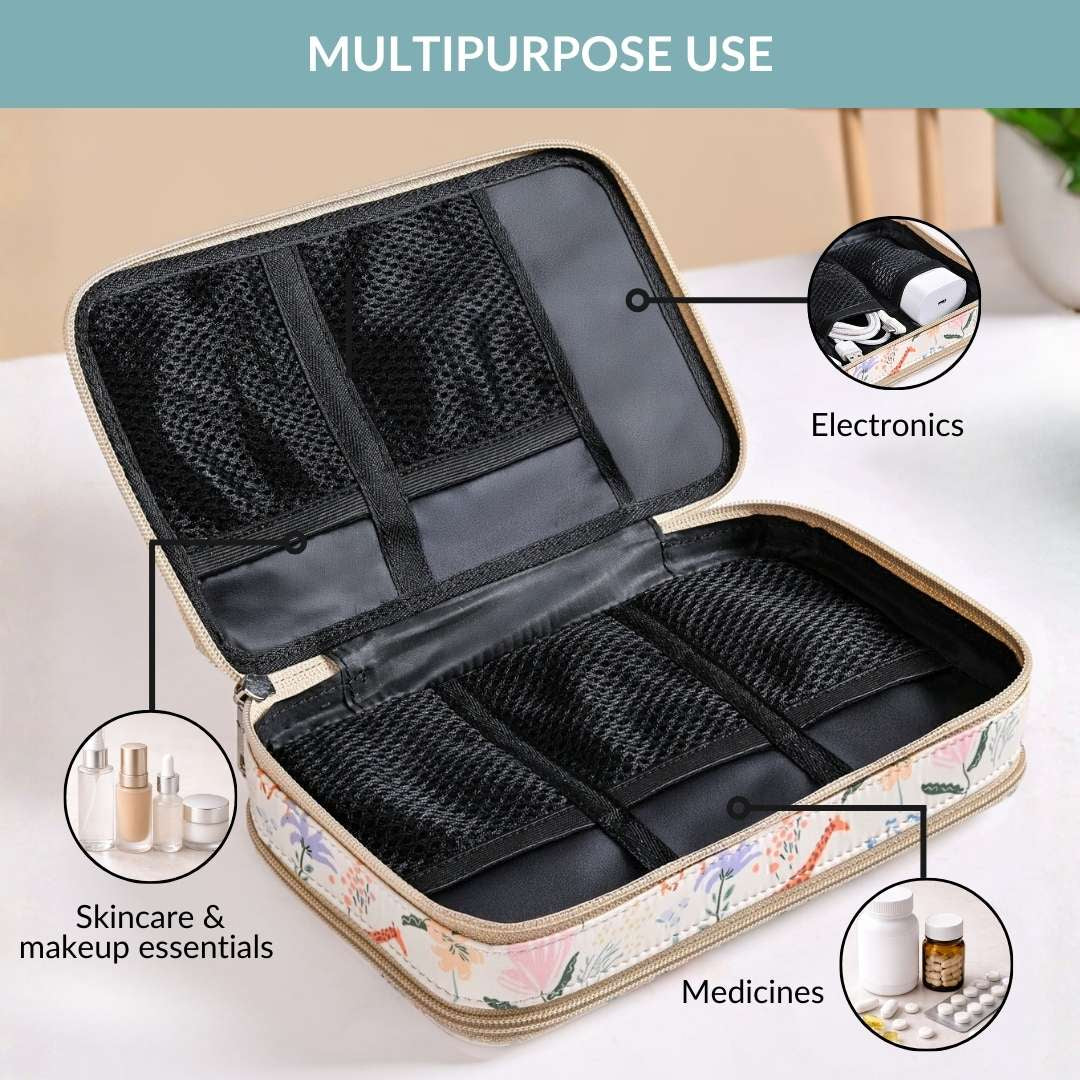 Benefits: This travel organiser comes in handy to neatly store your skincare, cosmetics, or even electronics like chargers and earbuds. The durable nylon fabric and sturdy metal zips protect your items during long trips. Its top handle makes it easy to carry, ensuring your travel pouch is always ready for your next adventure.