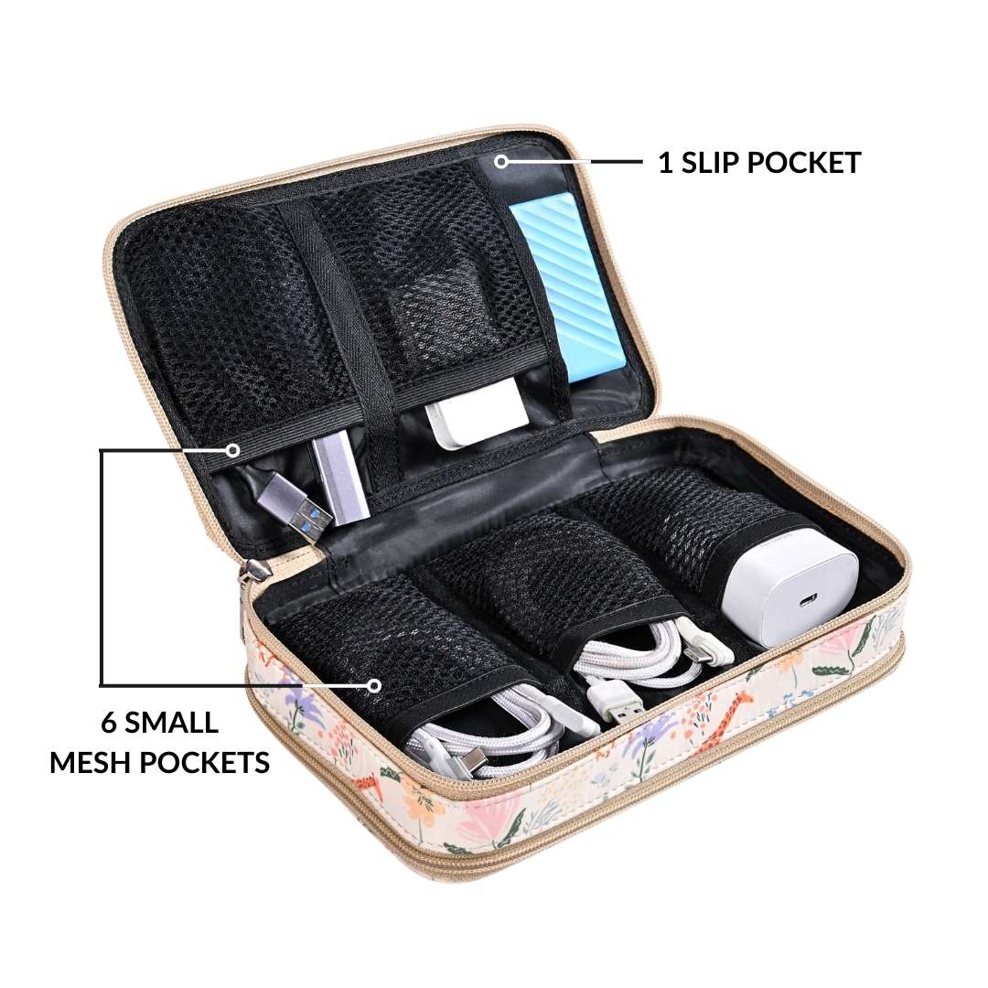 Design: This organiser features a vibrant jungle print with orange tigers and giraffes on an off-white background. The travel pouch includes a multi-layered divider design with six small mesh pockets and one big mesh pocket. It also offers a slip pocket and two inside straps for extra security.