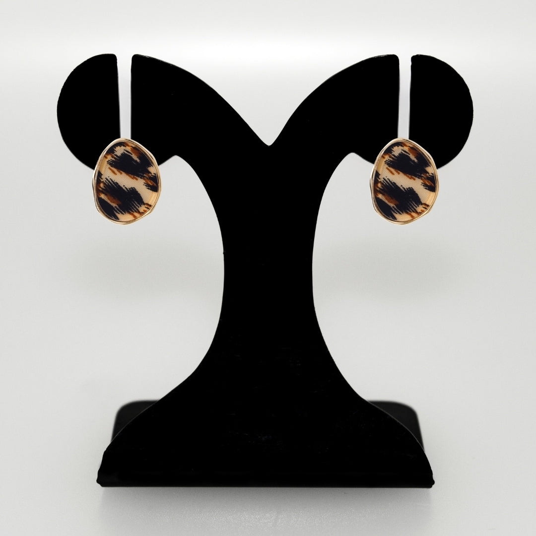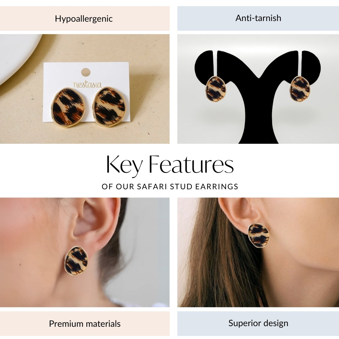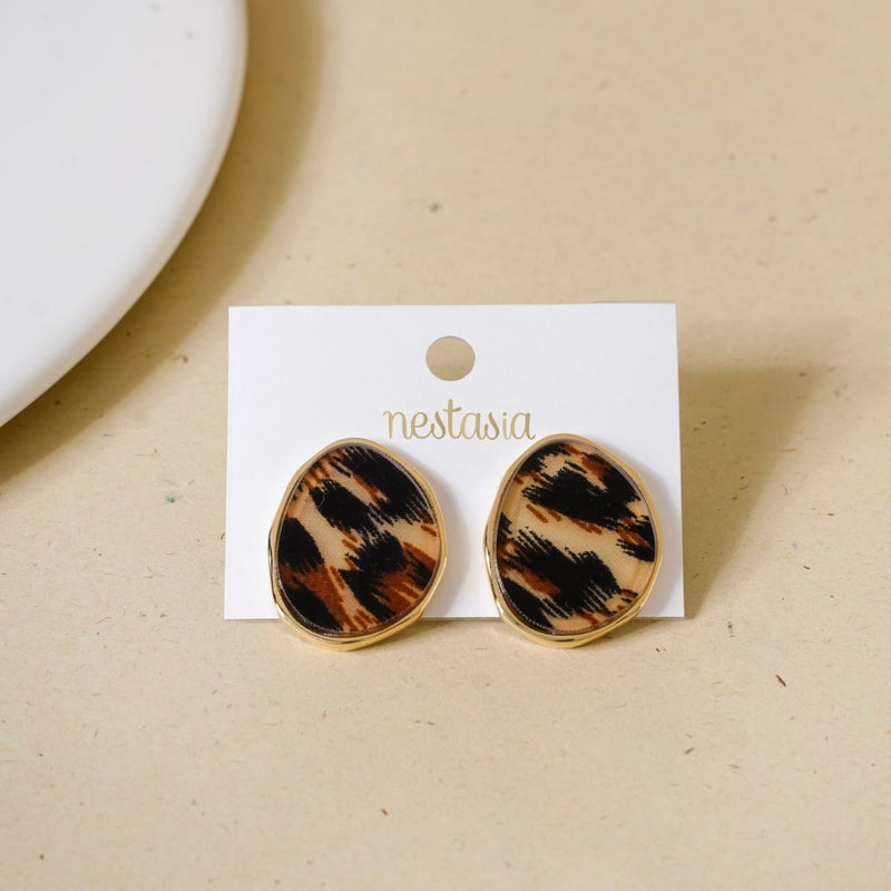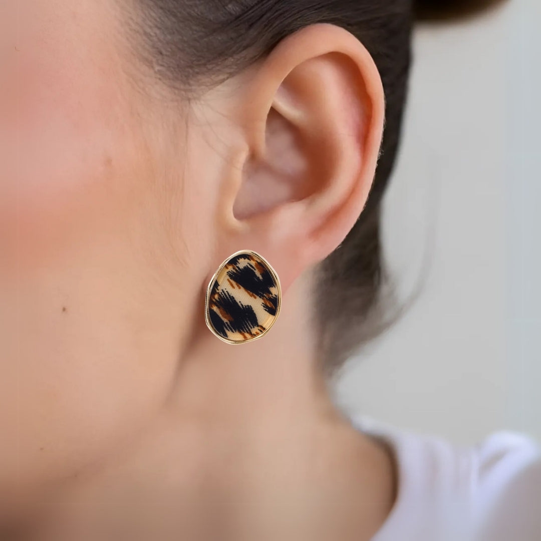 These stud earrings tell the story of nature’s raw beauty, where the untamed savannah meets refined elegance. Drawing inspiration from the captivating patterns of the leopard, the design captures the spirit of the wilderness in every detail. A luminous gold frame creates a striking contrast against the bold leopard print, highlighting the vast difference between nature’s fierce allure and its sophisticated interpretation. A perfect blend of grace and adventure, these earrings bring the spirit of the wild into the world of refined style.