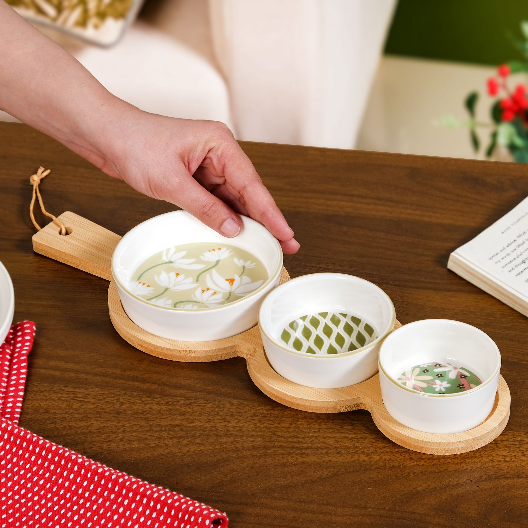 Design: Each ceramic bowl boasts durability and artistry, featuring floral and geometric patterns in soothing green and white hues. The natural bamboo board enhances the presentation with its smooth surface and compact design. Three separate bowls sit securely within the tray, while the integrated handle ensures easy and stable carrying. Lightweight and space-saving, it’s as practical as it is beautiful.