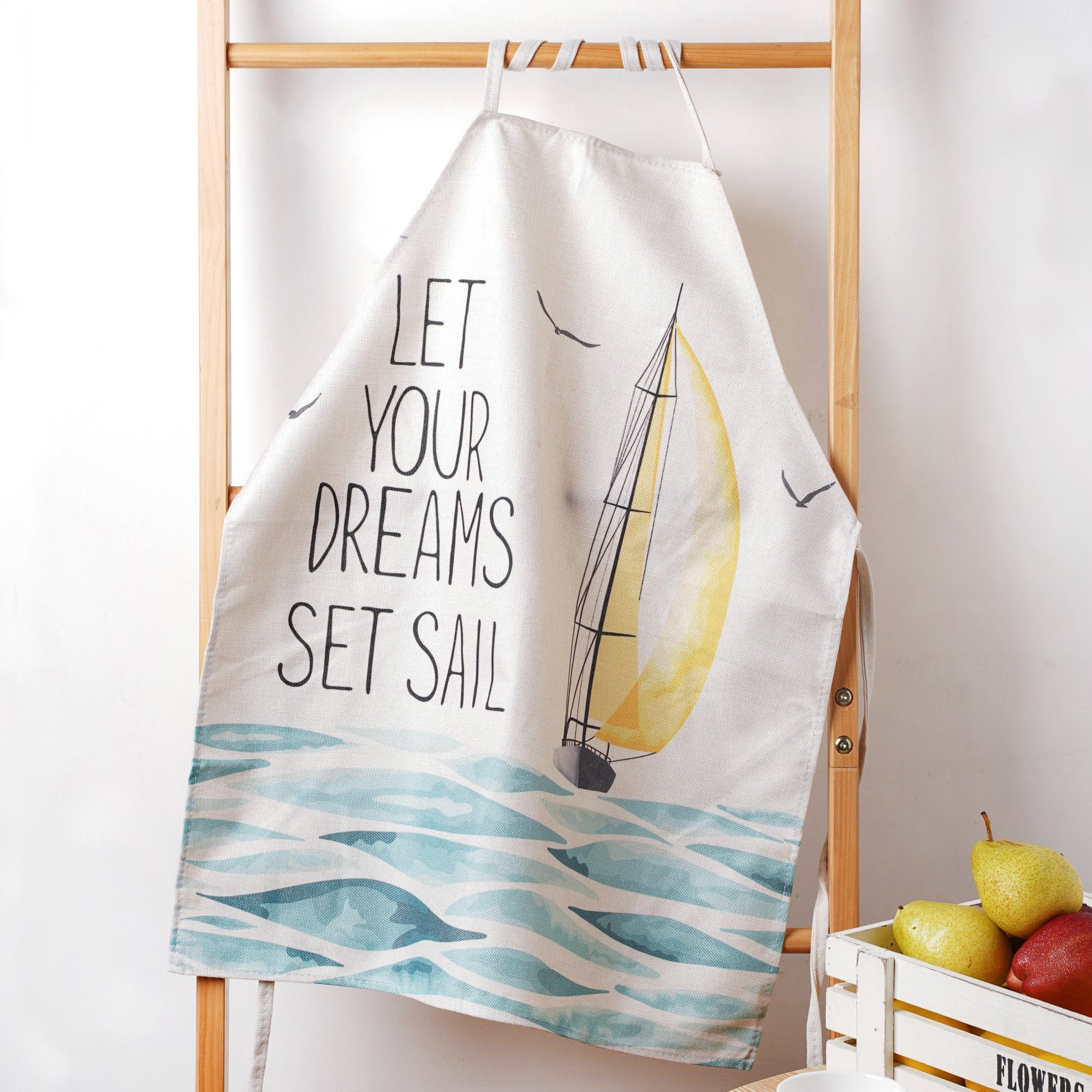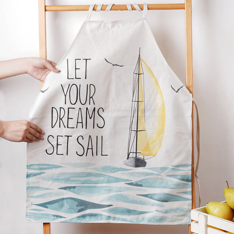 Heavily inspired by sailing, the beige apron is a sweet addition to chef life with its painted 'ship sailing at sea' print at the front and two tie up straps at the waist. The cooking apron is comfy and breathable and made of quality grade canvas material. Forget all the laundry woes when working with the kitchen apron on as it saves the clothes from spillages and dirt. The typographic print of an inspiring quote at the bottom that says 'Let your dreams set sail' further adds to the kitchen apron's appeal.