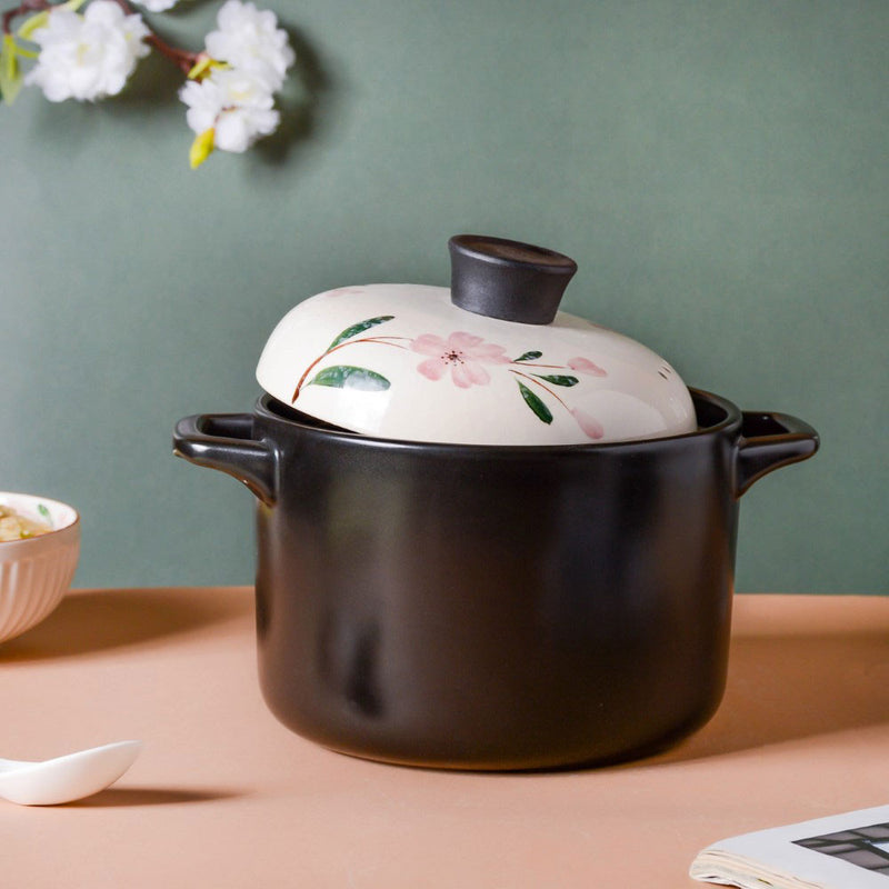 The cherry-blossom patterned stew pot has a large holding capacity, enough for a family of three to four. One can easily carry around the ceramic pot using the two bakelite handles provided by the side. A variety of stews, soups, and sauce-based recipes can be prepared in the cooking pot, with minimum hassle. A cover-lid with a knob-like handle helps the cooking pot in securing complete insulation.