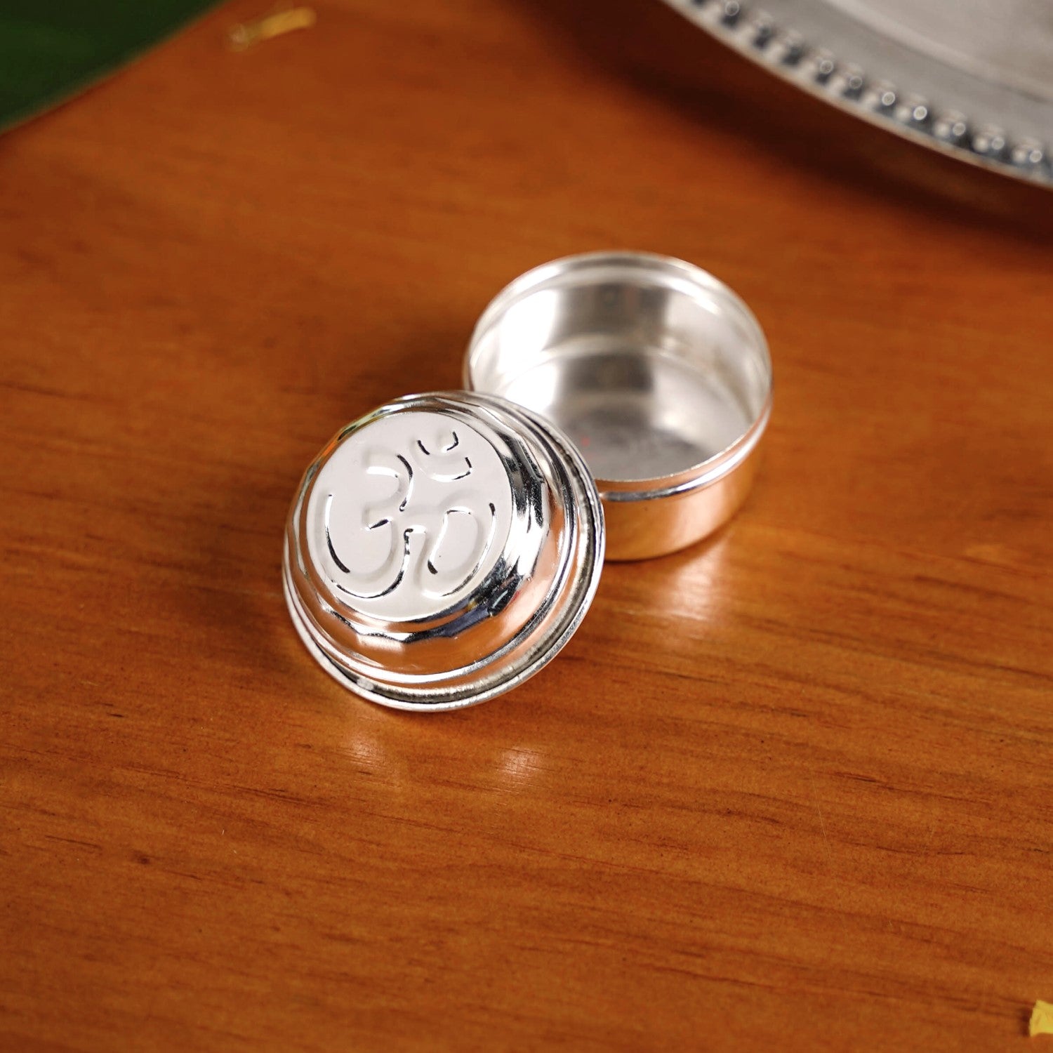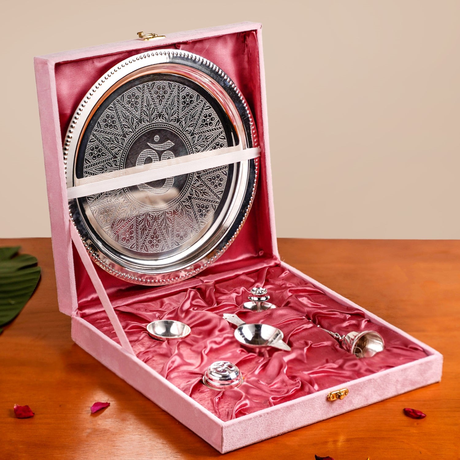 Benefits: Bring a sense of completeness to your daily rituals with this thoughtfully curated puja thali set, featuring all the essentials for a spiritual setup, starting from ghanti (bell), diya holder, agarbatti stand, camphor/sindoor box, to prashaad bowl. The thali is crafted from pure stainless steel, while each accessory is made of silver-coated brass, blending durability with timeless tradition. Spiritual elements like the Om-embossed lid add depth to your worship. The five-slot incense holder fills the space with soothing fragrance and stands firmly with its broad base. Ideal for both daily pujas and festive ceremonies, this set offers both beauty and purpose.