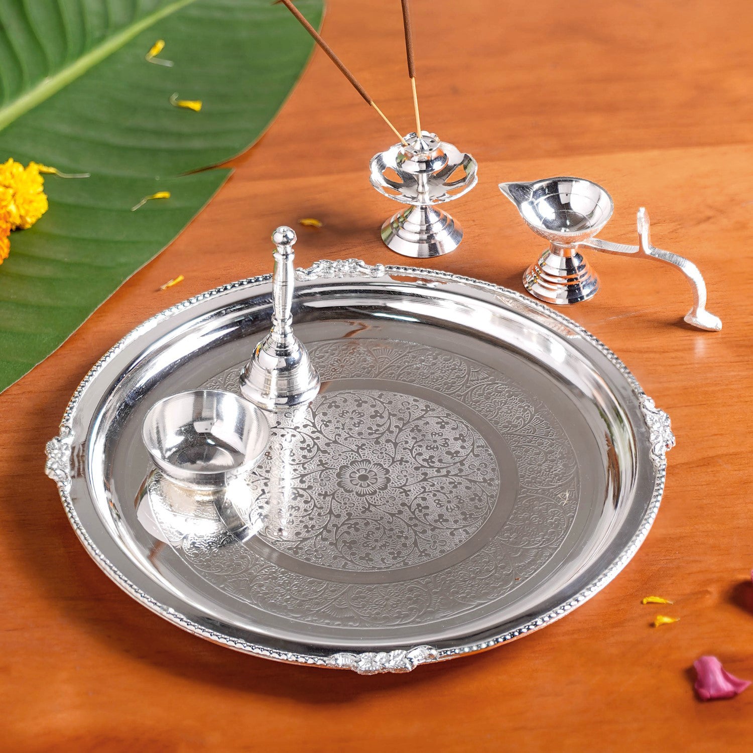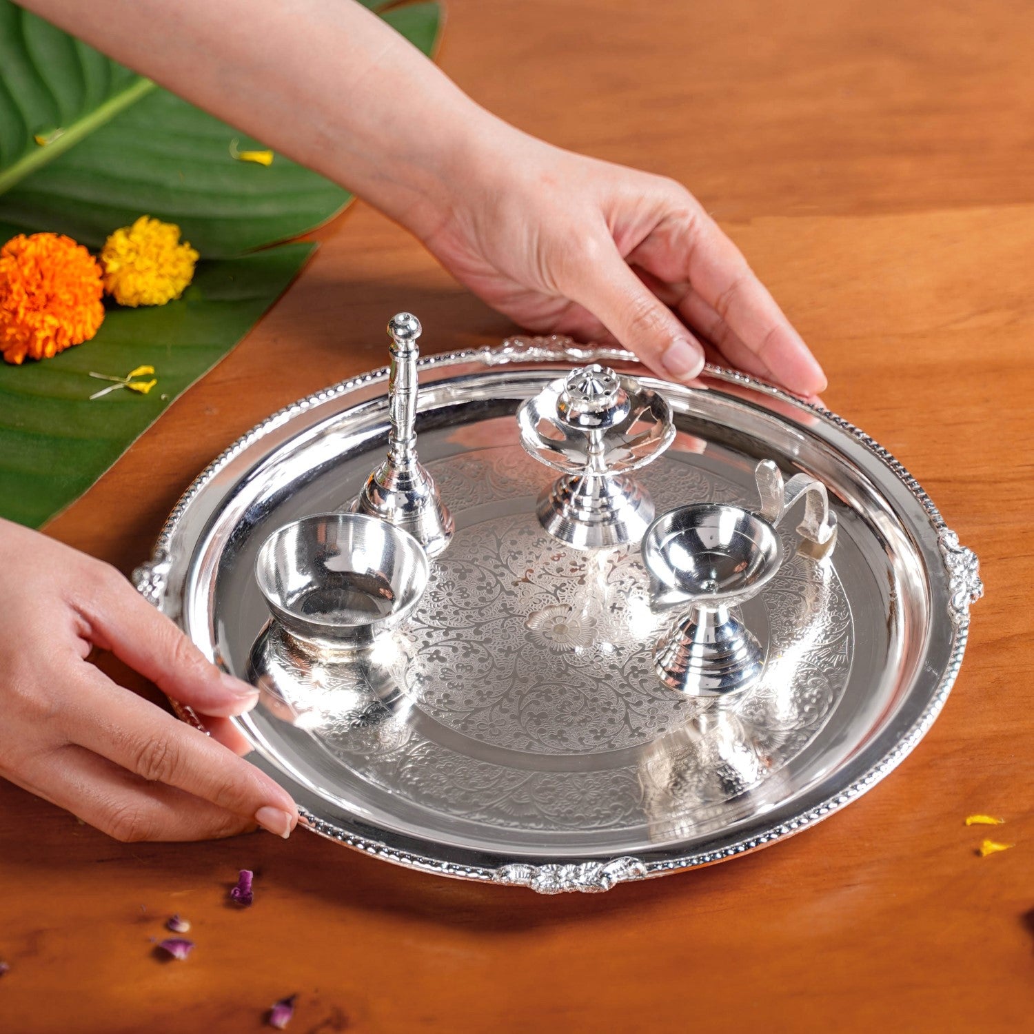 Benefits: This thali set’s heat-resistant design keeps lit diyas safe without warping or overheating. The stainless steel surface resists stains from chandan, sindoor, and haldi, making cleaning easy. Silver-coated brass components prevent rust and maintain their shine over time. A stable, flat base keeps all offerings secure during rituals, while the compact, lightweight design makes the set easy to carry and use anywhere. With separate, dedicated accessories, setting up and cleaning after pooja is quick, hygienic, and hassle-free.