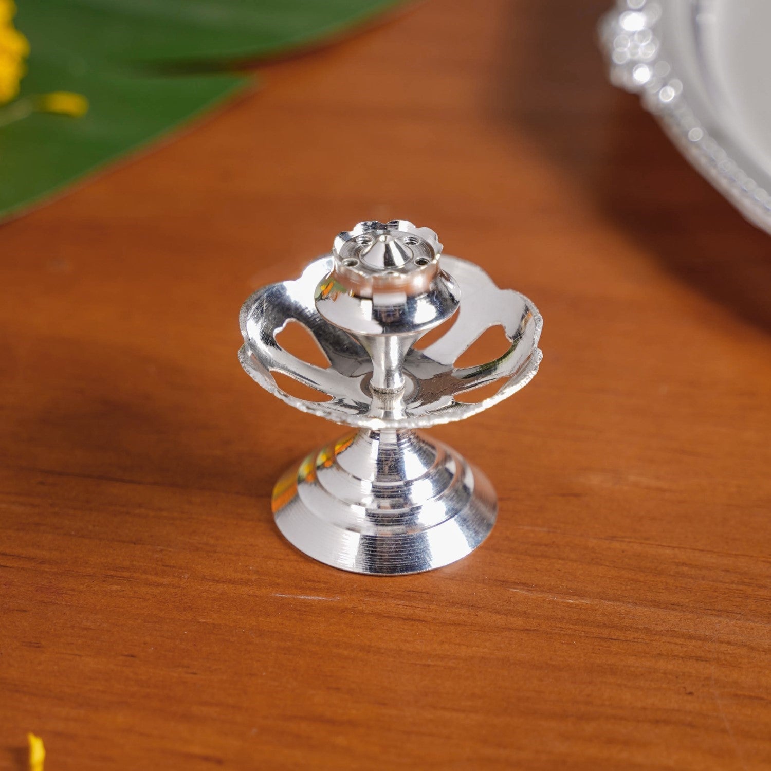 Design: The thali features a ribbed rim with four embossed floral accents, symbolising the four directions of sankalp. At its centre, a mandala-inspired design adds a sense of balance and spiritual depth to the setup. The diya stand is thoughtfully shaped with an elongated tail and curved finger rests, allowing for steady grip and control during ritual flame lighting. The diya, agarbatti stand, and ghanti are all crafted from brass with a silver coating, lending them a radiant, polished finish. With five evenly spaced slots and a solid base, the agarbatti stand ensures stable placement during pooja. The prasad bowl is smooth and rounded with a deep base, perfectly suited to hold sweets, dry fruits, or prasadam. Each element is designed to fulfil a distinct purpose, creating a harmonious and intentional flow for every step of the ritual. For added convenience and elegance, the full set is presented in a plush velvet gift box, ideal for both premium gifting and safe, organised storage.