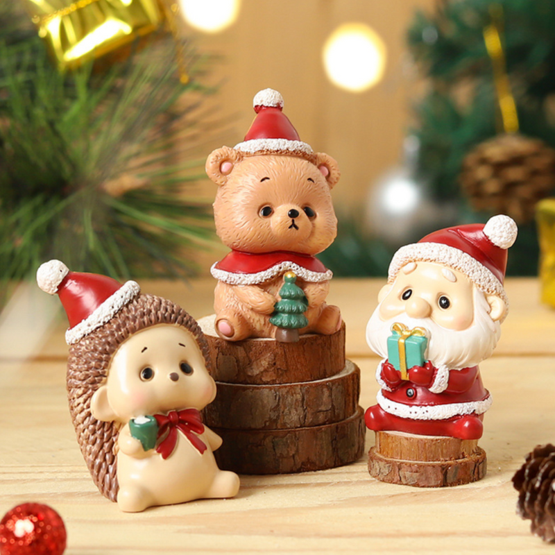 A mini Santa Claus figurine holding a christmas present in his hands made of resin, apt for gifting. The vibrant red colour can liven up the decor of the space and add some festive cheer.