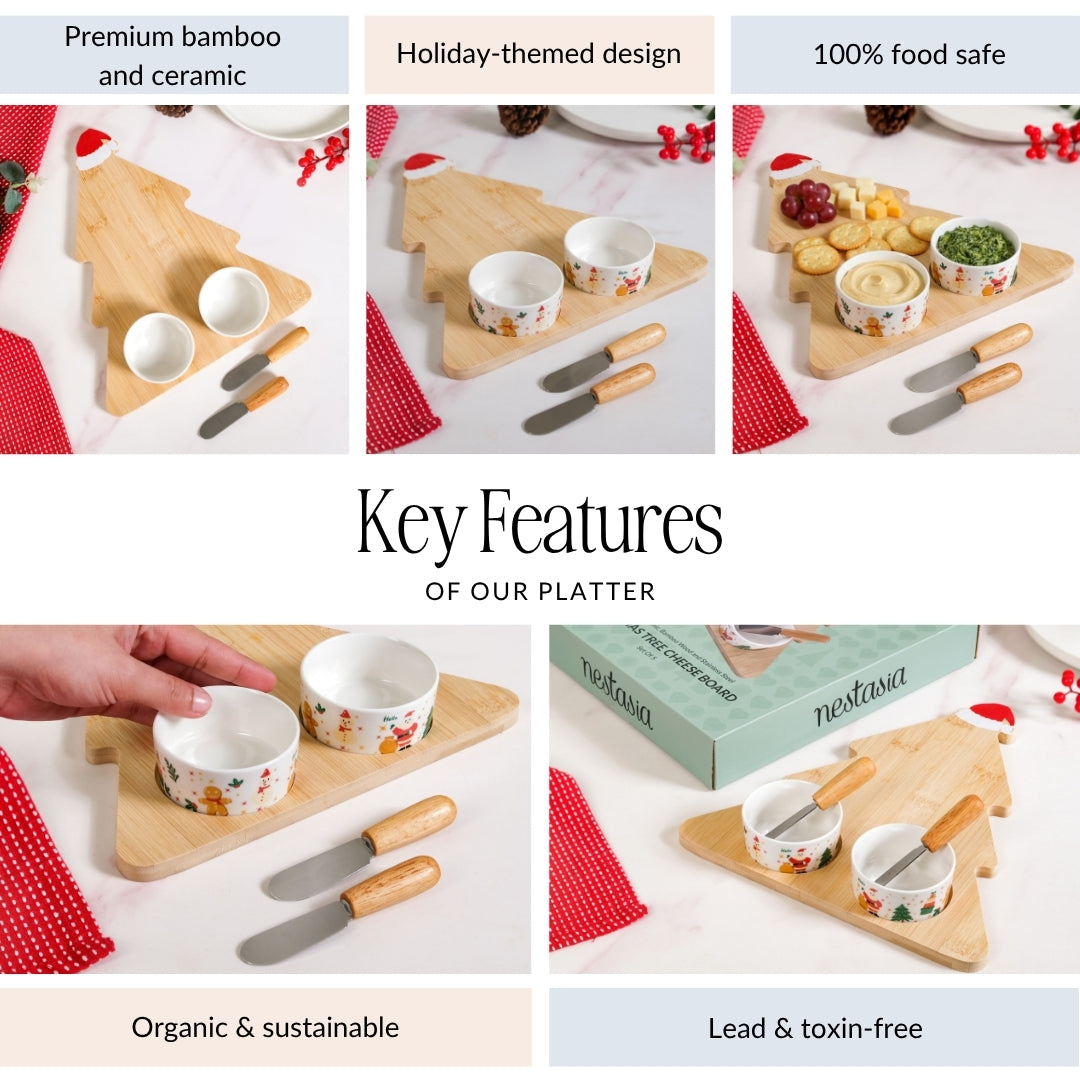Benefits: Ideal for serving cheese, dips, or small appetisers, this set adds fun and festive charm to any table. Bamboo ensures durability and sustainability, while the unique tree shape impresses guests with creative style. Removable ceramic bowls simplify cleaning, and separate stainless steel spreaders make serving effortless. Microwave and dishwasher-safe bowls enhance practicality, while the ready-to-give packaging saves time, making this set a complete hostess gift for holiday entertaining.