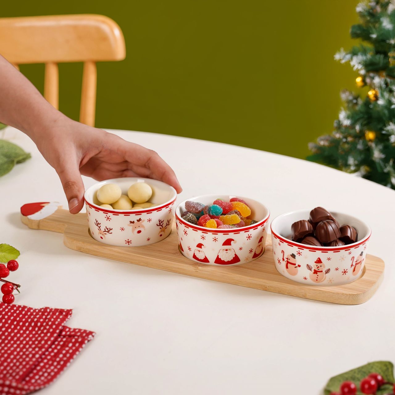 Benefits: Made from durable ceramic and sturdy bamboo, this set promises longevity and easy maintenance. The narrow tray helps save table space while securely holding each bowl. Its cheerful holiday prints create a warm, festive atmosphere and make serving snacks and treats more fun. Ideal for gifting, entertaining, or everyday seasonal décor.