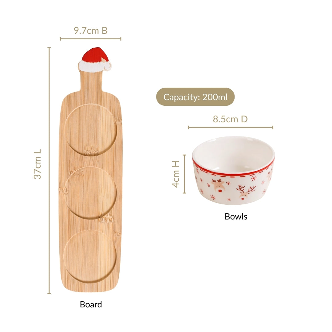 Design: This Christmas-themed serving set includes three white ceramic bowls adorned with charming Santa, snowman, and reindeer prints. Each bowl features a red rim and a shallow, tilted design for easy serving. The natural bamboo tray has a long, narrow shape with a playful Santa hat cutout handle. Designed for both display and function, the set comes neatly packaged in a beautiful gift box, making it perfect for gifting or festive hosting.