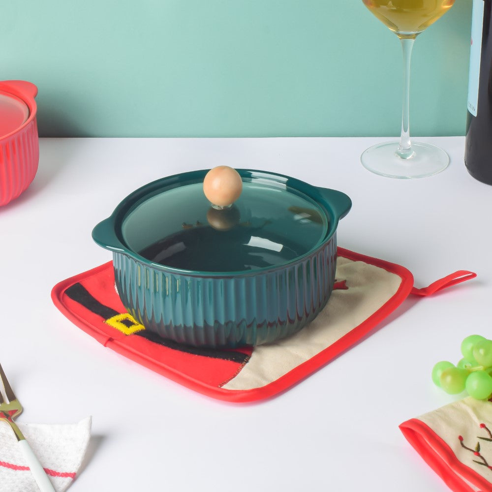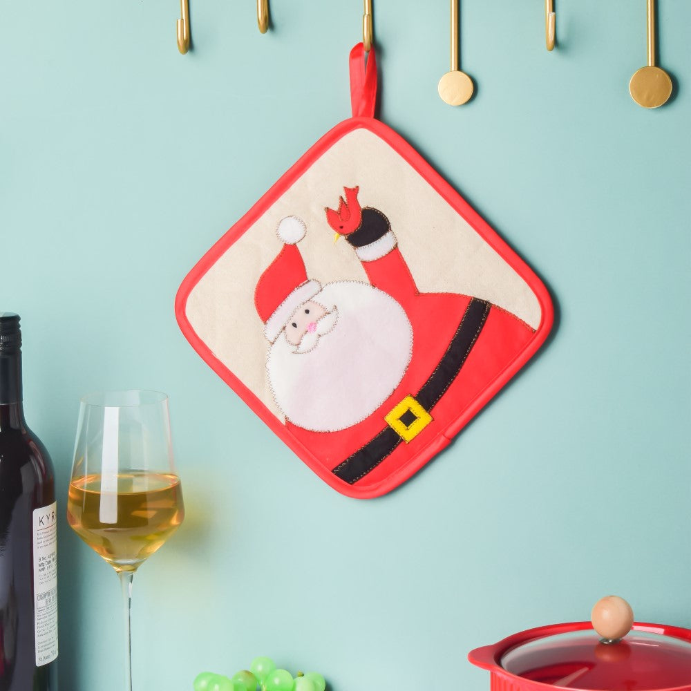 The square cloth trivet is a great addition to any festive cookware collection. The trivet can be used to shield the table and countertops from hot pans or to safely remove hot food from the oven. The trivet is a fun and practical way to bring some festive Xmas happiness into the house over the holiday season. The Santa-themed mat will add a splash of winter cheer to the kitchen in a simple and easy method. The trivet, unlike many other Christmas ornaments, is both attractive and practical!