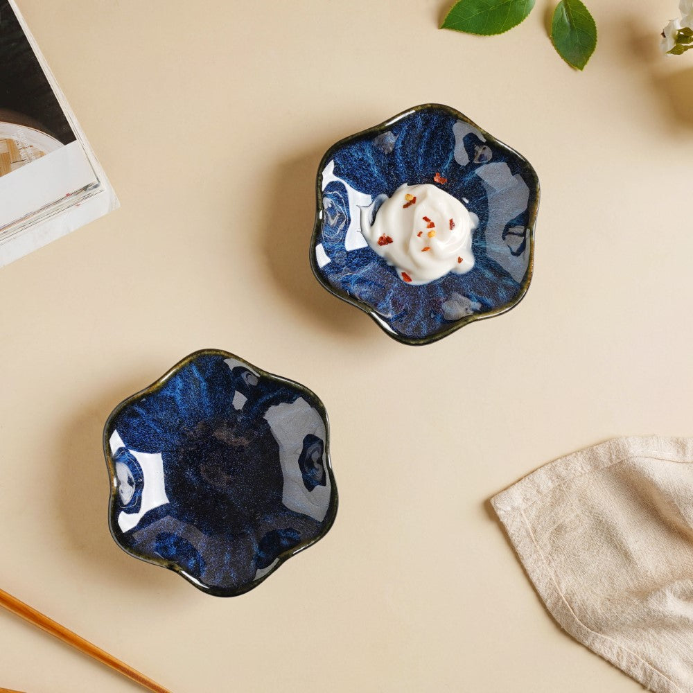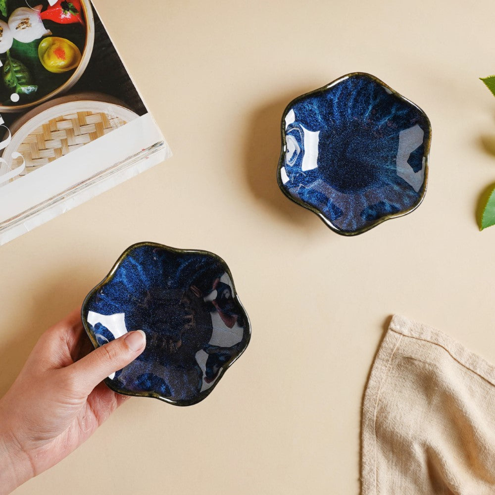 The set of 2 dip bowls has been handcrafted with expertise and features irregular wavy rims and a textured surface. Just like the foamy waves that crash against the shore and retract back to the depth of the ocean, the studio pottery clay bowl features oceanic blue patterns that look soothing and unique in one's crockery collection.