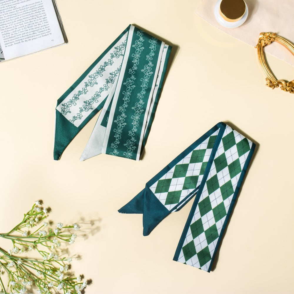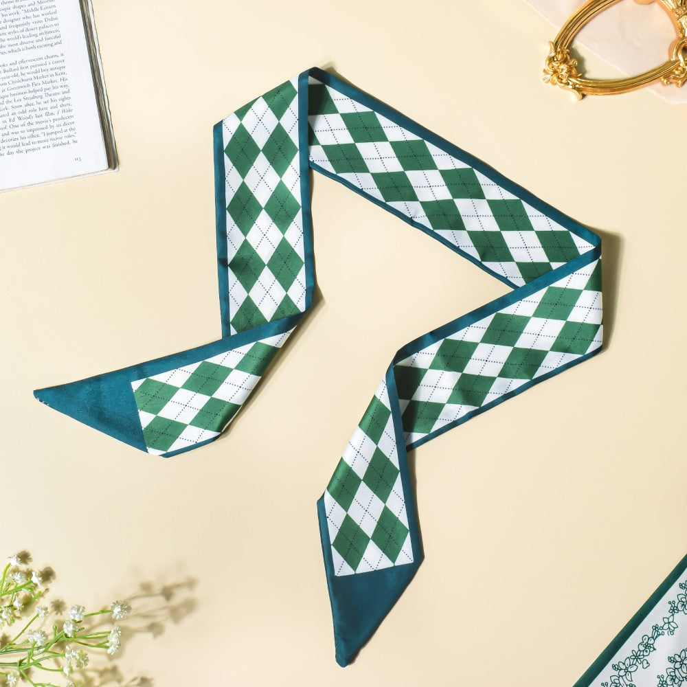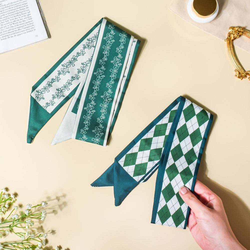 Since the 1990s, twilly scarves have been in style. When worn as a hair band, the satin, silky slim scarves will protect your hair thanks to its high-quality material and the checkered design of green and white. When you leave your house for a party or a routine hangout with friends, the scarf is the ideal accessory to fit the colourful mood since it is made with various patches of vibrant colour. The scarf's versatility enables it to be used as a neckband, matched with braids, or used as a purse accessory.