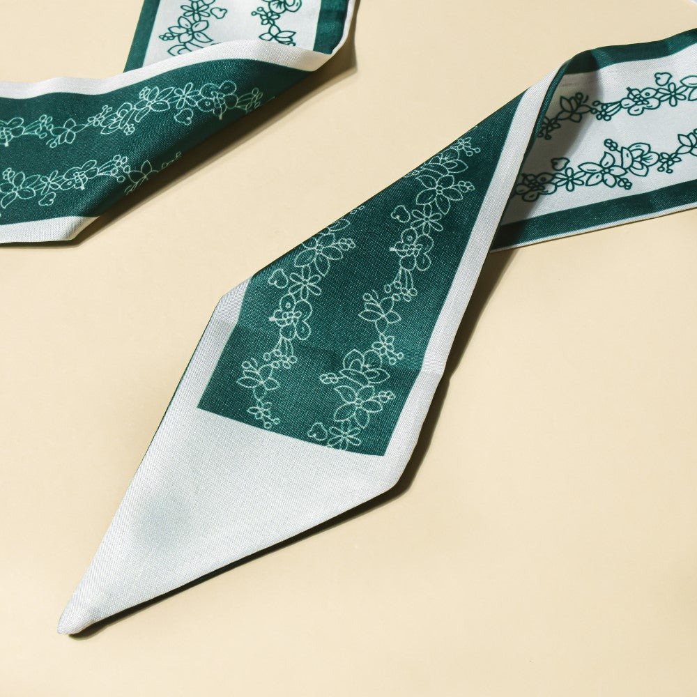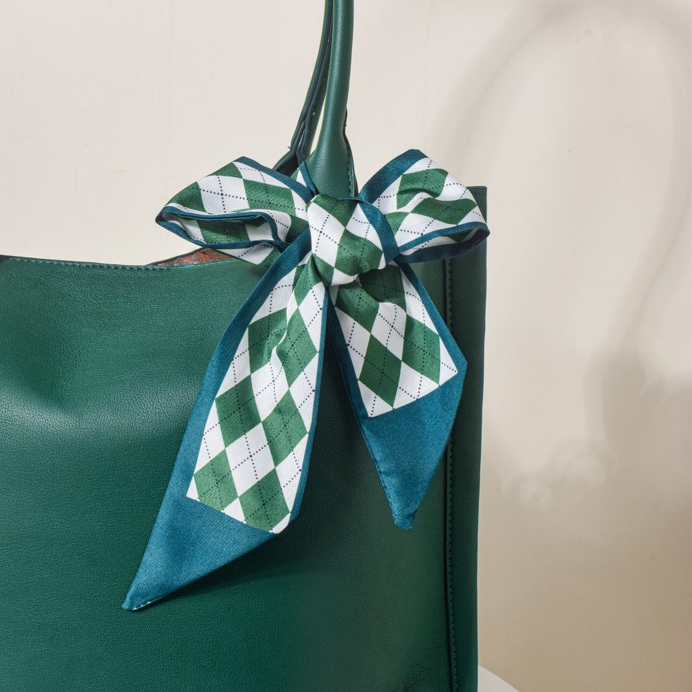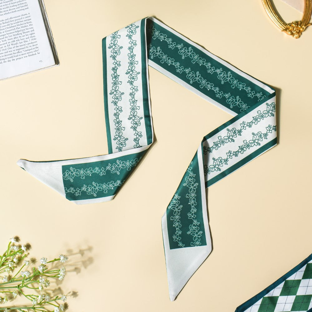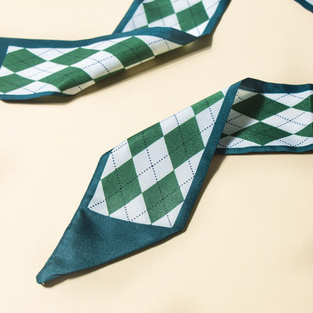 Since the 1990s, twilly scarves have been in style. When worn as a hair band, the satin, silky slim scarves will protect your hair thanks to its high-quality material and the checkered design of green and white. When you leave your house for a party or a routine hangout with friends, the scarf is the ideal accessory to fit the colourful mood since it is made with various patches of vibrant colour. The scarf's versatility enables it to be used as a neckband, matched with braids, or used as a purse accessory.