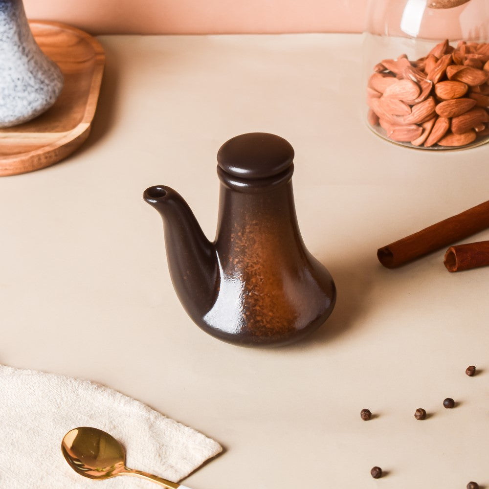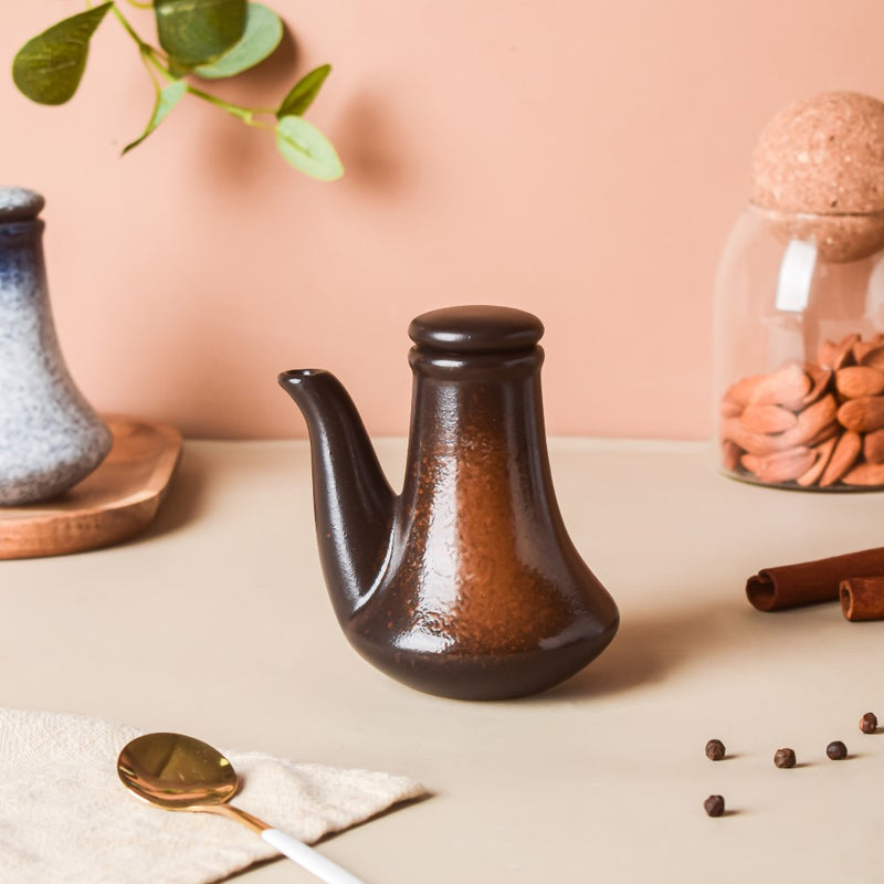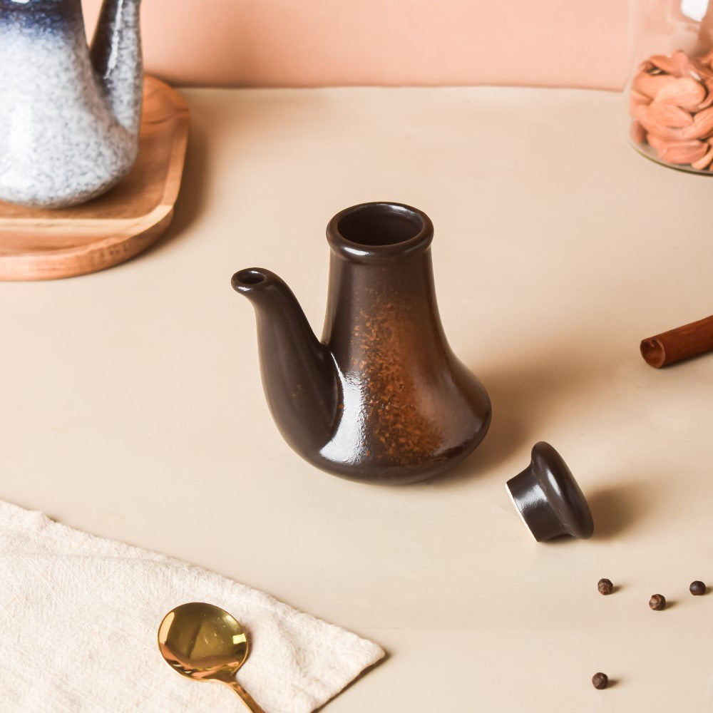 The black and copper stoneware oil pot is an absolute necessity if one's fond of salads. The ceramic oil pot combines style with functionality. The rustic appearance makes it blend seamlessly with other rustic ceramicware. Made of a high-quality ingredient, the hand glazed oil pot has ample space to store oils, sauces, and syrups to drizzle or pour on your delectable food menu of Western as well as Oriental, Asian or Japanese cuisines.