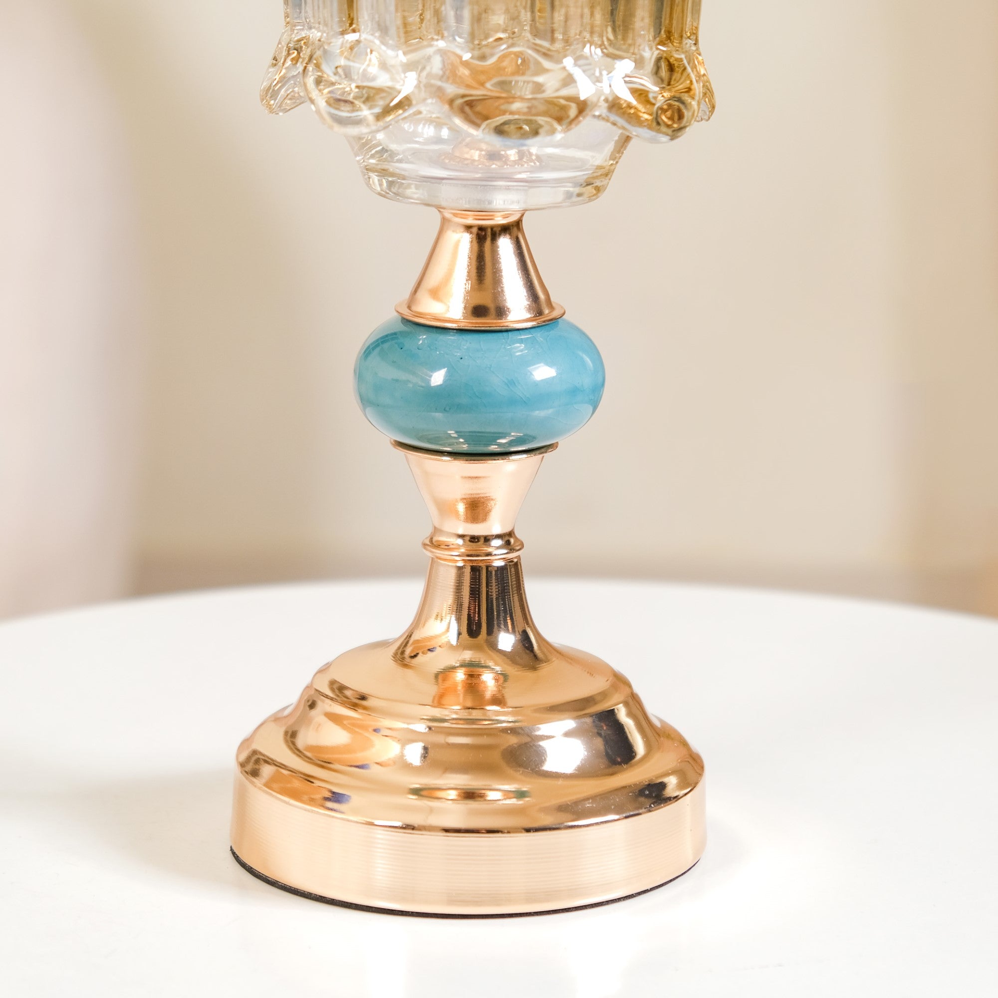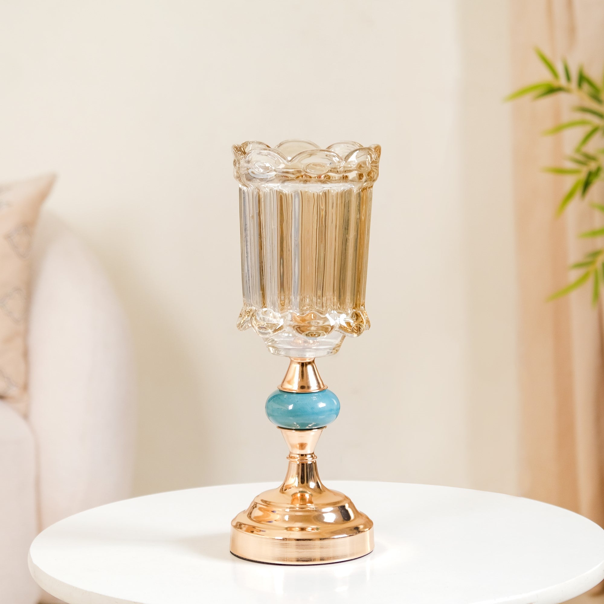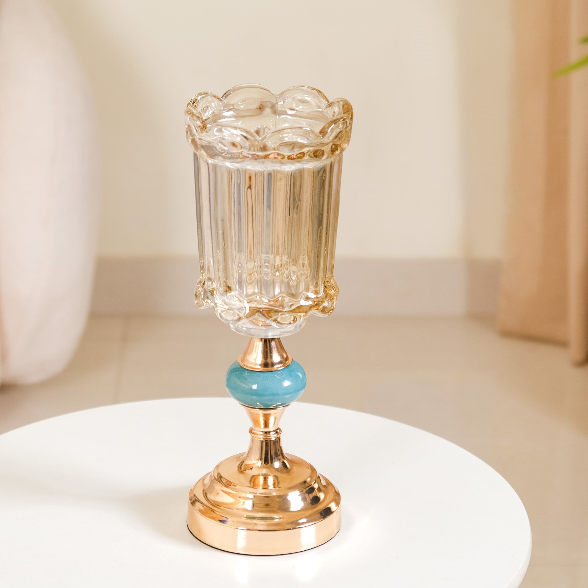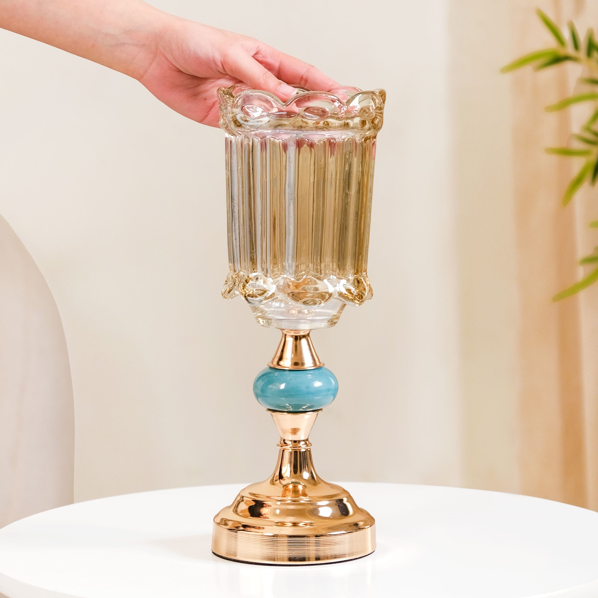 The crystal glass vase is the perfect decor accent to add some luxurious elegance and brightness to your room decor, thanks to its lustrous crystal and metal design. The gold-tinted iridescent crystal glass of the flower vase can beautifully accentuate the bright and vibrant colours of fresh flowers, while the sturdy metal stand offers superb stability no matter where you place the glass vase. The geometric faceted design of the crystal flower vase reflects light in different directions, creating a stunning visual effect for a luxe room design. Place the vase on your mantlepiece or coffee table for a luxurious centrepiece design.