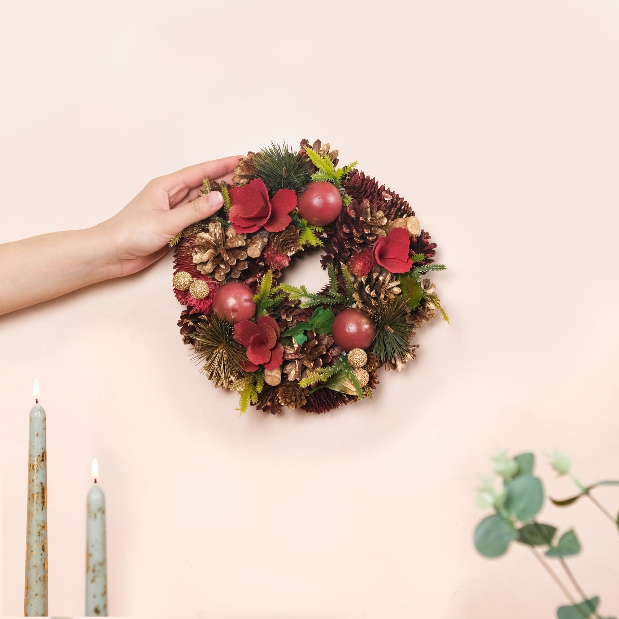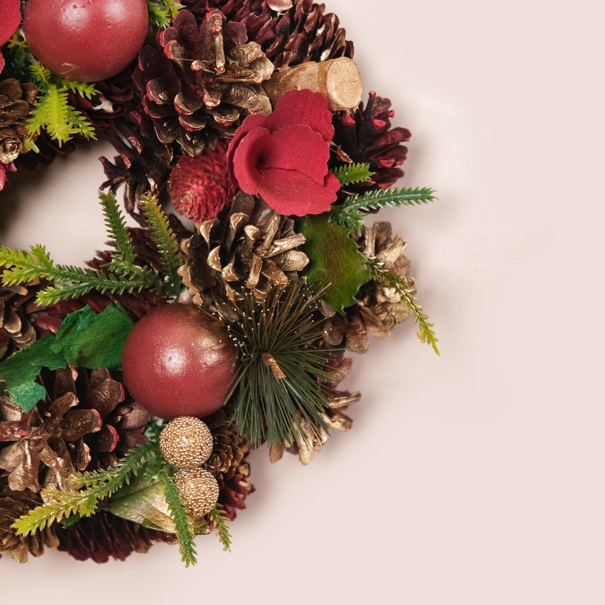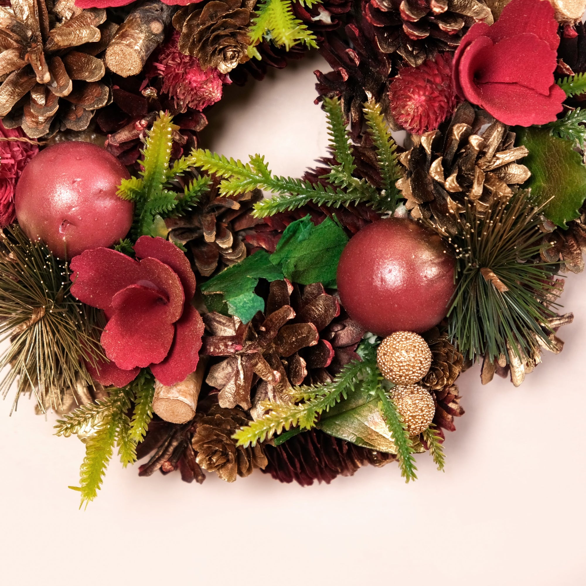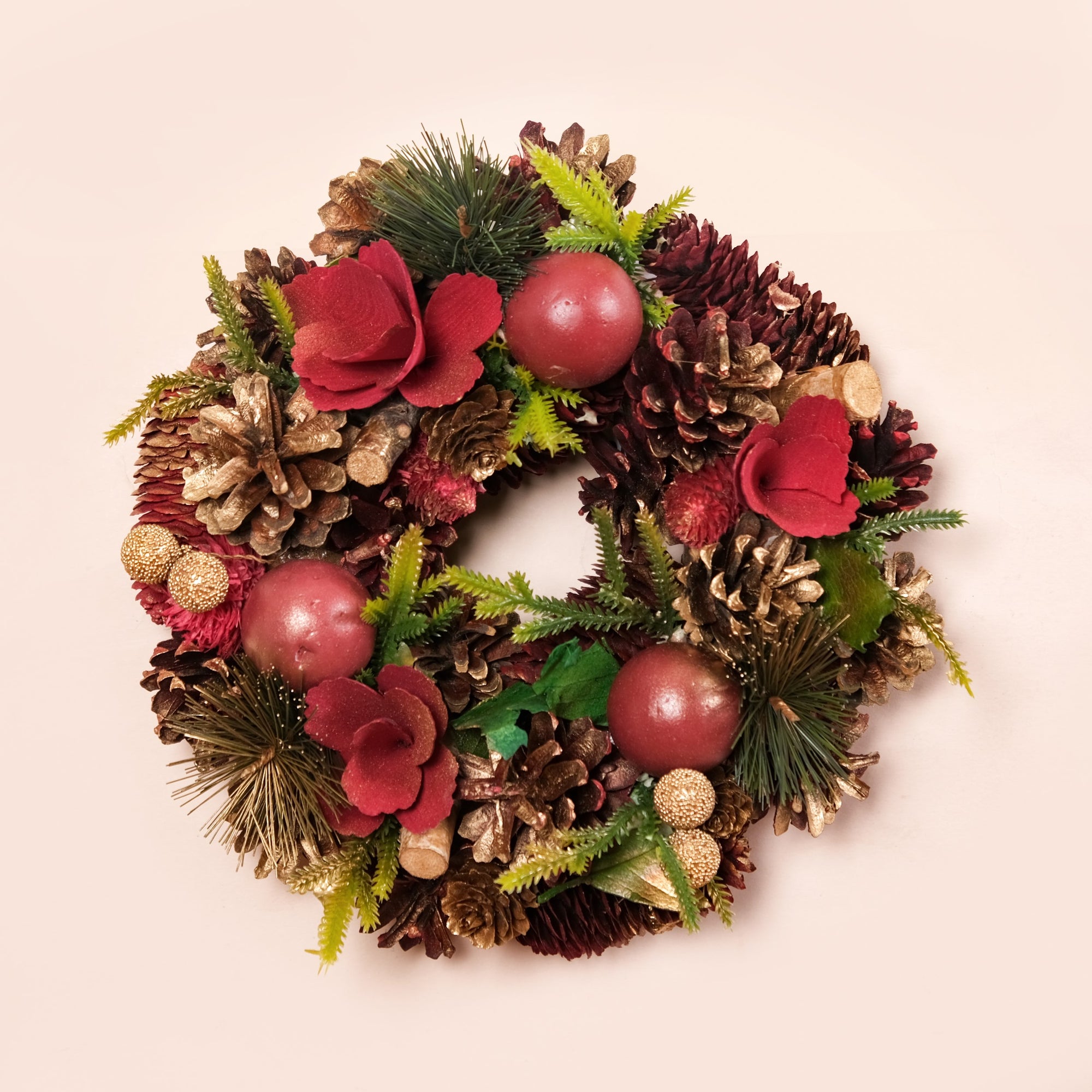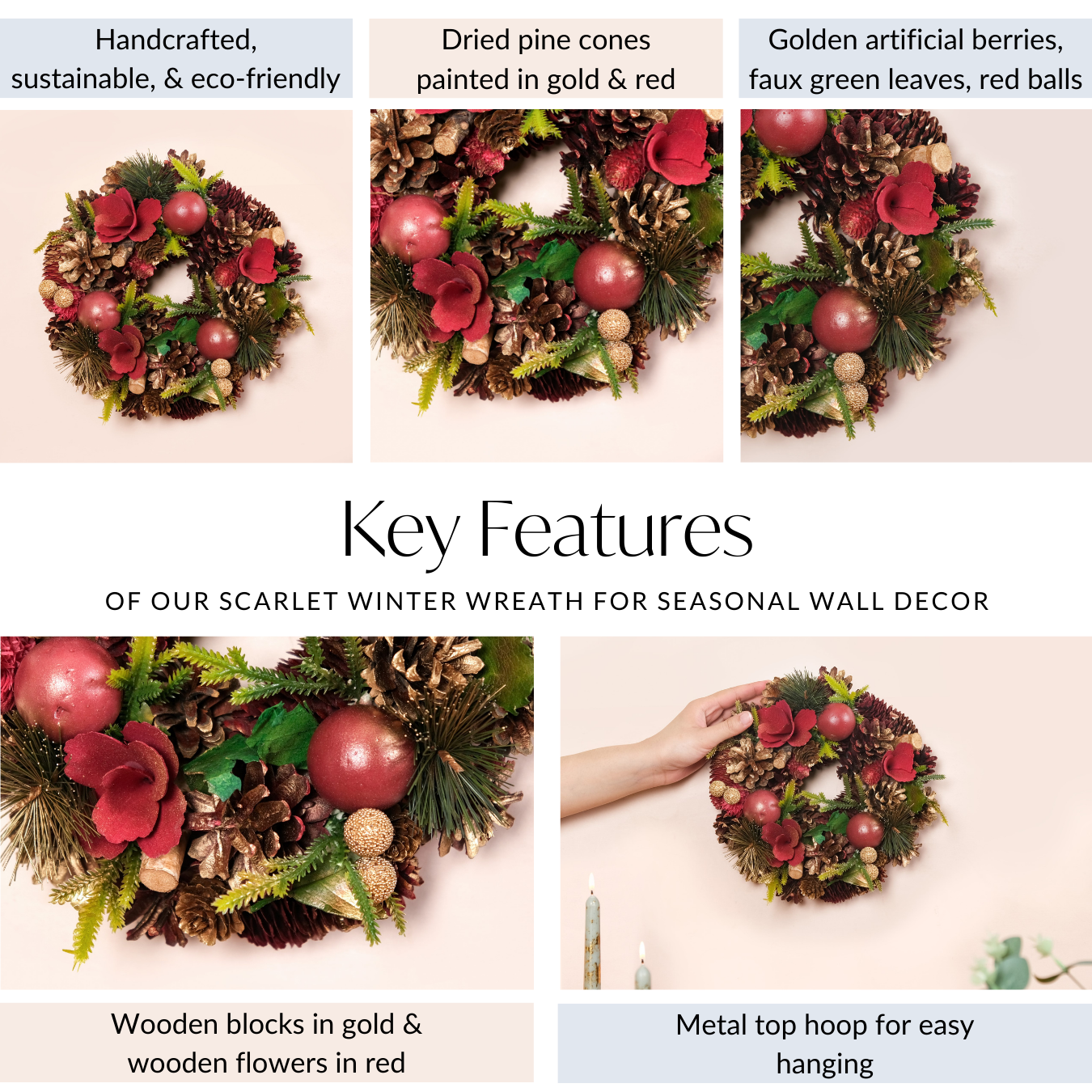 Handcrafted, sustainable, and eco-friendly Dried pine cones painted in gold and red Golden artificial berries, faux green leaves, and red balls Decorative wooden blocks in gold and wooden flowers in red Wooden back frame for long-lasting durability Metal top hoop for easy hanging
