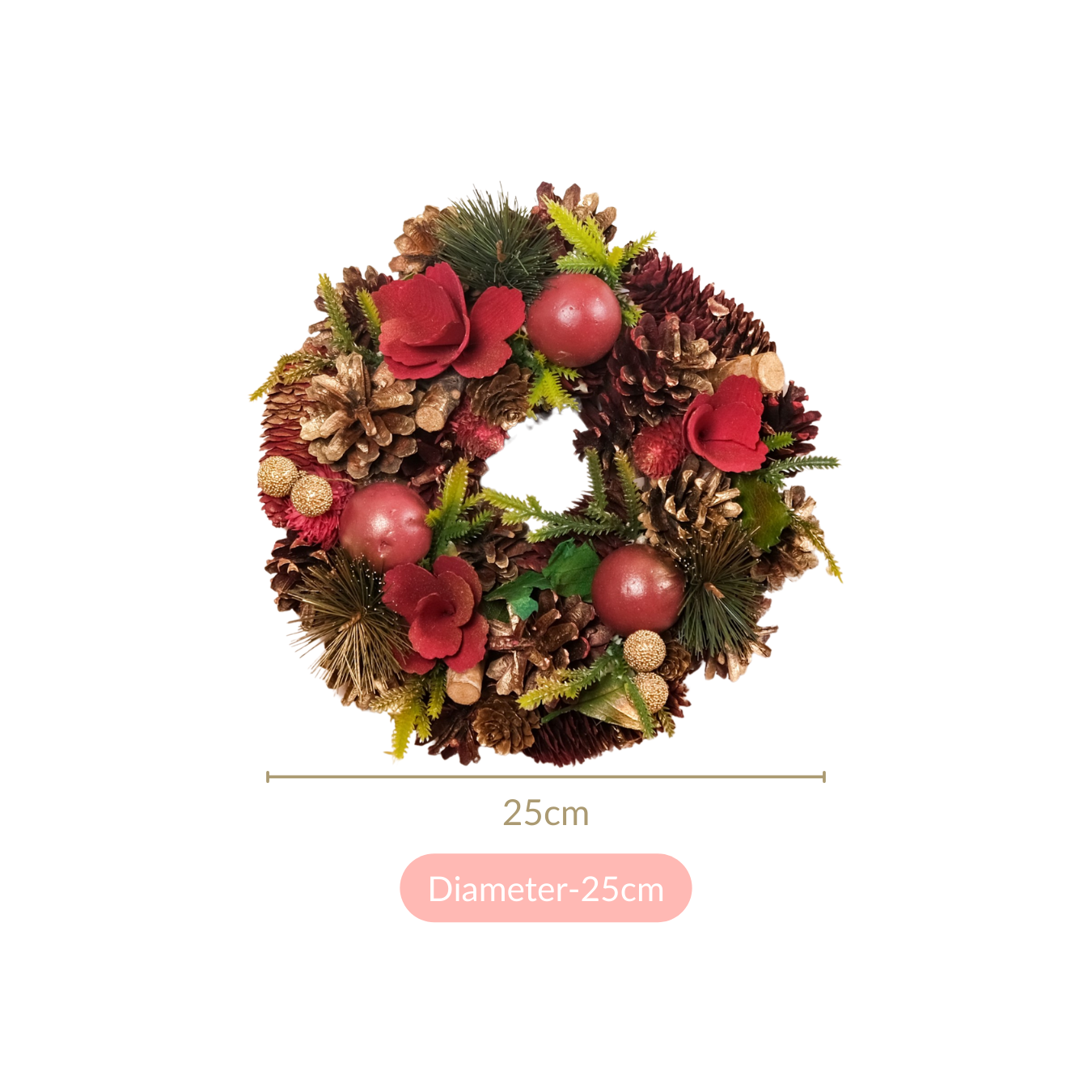 Size: 25cm D Colour: Gold, red, green Material: Dried pine cones, wood, PVC