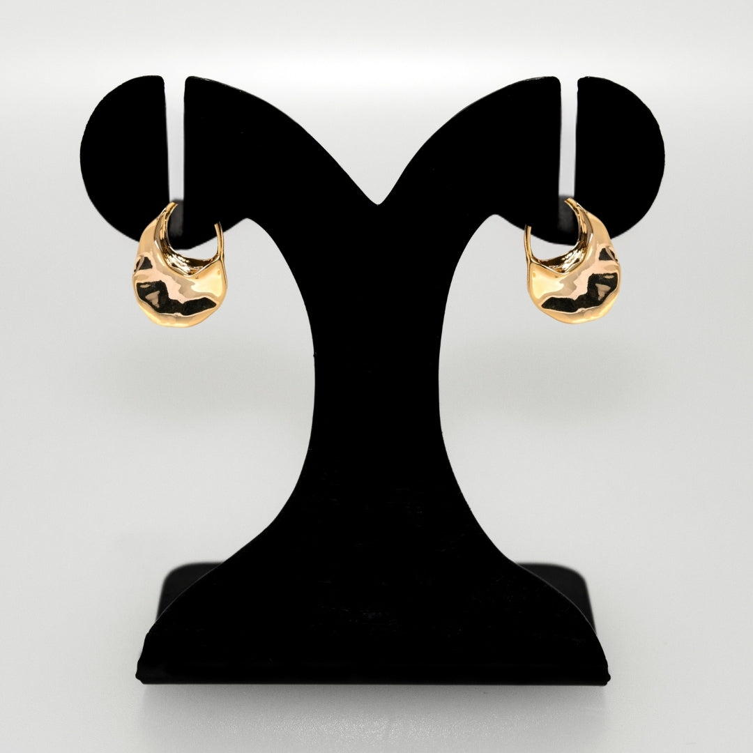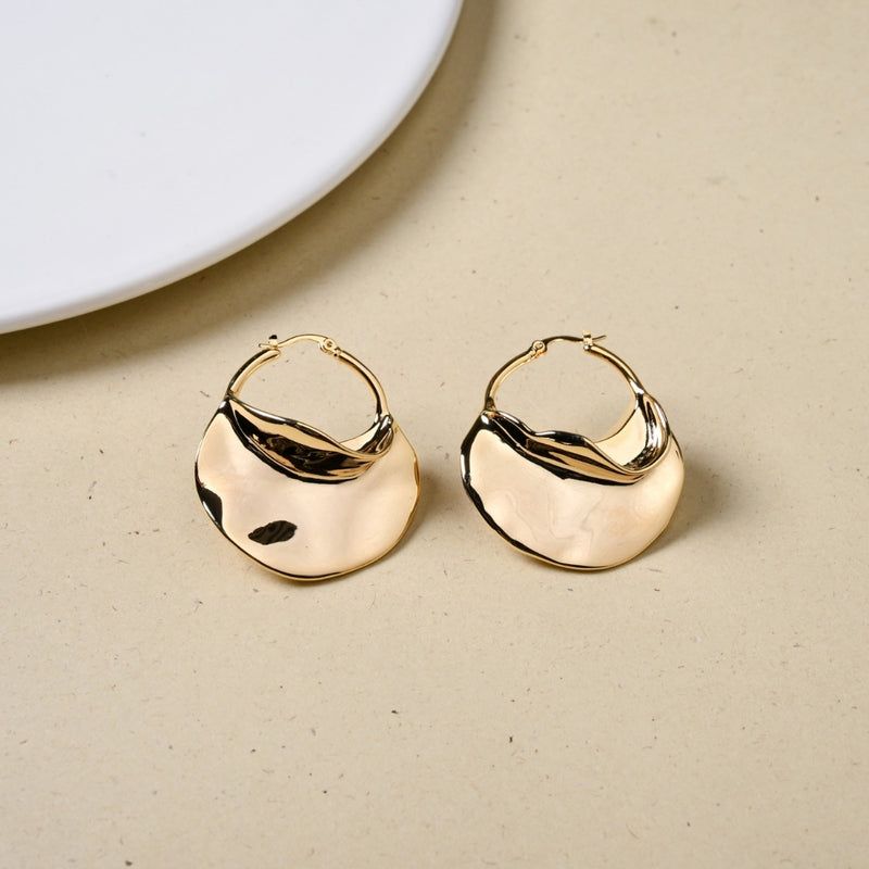 A balancing act between form and function, these hoop earrings know how to make heads turn. Inspired by the allure of sculpted and organic forms, they are crafted to seamlessly conform to the natural curves of your style. The gold-tone hoops feature a gracefully abstract sculpted arc at the bottom, lending them a modern yet timeless appeal. Perfect for those who appreciate the beauty of art in everyday wear, these earrings effortlessly elevate any look with their unique charm.