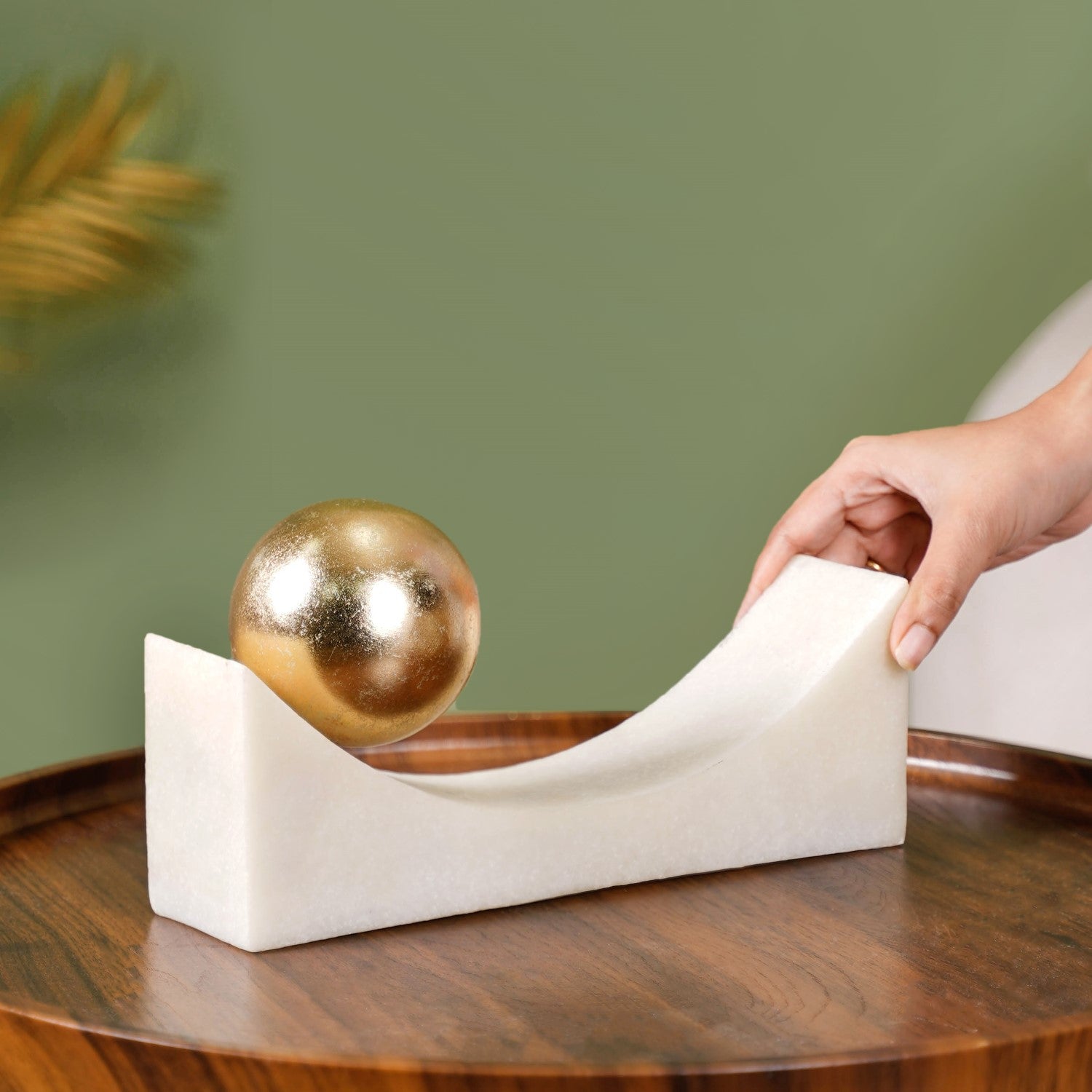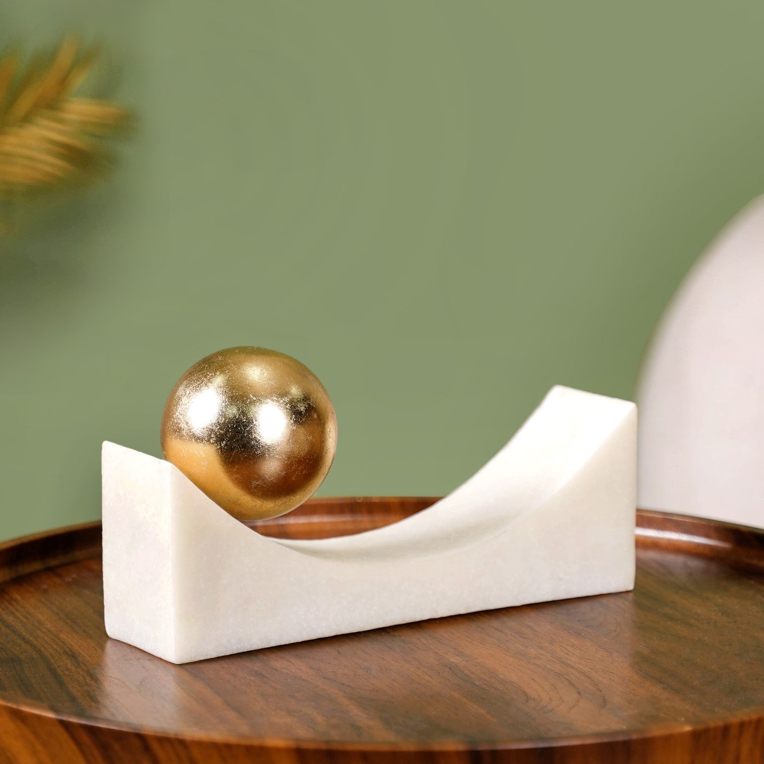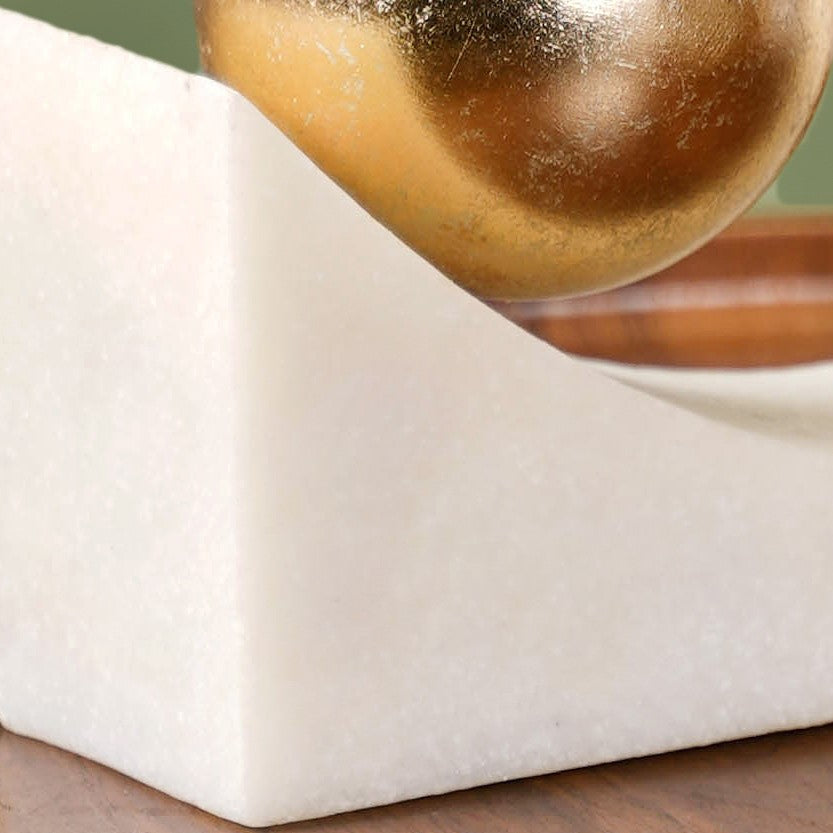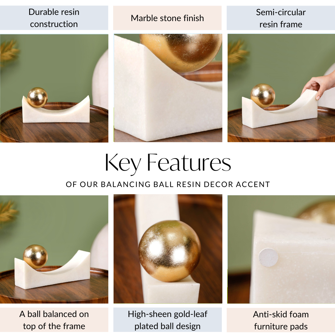 Design: Crafted from tough resin and decked out with a cool marble stone finish, this piece rocks a semi-circular frame that’s totally on-trend. Perched on top is a golden balancing ball, shimmering with opulence. Its modern art-inspired design merges elegance with a playful twist, making it a striking addition to any space.