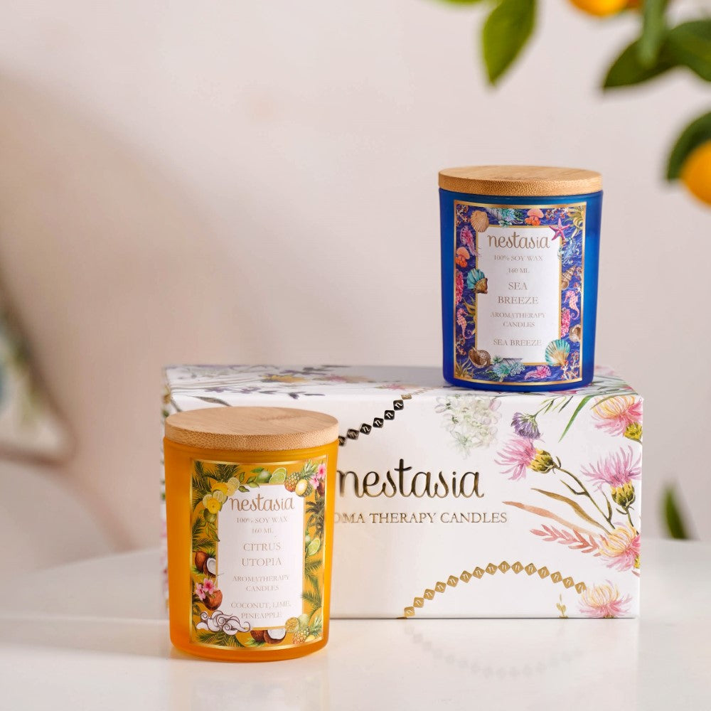 There is something about scented candles that adds a special aromatic touch to your home decor, whether it is the warmth they give to the décor or the unadulterated elegance they exude. Our hand-poured soy wax scented candle jars are infused with fragrant essential oils and a cotton wick. The crisp aroma of the sea breeze and the refreshing fragrance of citrusy elements will take you on a rejuvenating and relaxing aromatic journey. The scented candles gift set is also ideal for gifting on special occasions.