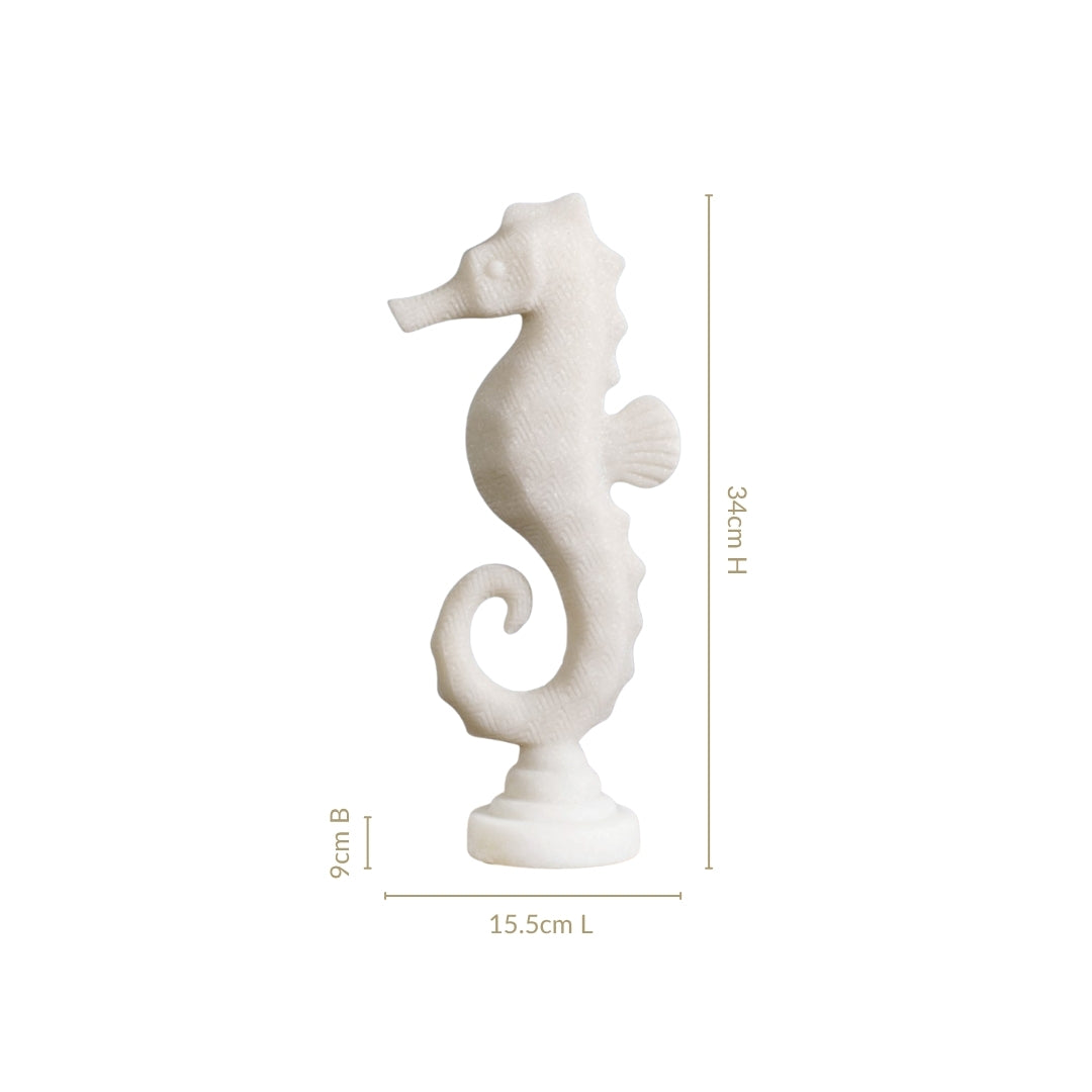 Design: This exquisite seahorse decor piece is crafted from high-quality resin, sculpted in a smooth, ivory-white finish with subtle geometric texturing across its surface. Standing gracefully upright on a rounded pedestal base, it captures the seahorse’s distinct curled tail, elongated snout, and elegant crest. The minimalist design highlights fine curves and contours, giving it a sophisticated yet coastal charm that blends effortlessly with contemporary or beach-themed interiors.