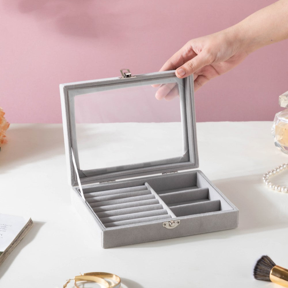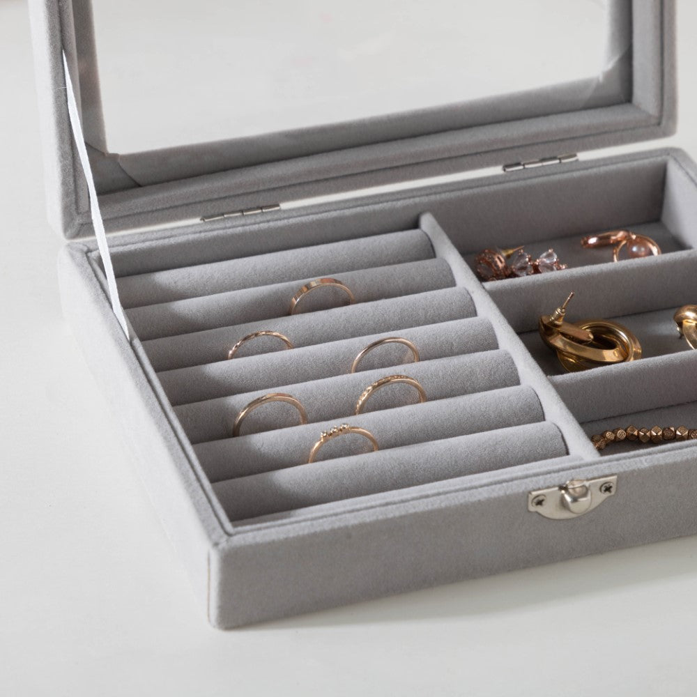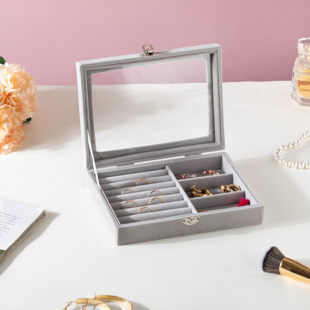 While travelling, keep all of your jewellery and accessories safe and sound. Carrying earrings, necklaces, and rings is easy with the modern grey jewellery organiser. The roomy design of this multi-sectioned click-lock box allows you to keep your accessories organised and quickly look for what you need. The medium-sized storage box offers plenty of compartments for storing your priceless valuables, including 3 square cavities, and 1 large ring/trinket holder. With minimum clutter and loss, the grey jewellery organiser keeps your dazzling stuff tidy whether you're at home or on the go. Features: -Premium quality -Crafted with elegance -Transparent cover -Easy click lock system -3 square cavities -1 large cushioned ring holder -1 strap attached to keep the lid open -Best for gifting or organising jewellery, trinkets, rings, bracelets and other accessories Nestip: The jewellery box can be filled with sparkling ornaments and showcased on a coffee table. Size: 20cm L x 15m B x 4.5cm H Colour: Grey Material: PVC, velvet Products included: 1 jewellery organiser Style: HPA146B07