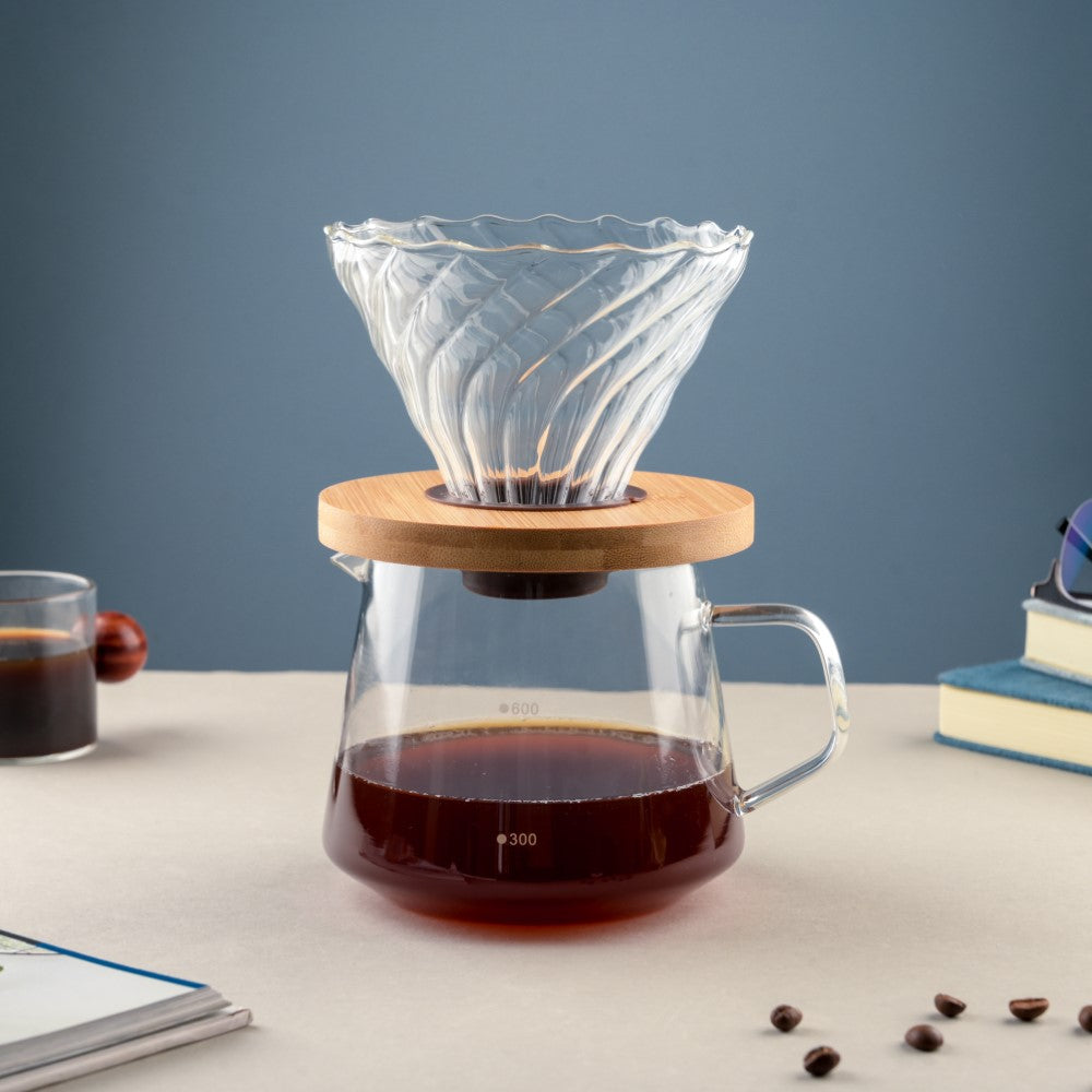 The hand-brewed coffee pot comes with a V60 glass filter on the top to make the perfect cup of coffee. Enjoy a seamless coffee brewing experience with the textured coffee filter which comes with a wooden base. One can gift the manual coffee filter to a coffee enthusiast.
