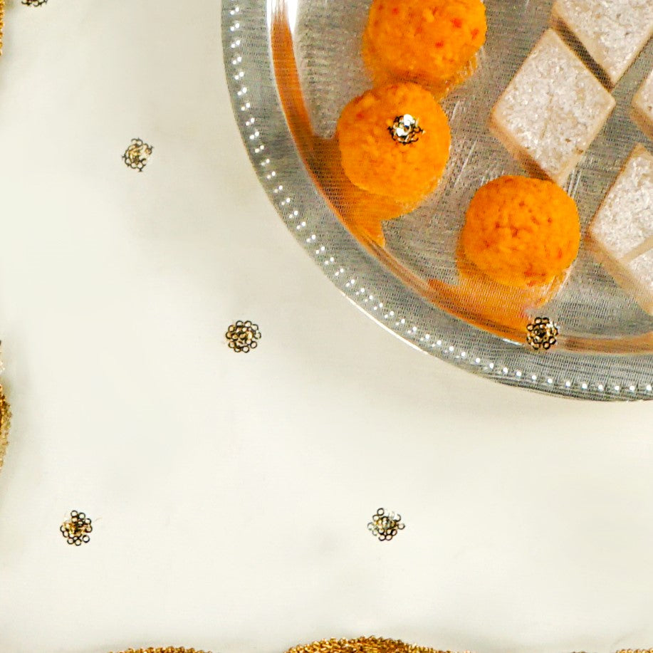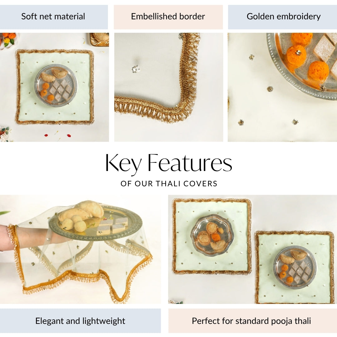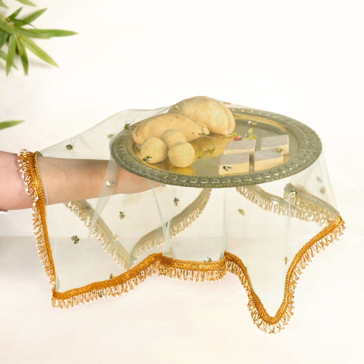 Benefits: The sheer net fabric protects thali contents from dust without hiding them. The square shape offers full coverage for most standard shagun thali sizes. The weighted lace with pearls and beads keeps the cover in place. Foldable and compact, they are easy to store. Durable stitching makes them reusable for poojas, gifting, or weddings throughout the year.