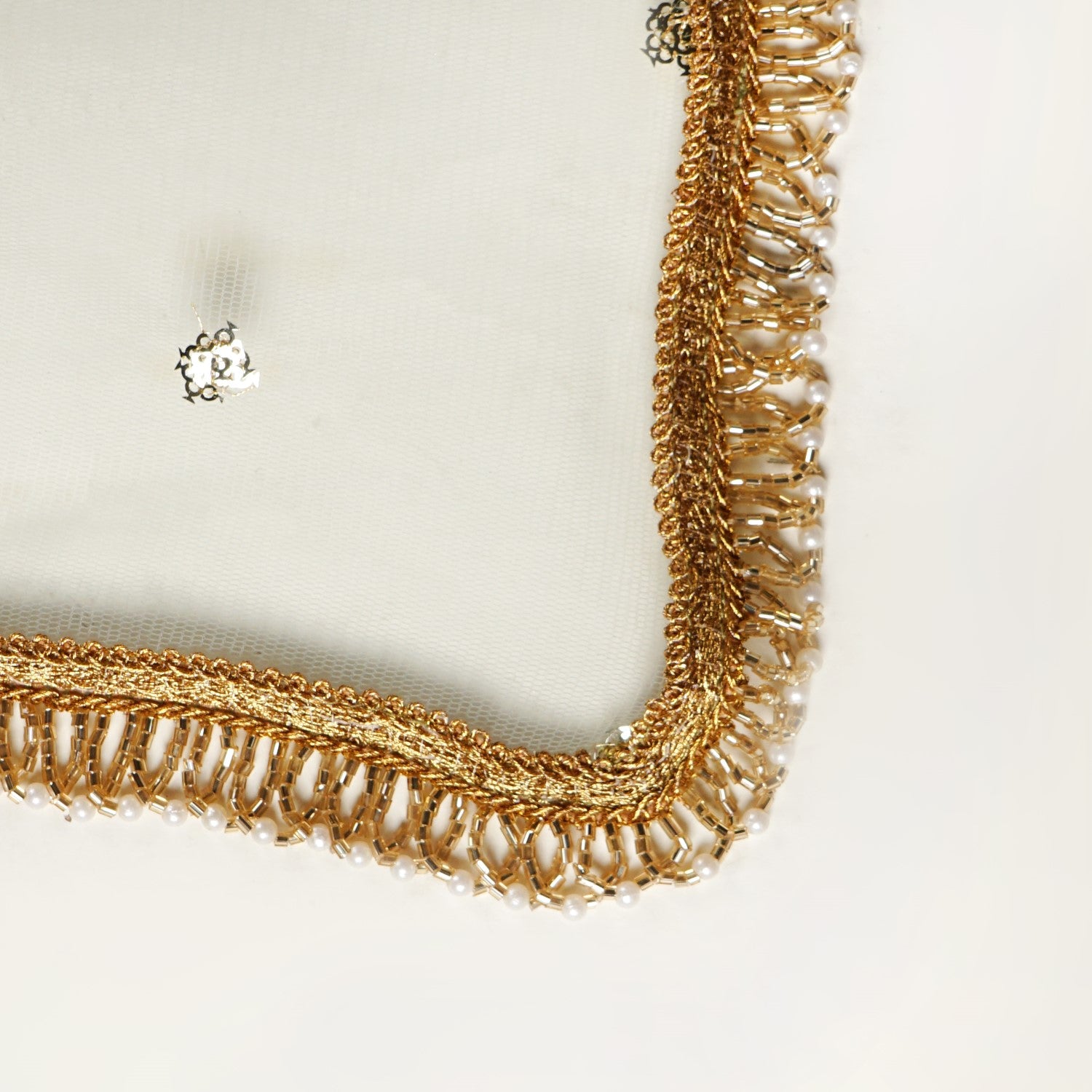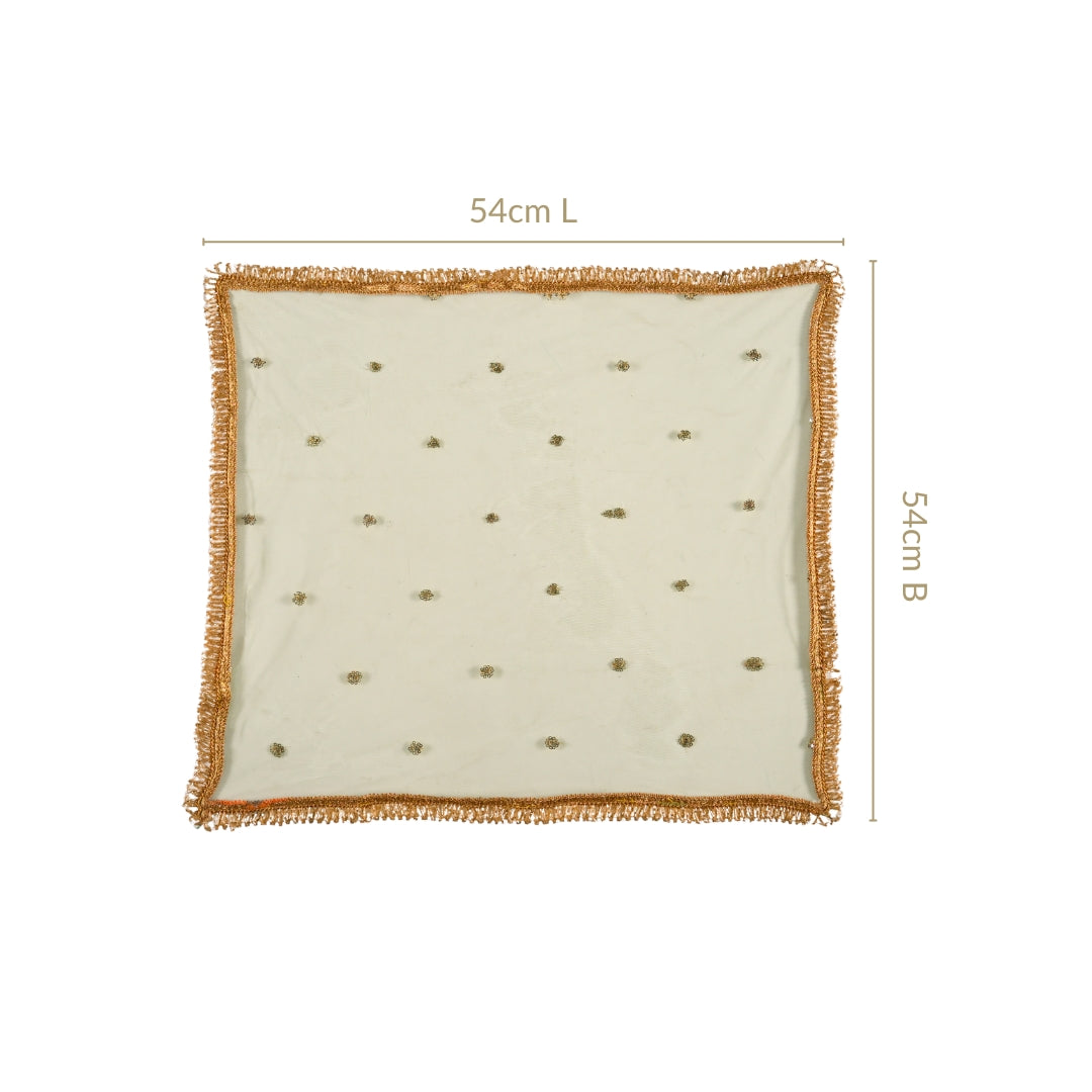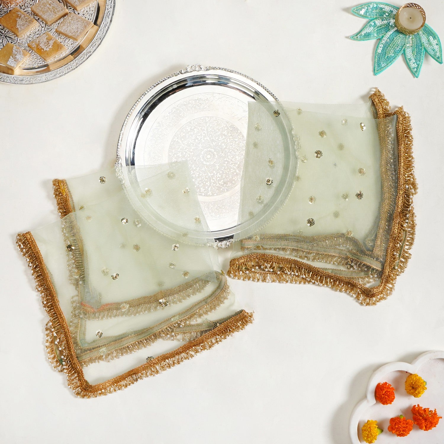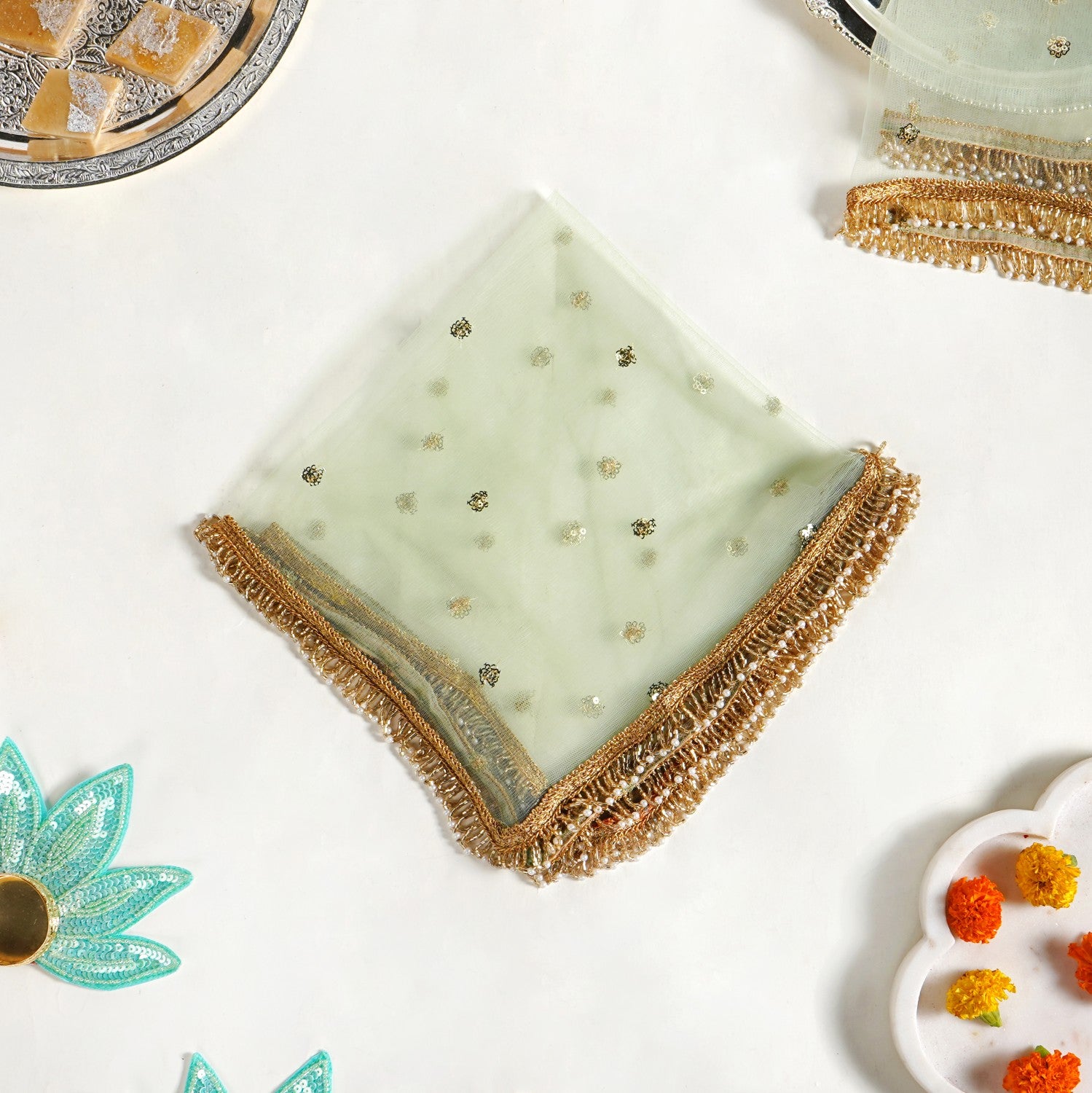 Design: Crafted from sheer sage green net fabric, each cover features scattered gold sequin embroidery across the square surface. A broad gold lace frames the edges with dense threadwork detailing. The borders are finished with looped golden beads and delicate pearl drops, adding weight and structure. Soft and lightweight to the touch, the covers have flowing edges and a semi-transparent surface. Sold as a coordinated set of two, they create a neat and balanced ceremonial setup.