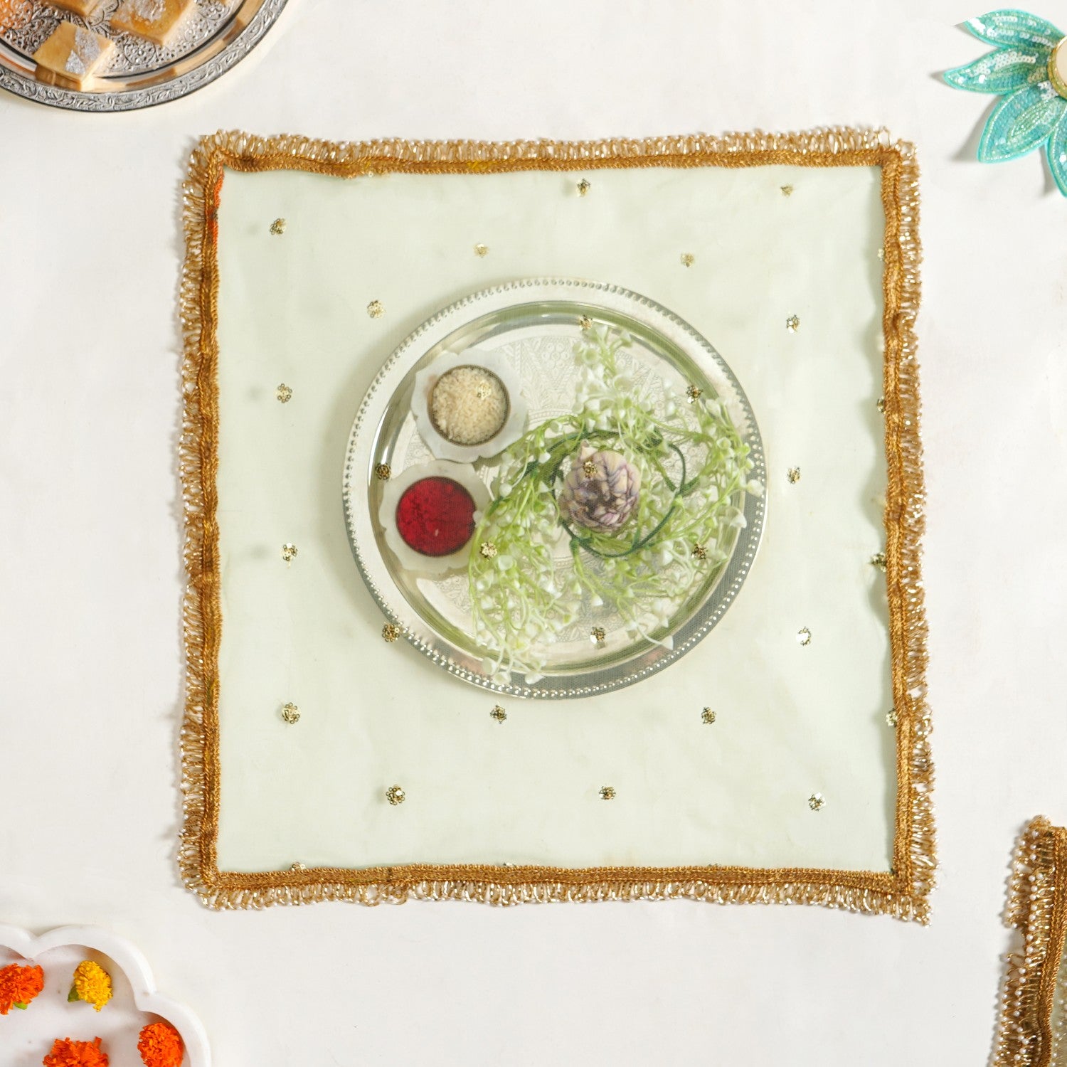 Gifting or praying, this pooja thali cover set adds polish to every ritual. The sage green tone, gold sequins and pearl fringe give your shagun thali for wedding a festive flair. Functional, foldable and pretty to display, this thali cover set is your new puja essential.