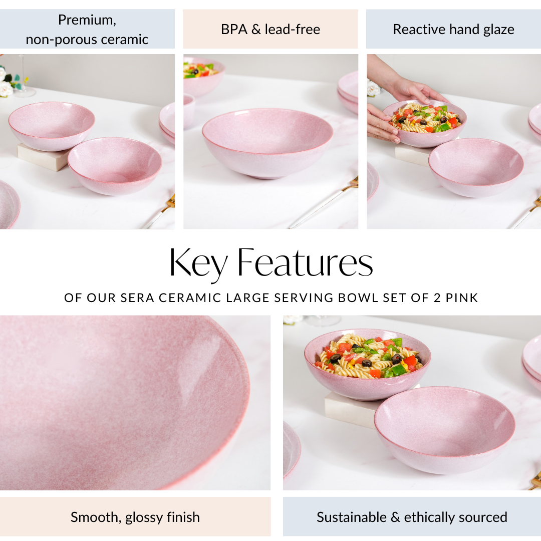 Design: Each ceramic serving bowl features a classic round shape with a captivating pink hue that brings a touch of sophistication to your table setting. The sleek, smooth curves paired with the ergonomic design make it a must-have for your dinner table.