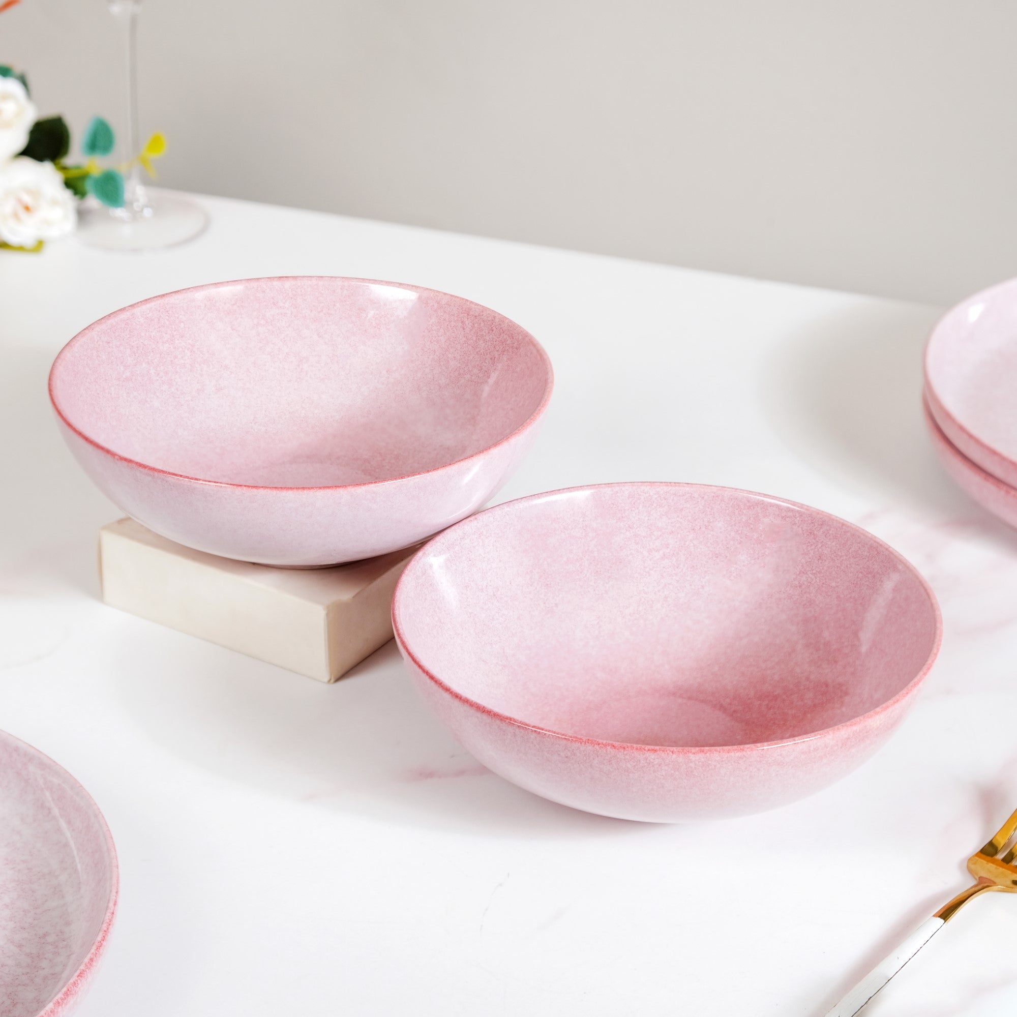 Design: The ceramic dinner set stands out with its stoneware-inspired design, giving each piece a handcrafted feel. The smooth gloss finish and the reactive hand-glazed surface create a stunning visual appeal, ensuring that no two pieces are exactly alike. The soft pastel pink colour scheme brings warmth and sophistication to your table, while the minimalist, yet stylish design works effortlessly with any table setting, whether casual or formal. The simple, clean lines of each piece make it a versatile addition to your home, suitable for both everyday meals and special occasions.