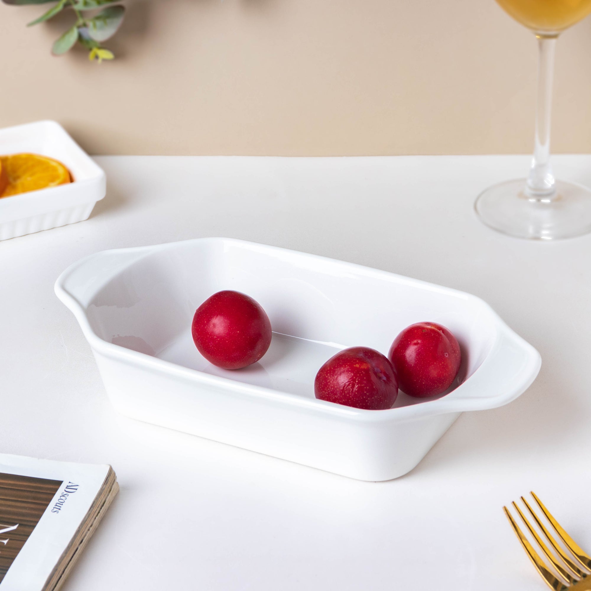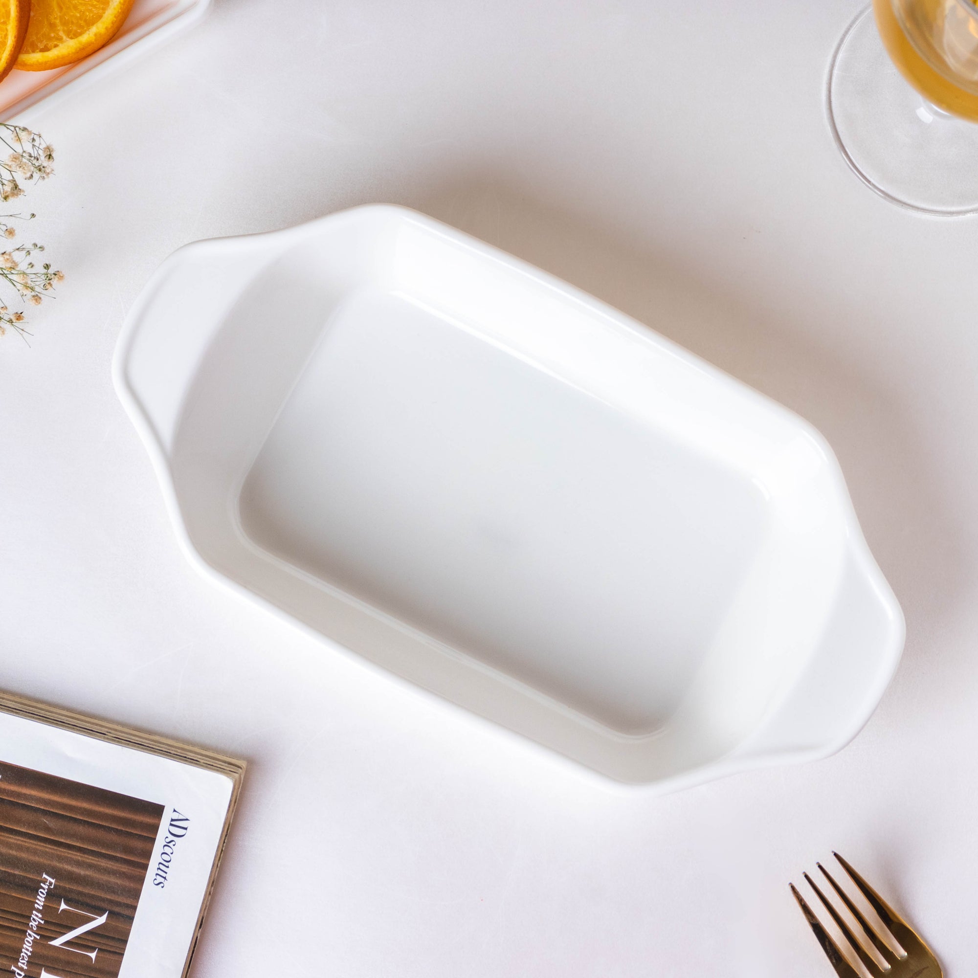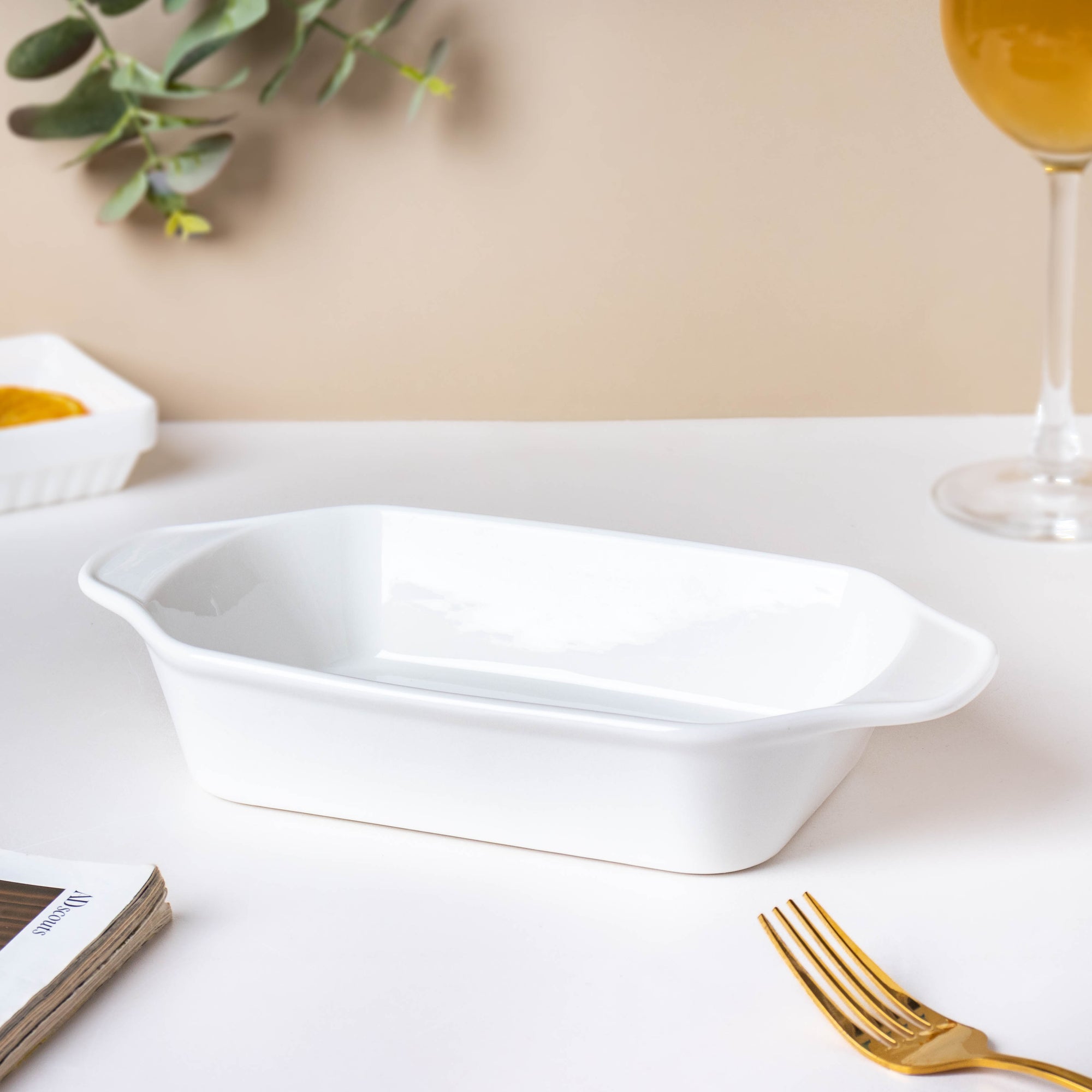The ceramic serving platter is rectangular in shape and white in color. The platter may also be used as a baking tray to bake and serve delicious snacks, be it cookies and biscuits or cakes and pies. The platter may also be used to present a variety of dishes on the table ranging from kebabs to sushis, or a variety of fries and fritters during an evening tea party. Nestip: Bake and serve cheesy pasta on the ceramic baking dish. Size: 25cm L x 13cm B x 4.5cm H Color: White Material: Ceramic Products included: 1 baking plate Style: MUYU99T49