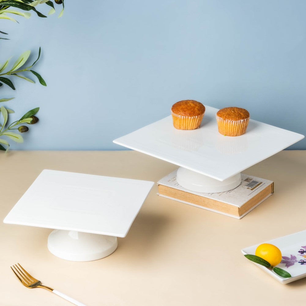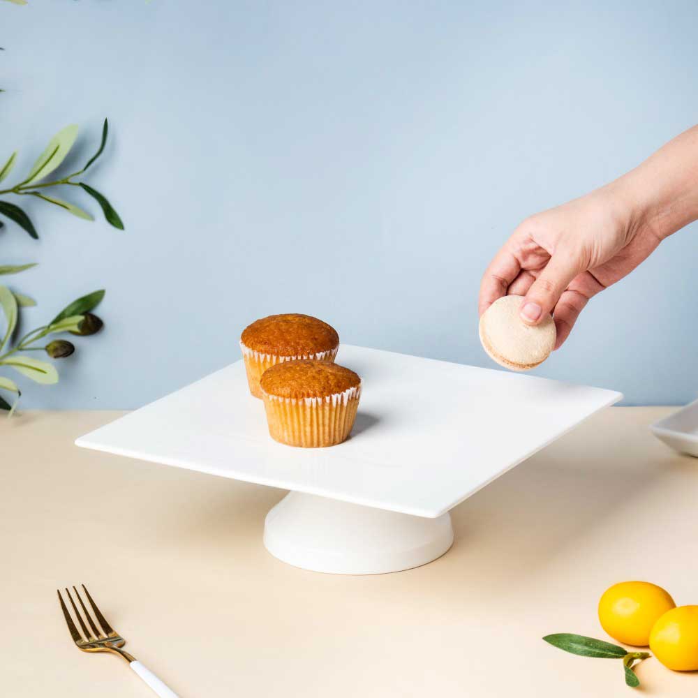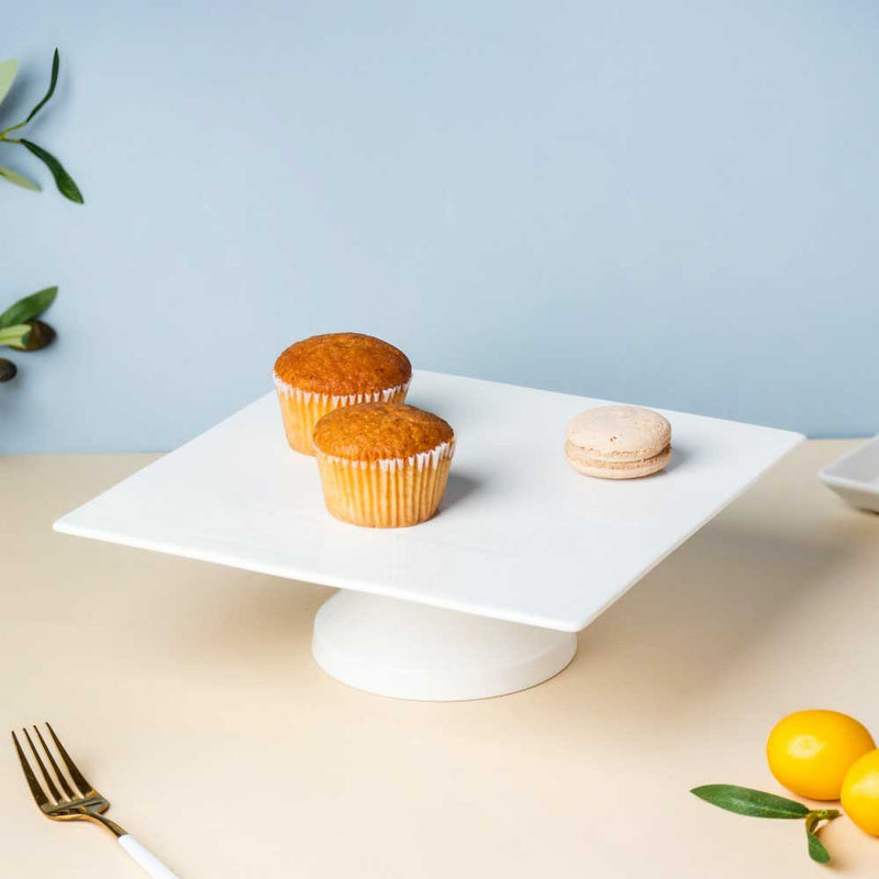 The white cake stand made of ceramic comprises a stark white square platter with that features a smooth glaze and a cylindrical stand. The ceramic cake stand can be used to serve sweet and savoury foods like cake and pastries. The stark white ceramic stand enhances the appearance of the dining table and serves visitors in a beautiful and stylish manner. The cake stand highlights the dish served on the glazed ceramic display stand and makes for an easy serving option. The cake stand comes as 2 different components (the plate and the pedestal base) which needs to be assembled with the given glue to form the complete cake stand.