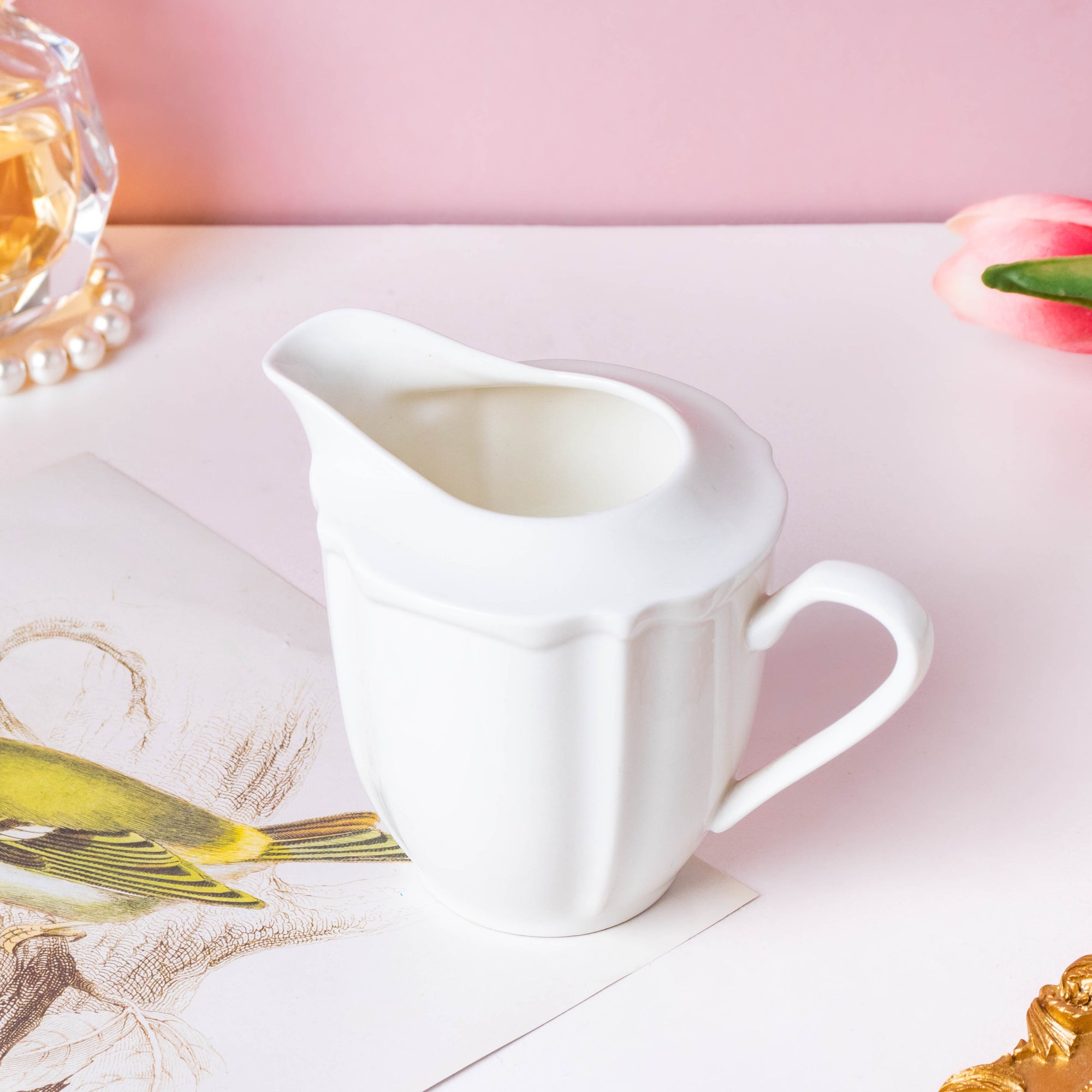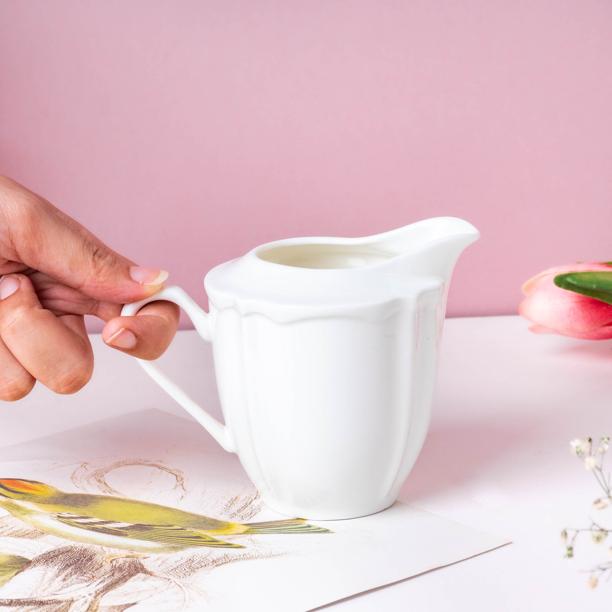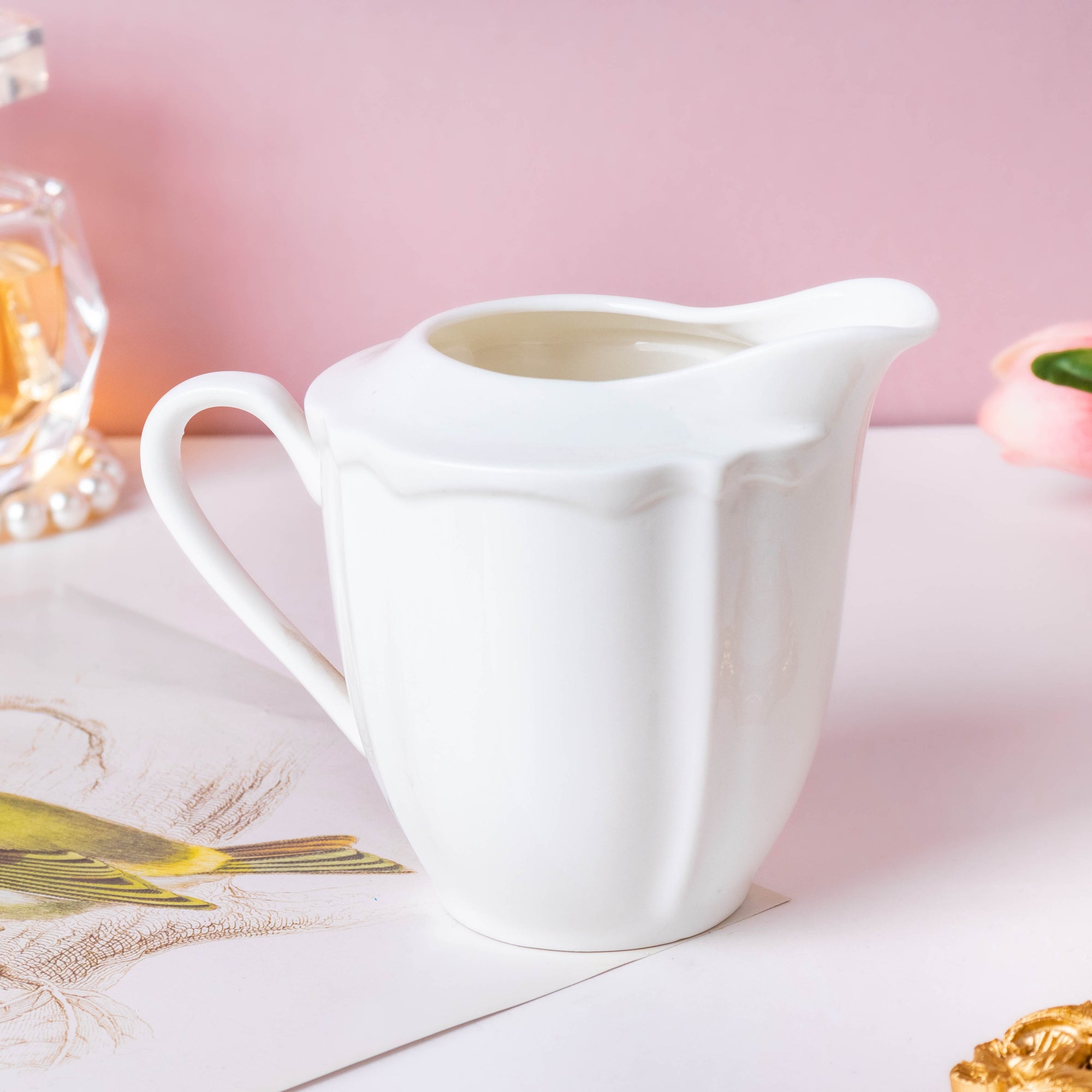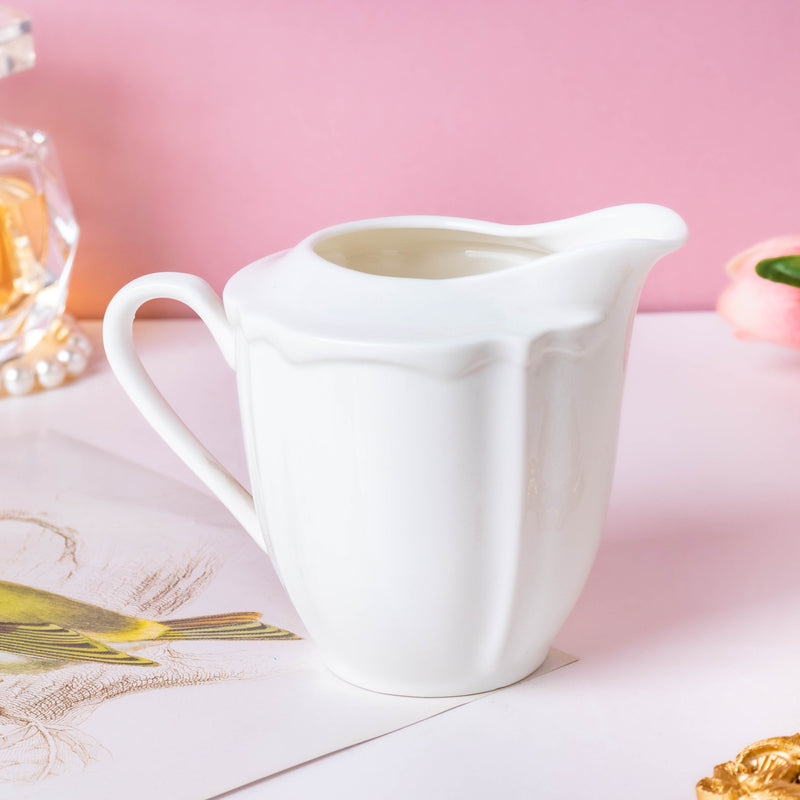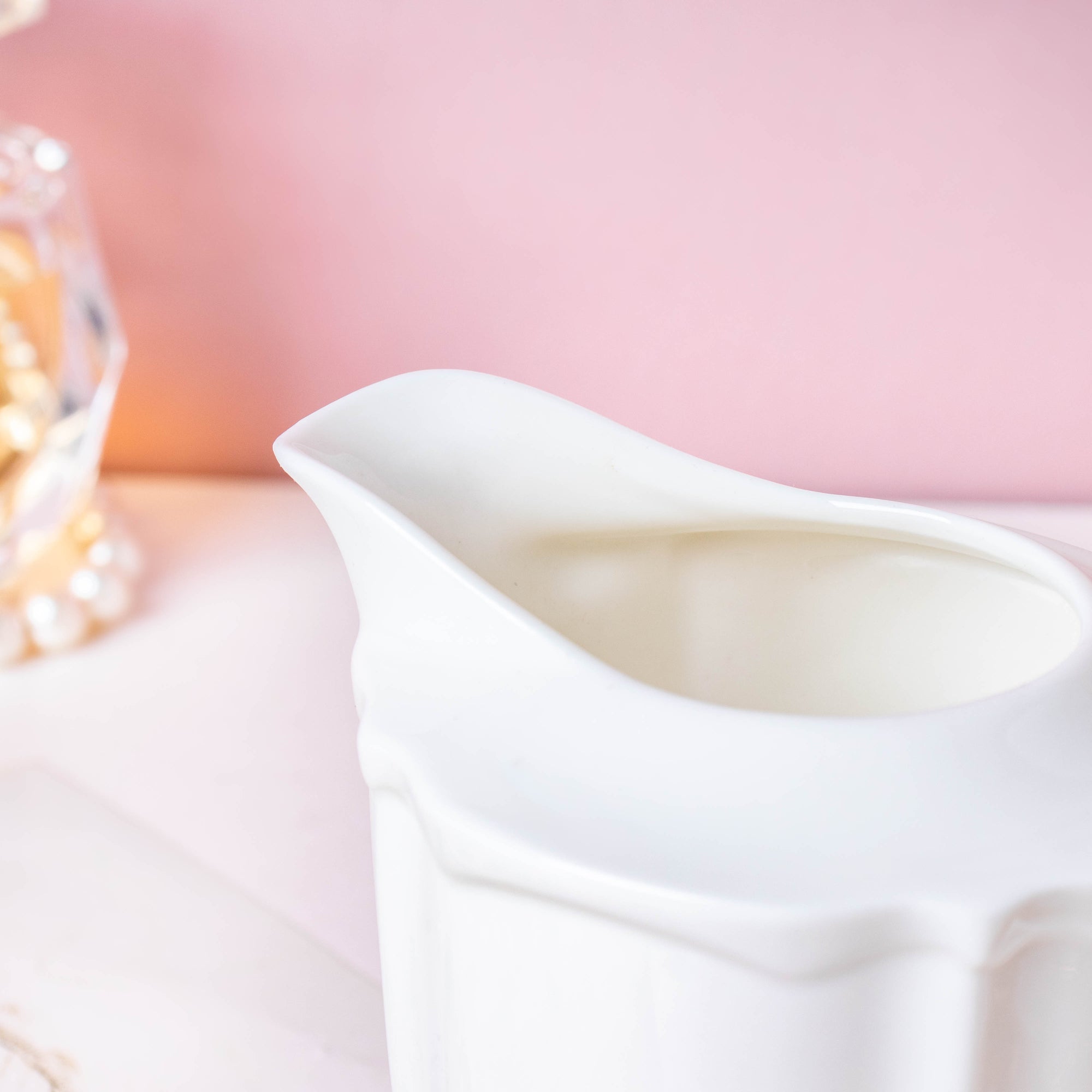 The ceramic milk pot is a highly elegant addition to the tableware collection. The milk pot features a white monochromatic surface which will blend in with a cup and saucer set of white and pastel hues. The classic white color of the pot is ideal for daily use and can also be used to pour milk into the delicately brewed tea during formal get-togethers
