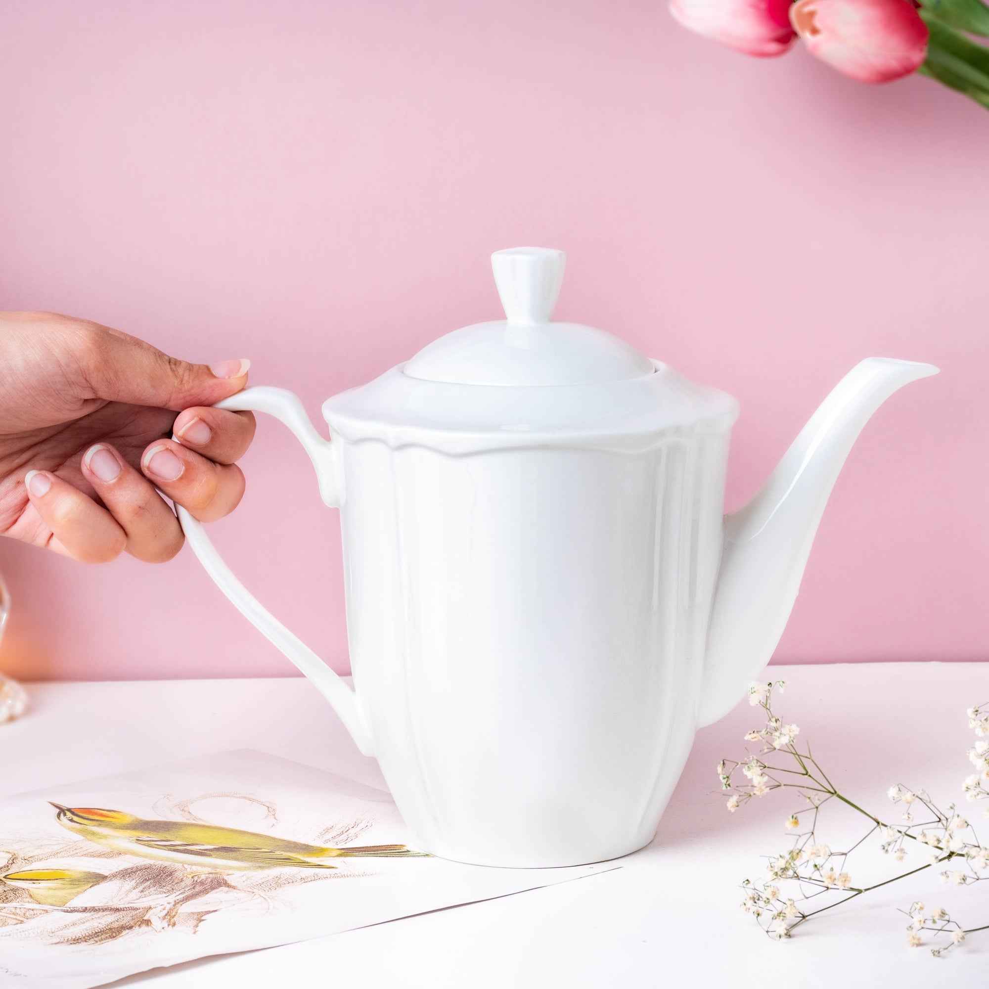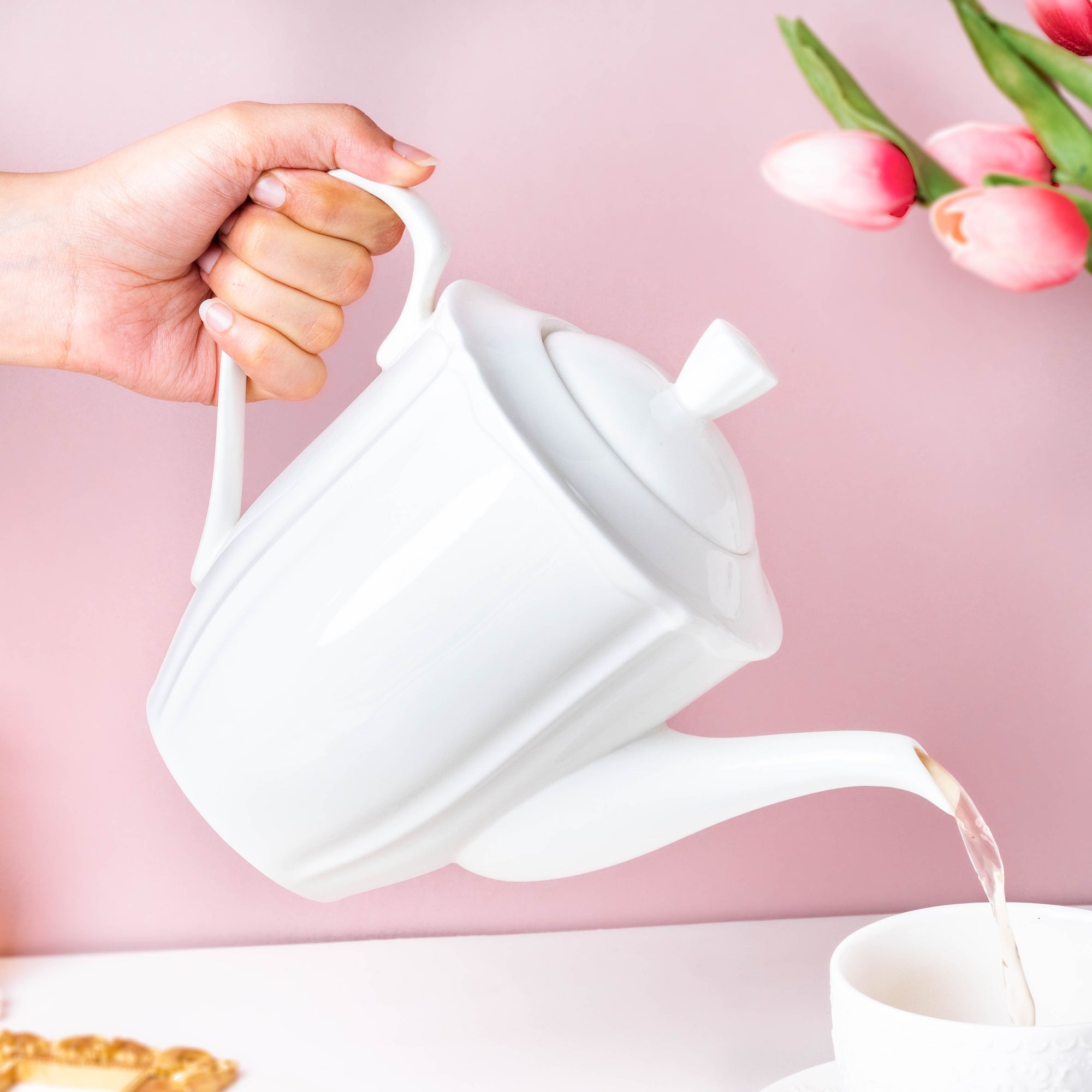 Serve hot piping tea in the classic white ceramic teapot. The teapot has a scalloped texture adding vividness to the tea-time setting. The well-designed handle and elongated spout enable ease in pouring the beverage. Pair the teapot with white teacups from Nestasia's collection to create the ideal tea set while serving guests. Nestip: Pair the elegant teapot with white cups for a beautiful tea-time table setup to impress guests. Size: 8.5cm D x 20cm H, Nozzle with handle - 25cm D Capacity: 1300ml Color: White Material: Ceramic Products included: 1 teapot Style: MUYU99T58