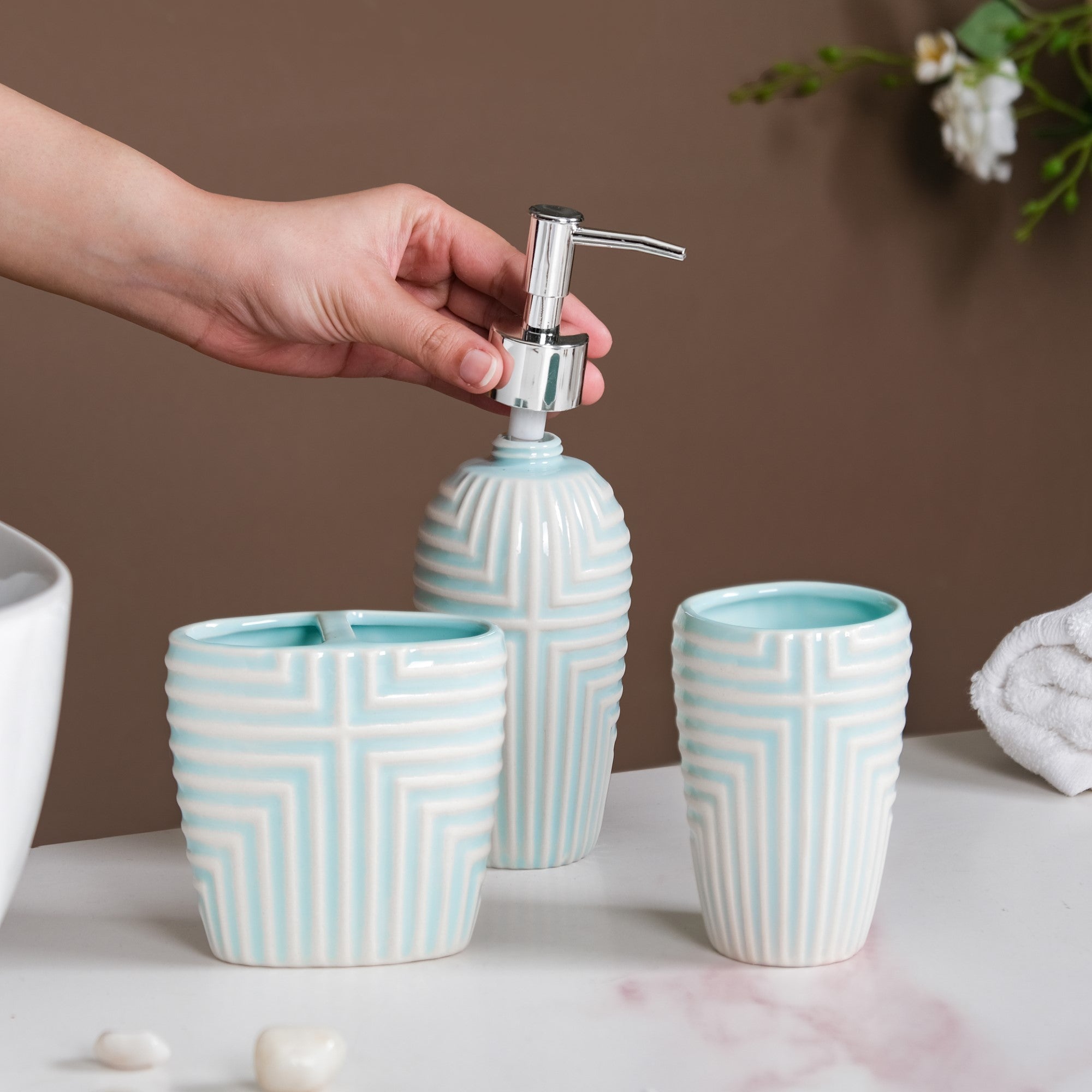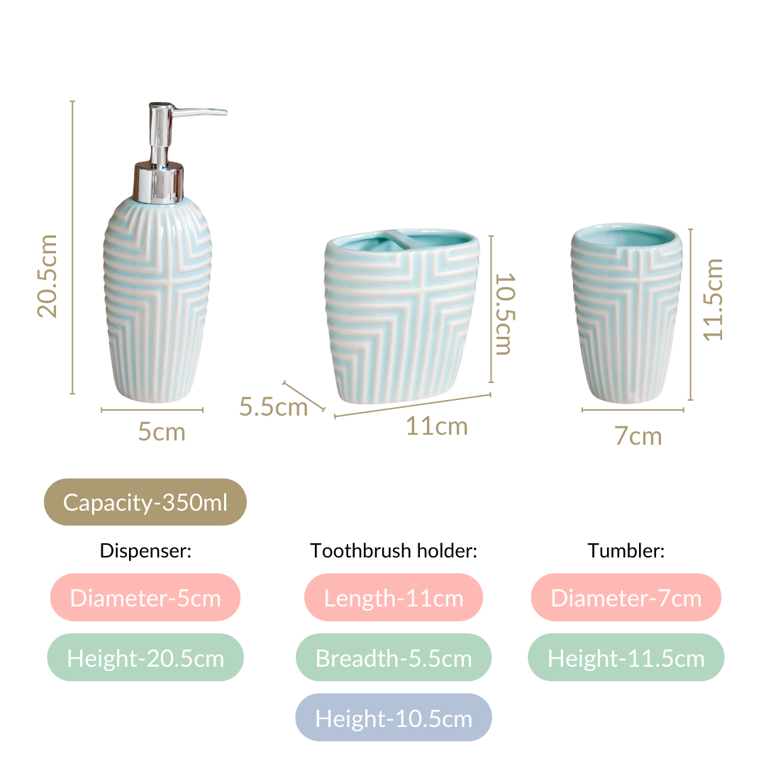Elevate your bathroom with our expertly crafted bath set, made from durable ceramic material. This stylish ceramic bath set includes three essential pieces: a refillable dispenser, a tumbler, and a toothbrush holder, each featuring a striking geometric pattern and a textured exterior. The high-quality craftsmanship ensures longevity and resilience, while the easy-to-maintain surfaces make cleaning a breeze. Combining modern design with practical functionality, this bath set adds a touch of sophistication to your daily routine, making it the perfect addition to any contemporary bathroom.