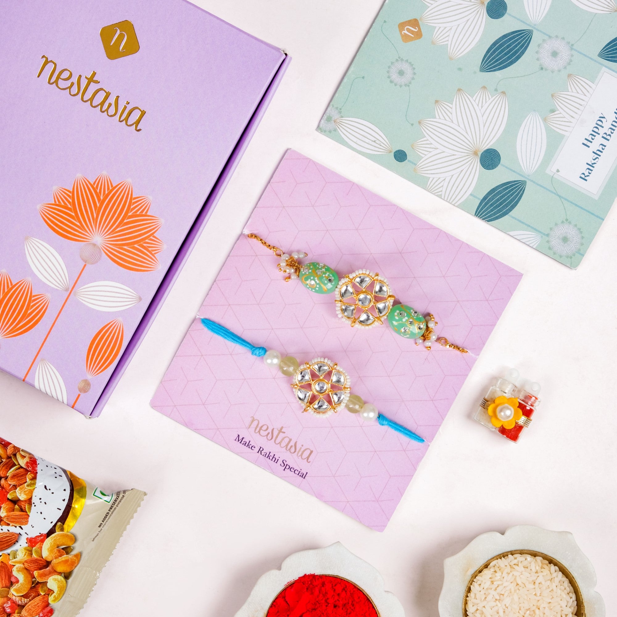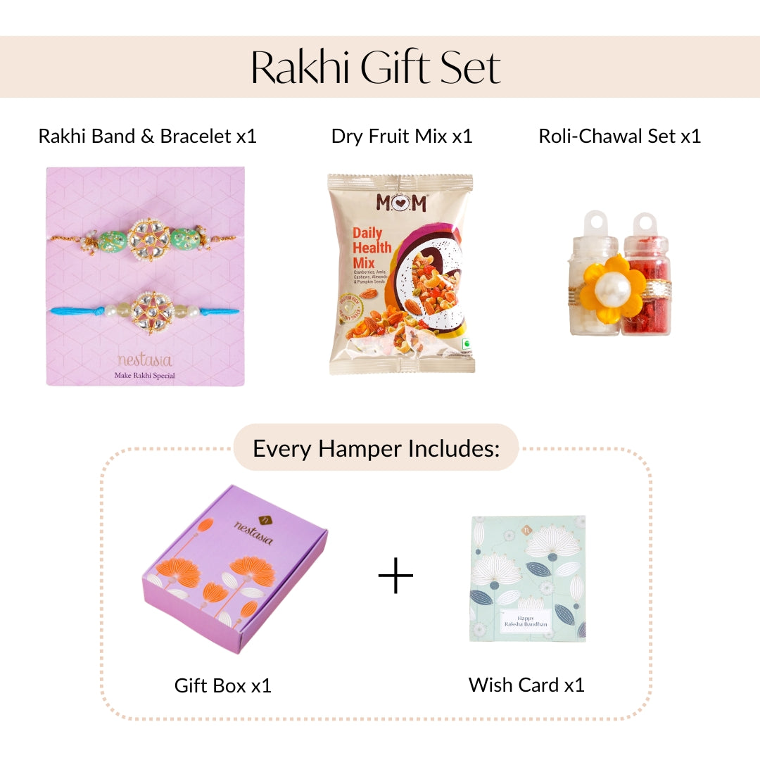Celebrate sibling bonds with this handcrafted Rakhi and Bracelet set that blends tradition with modern charm. The rakhi features a radiant floral centrepiece with lustrous kundan work, flanked by soft green beads and faux pearls. The bracelet mirrors this design, with added gold-toned accents and hand-painted mint enamel beads for a festive flair. Complete with a roli-chawal bottle set, a pack of dry fruits, a wish card, and a premium gift box, this set is perfect for a memorable Raksha Bandhan celebration.