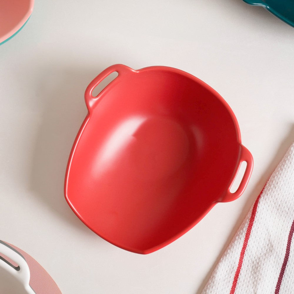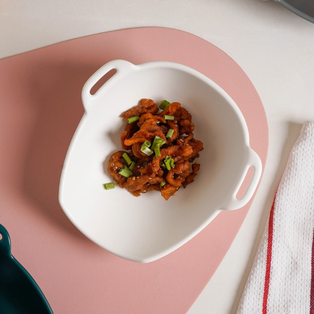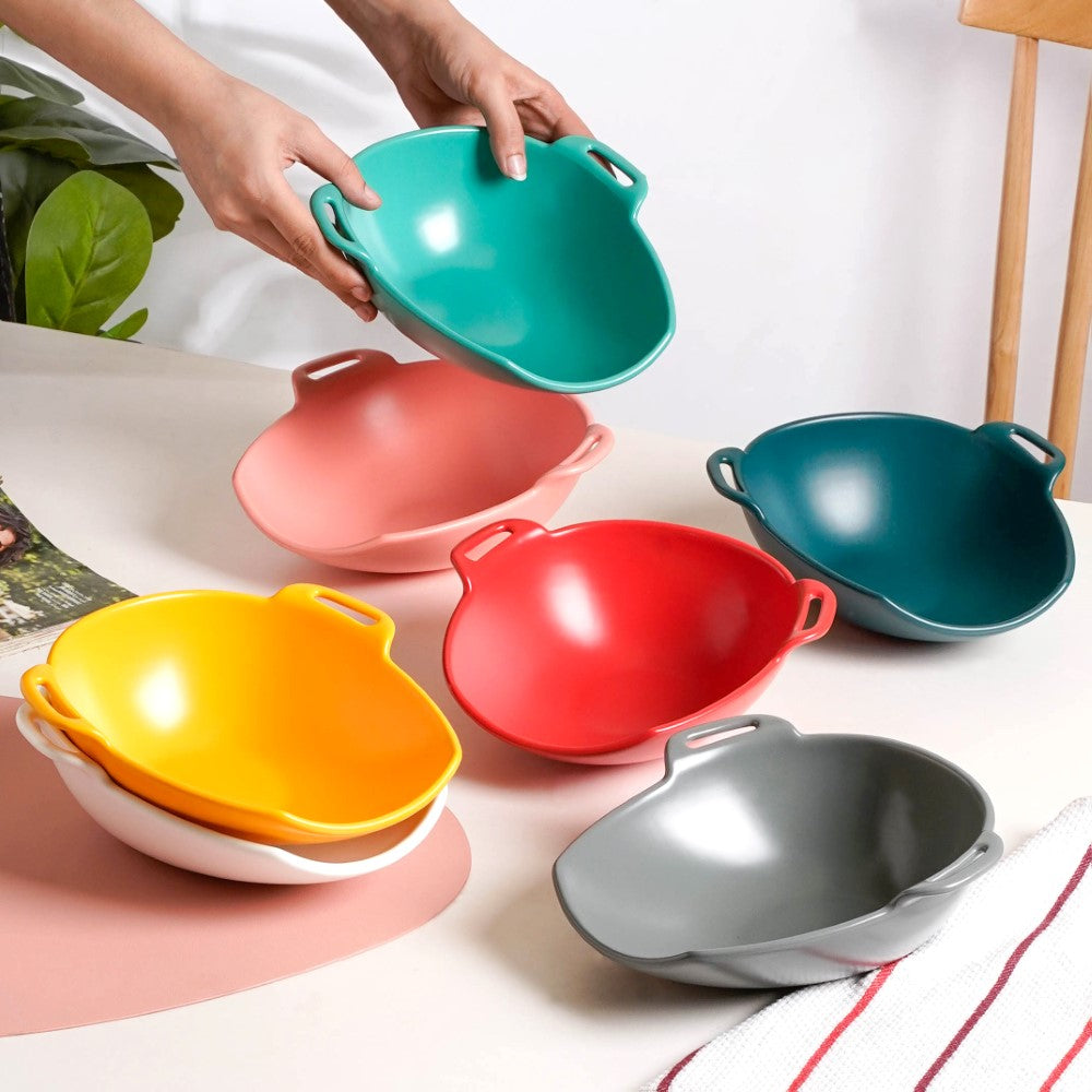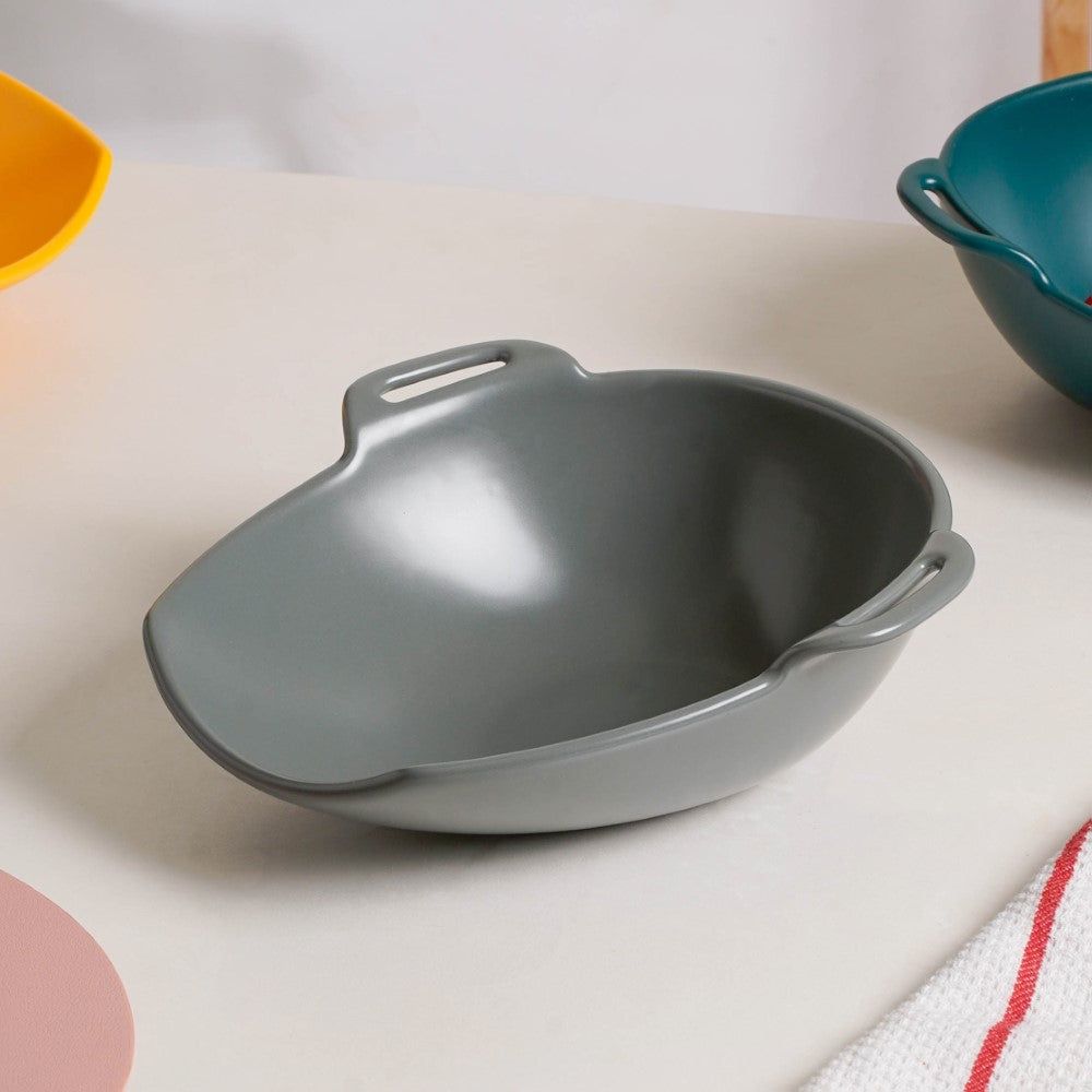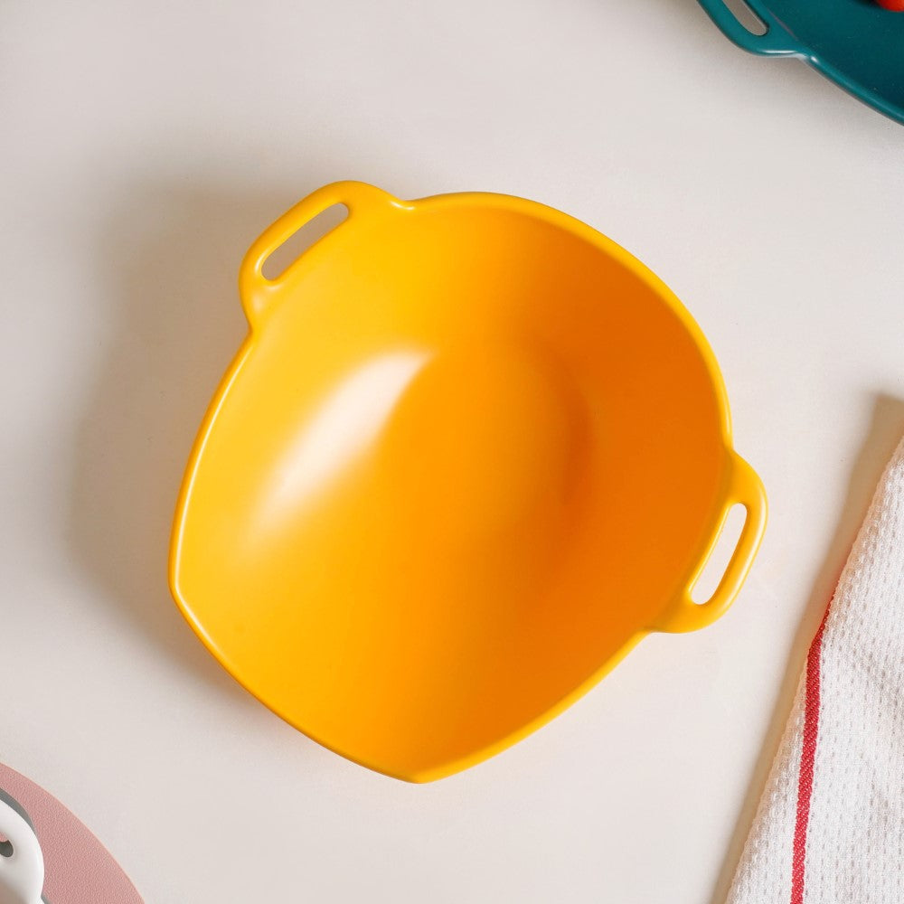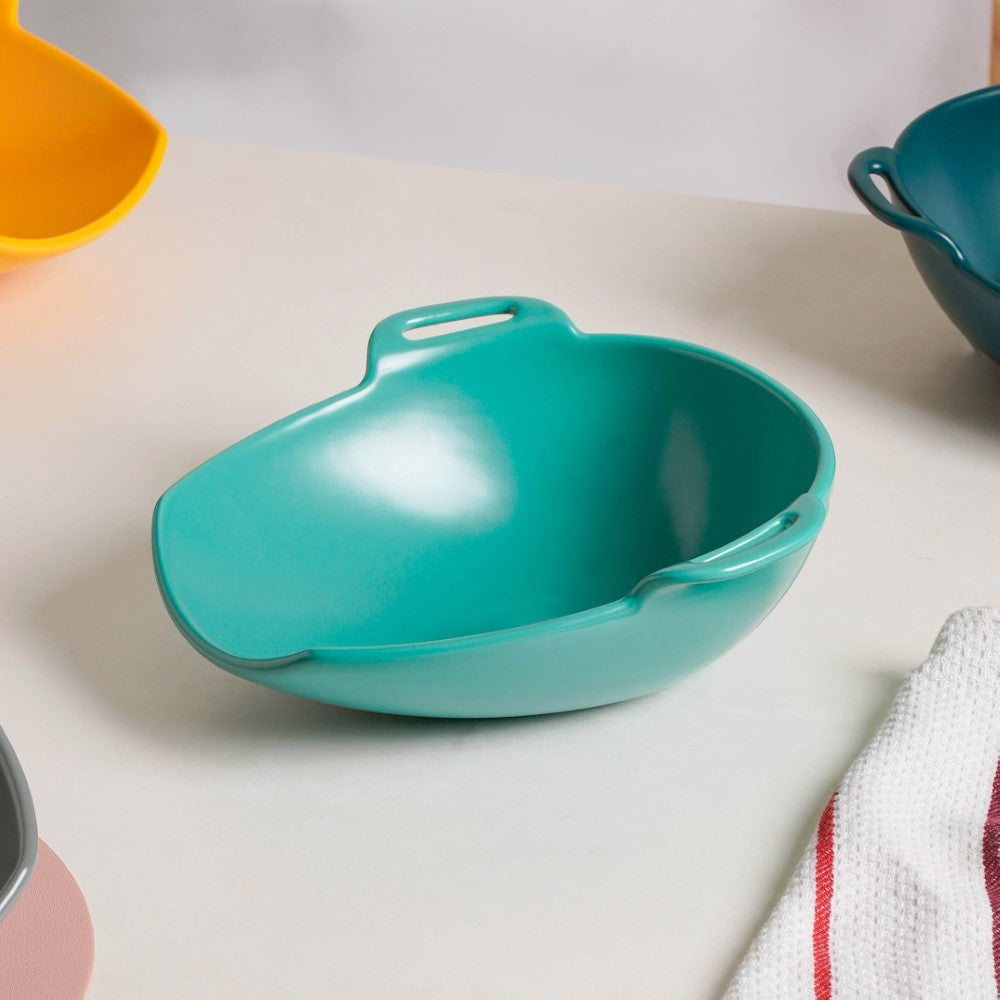 Serving platters with handles in an abstract shape and a variety of colours for an elevated dining experience. The unique shape of the platters make them stand out. They are apt for being used as serving trays for food items like snacks, rice, noodles, and more. The platters can be paired with deep dish plates to create a similar colour tone set. The bowls are oven, microwave and dishwasher safe.
