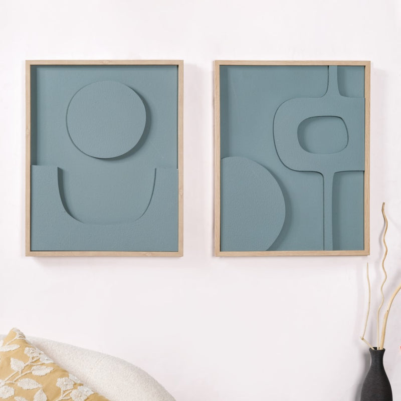 Certainly! The teal hue and simple yet abstract designs with protruding 3D geometric shapes make the art pieces quite evocative. The refined beige polystyrene frame and sturdy MDF backing add a layer of security, making the piece a practical and lasting addition to the recipient's decor.