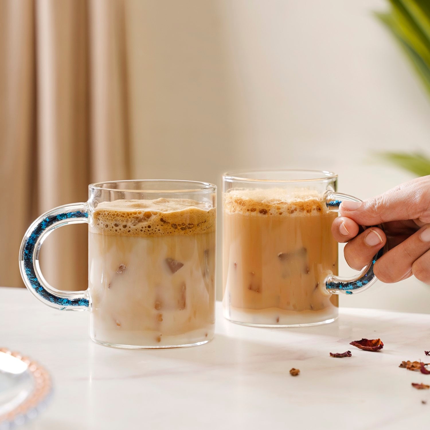 Set Of 2 Blue Sparkle Filled Handle Glass Coffee Cups 425ml