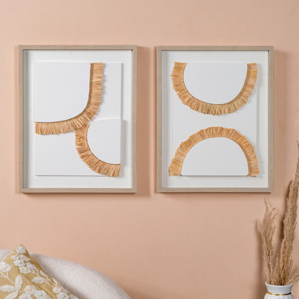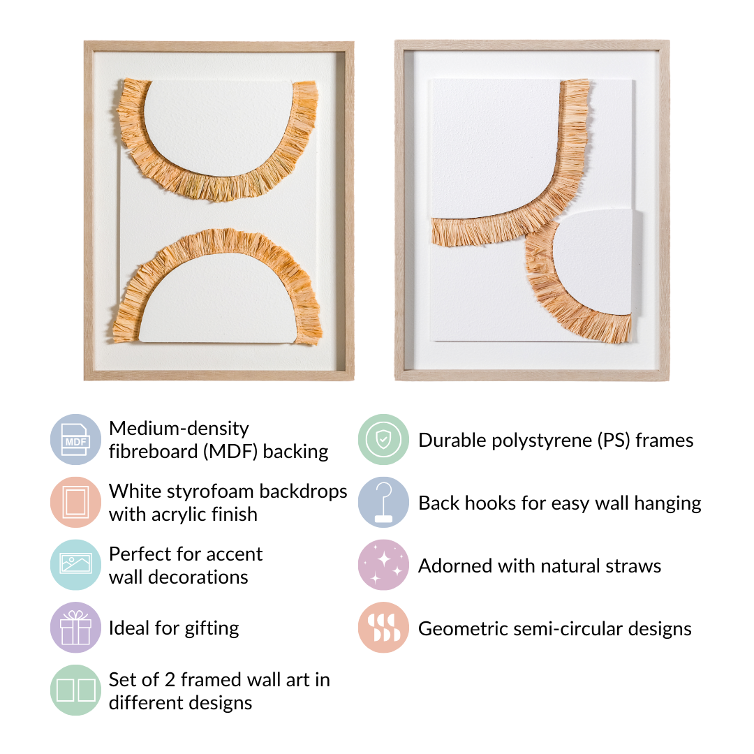 Certainly! The wall art pieces feature a clear white styrofoam backdrop and natural straw fibres arranged in a U-shape, which adds a rustic and earthy charm to any space. Moreover, the durable frame and MDF backing provide excellent structural support to the art pieces, making the set a lasting addition to the recipient's home.