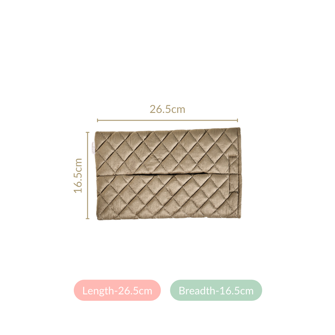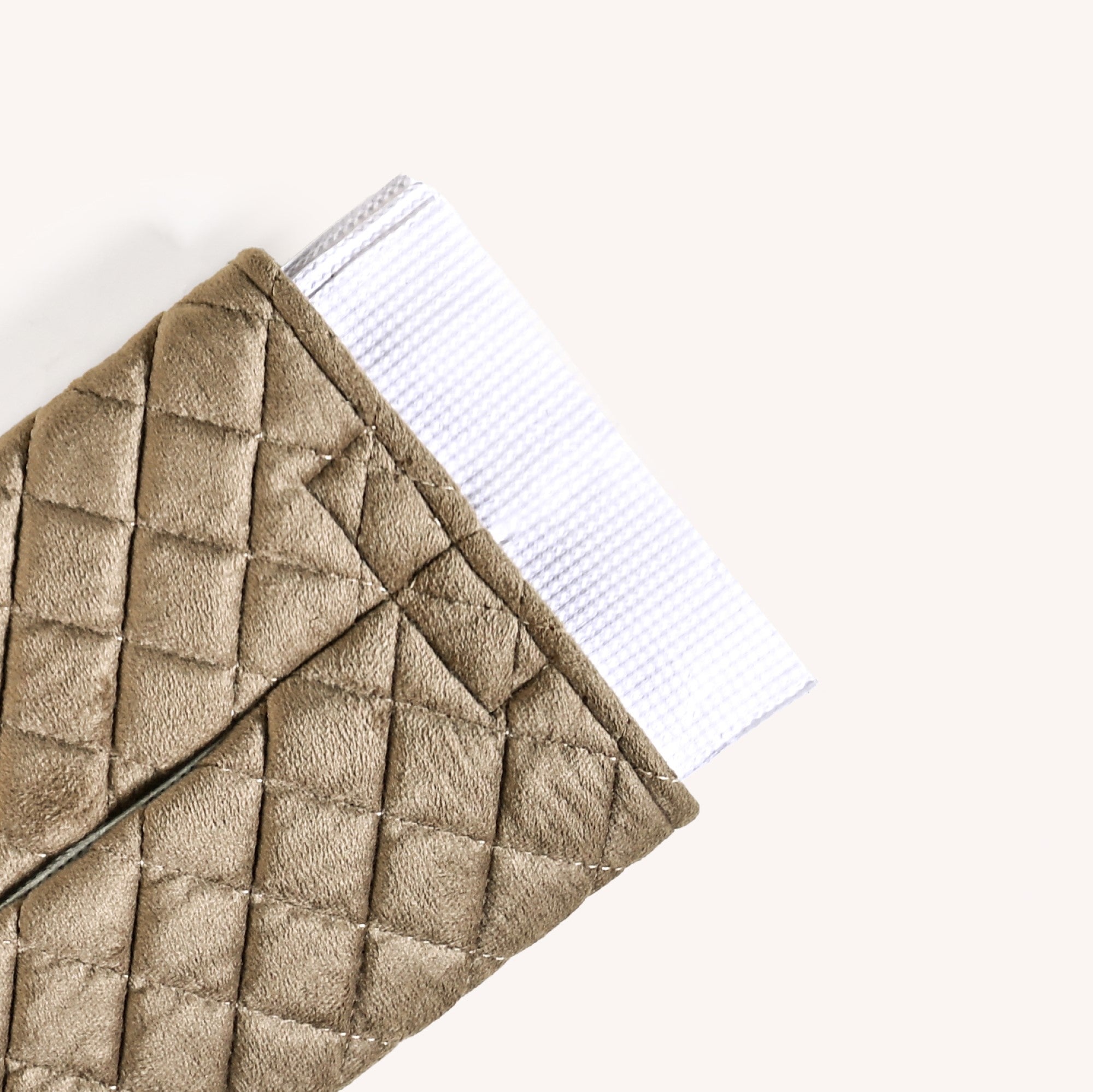 Design: Crafted with a sleek, quilted velvet exterior in a muted khaki tone, these tissue paper holders bring a touch of sophistication to your vehicle. The front opening provides quick and easy access to tissues, while the adjustable back strap ensures a snug and secure fit. They can be conveniently placed on your car’s headrest, armrest, or any other accessible area, allowing you to keep tissues within reach at all times.