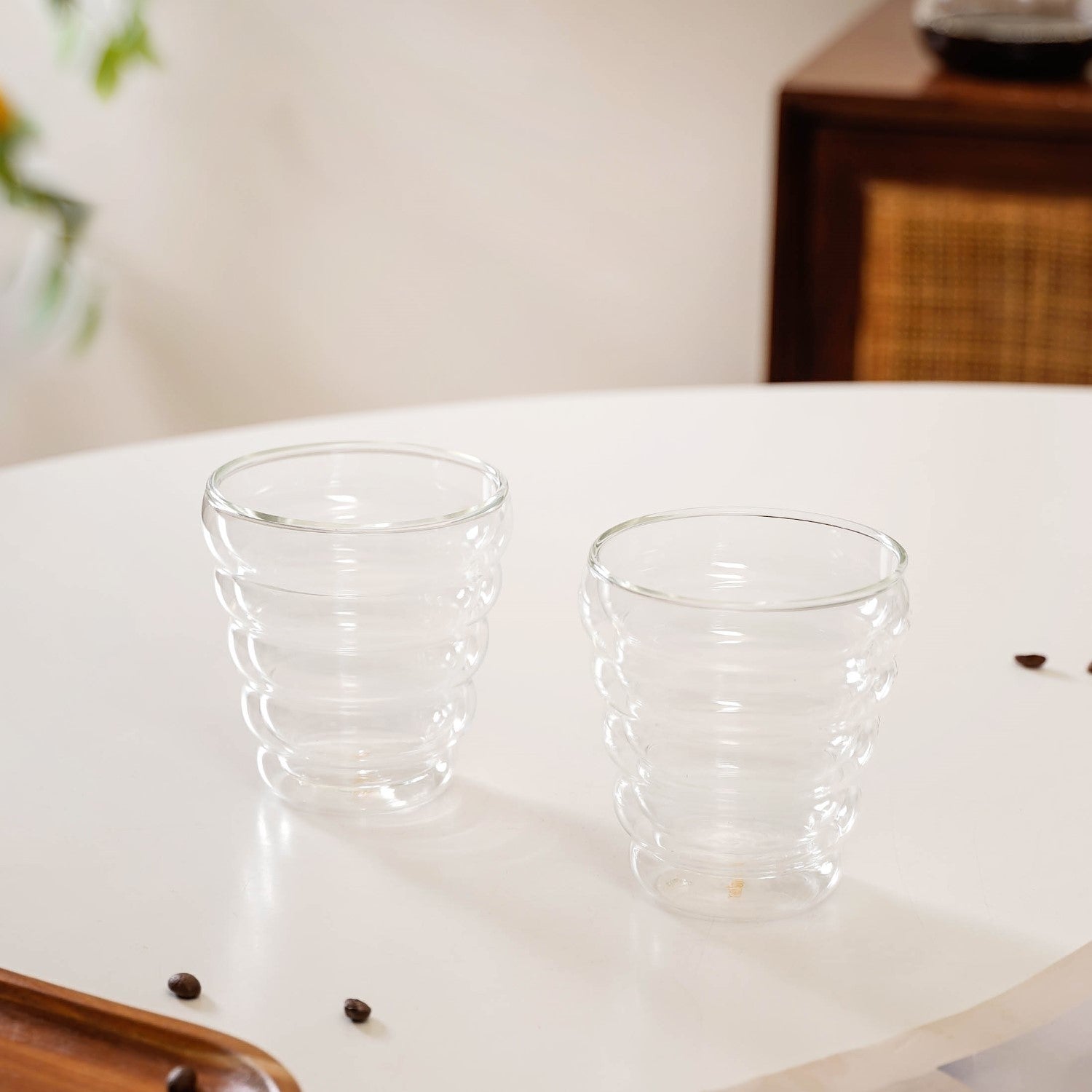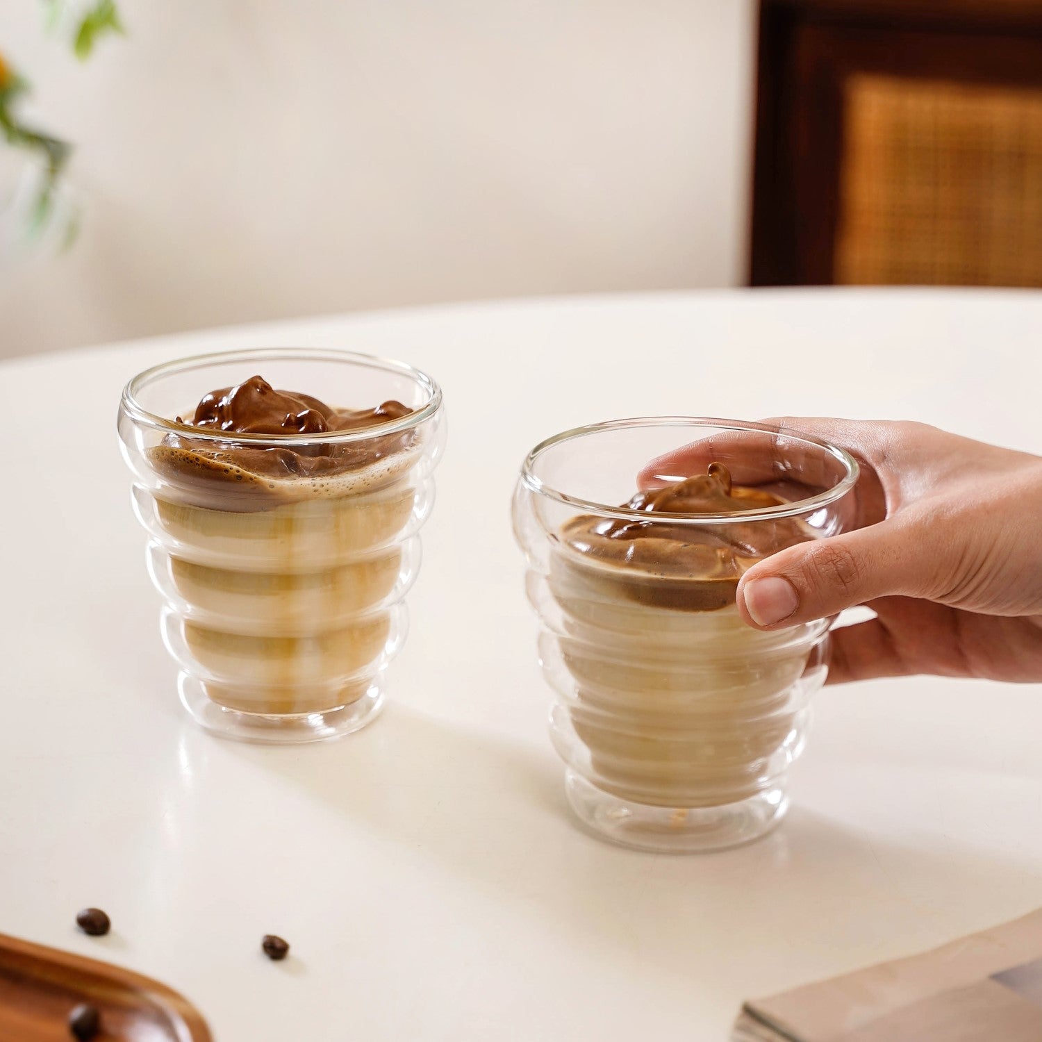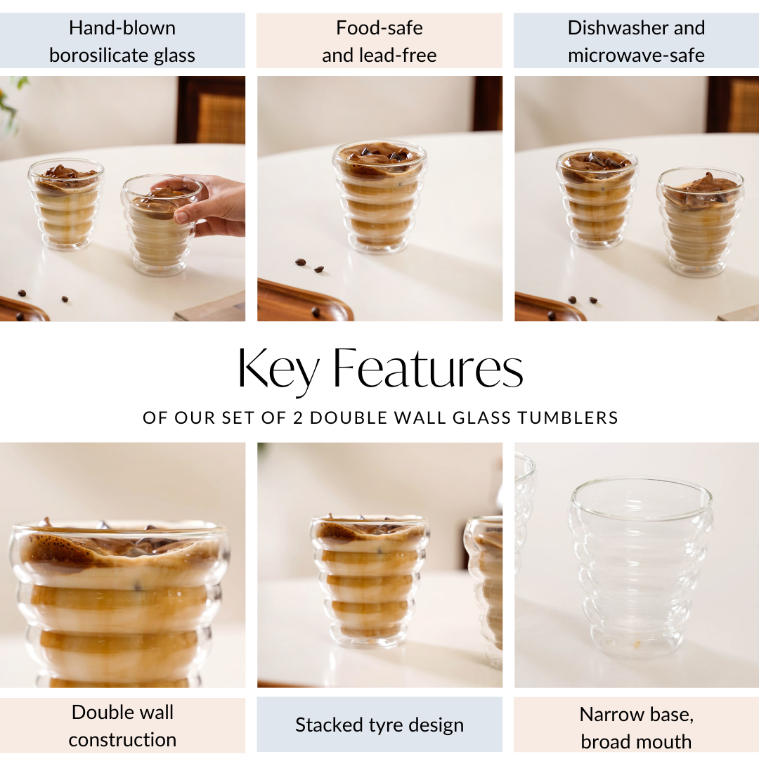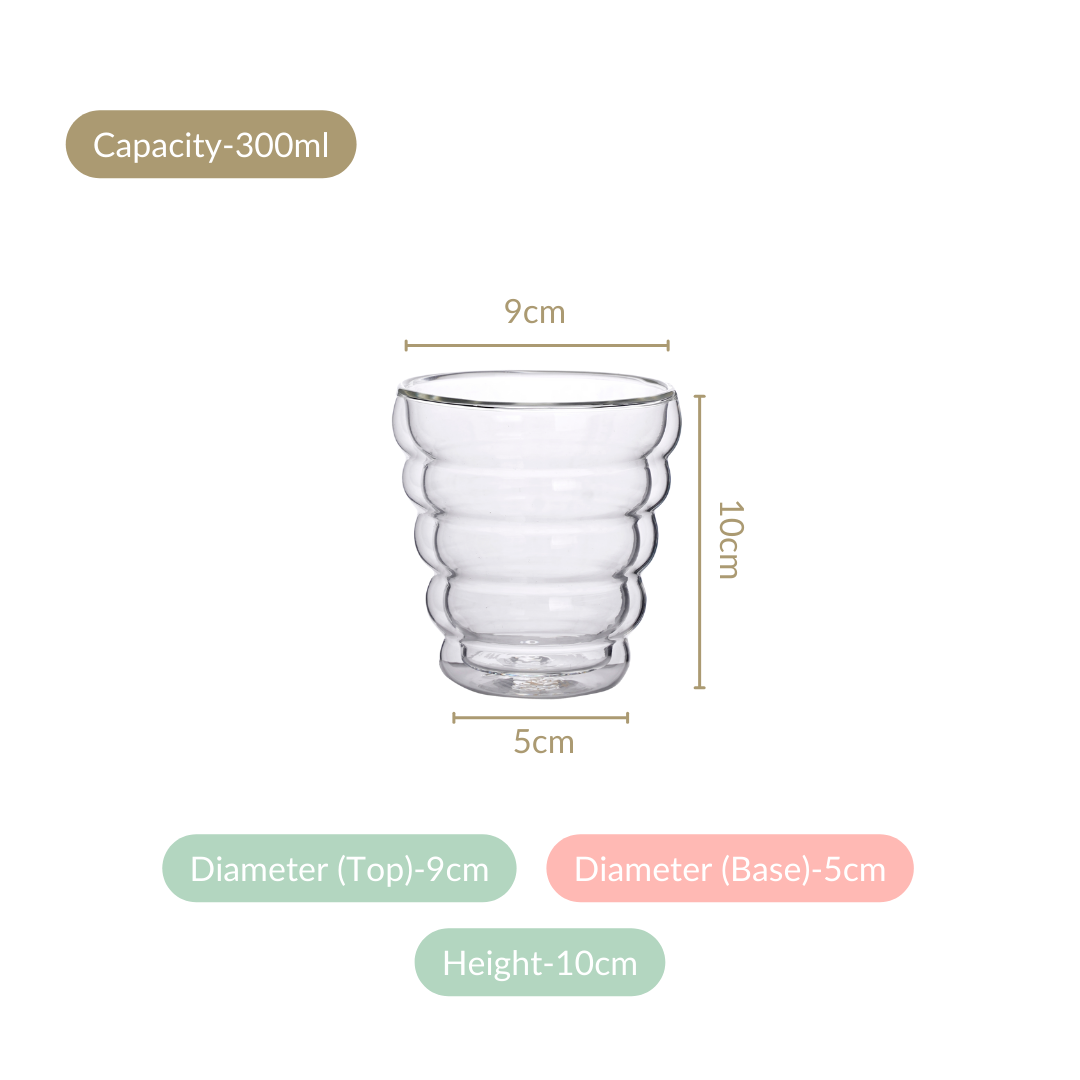 Design: The glass tumblers feature a stacked tyre design that effortlessly combines style with functionality. The narrow base ensures a comfortable grip, while the broad mouth allows for easy sipping and serving of various beverages, making them perfect as mocktail or cocktail glasses. The double wall construction adds a striking visual element and helps to maintain the temperature of your drinks, whether hot or cold.