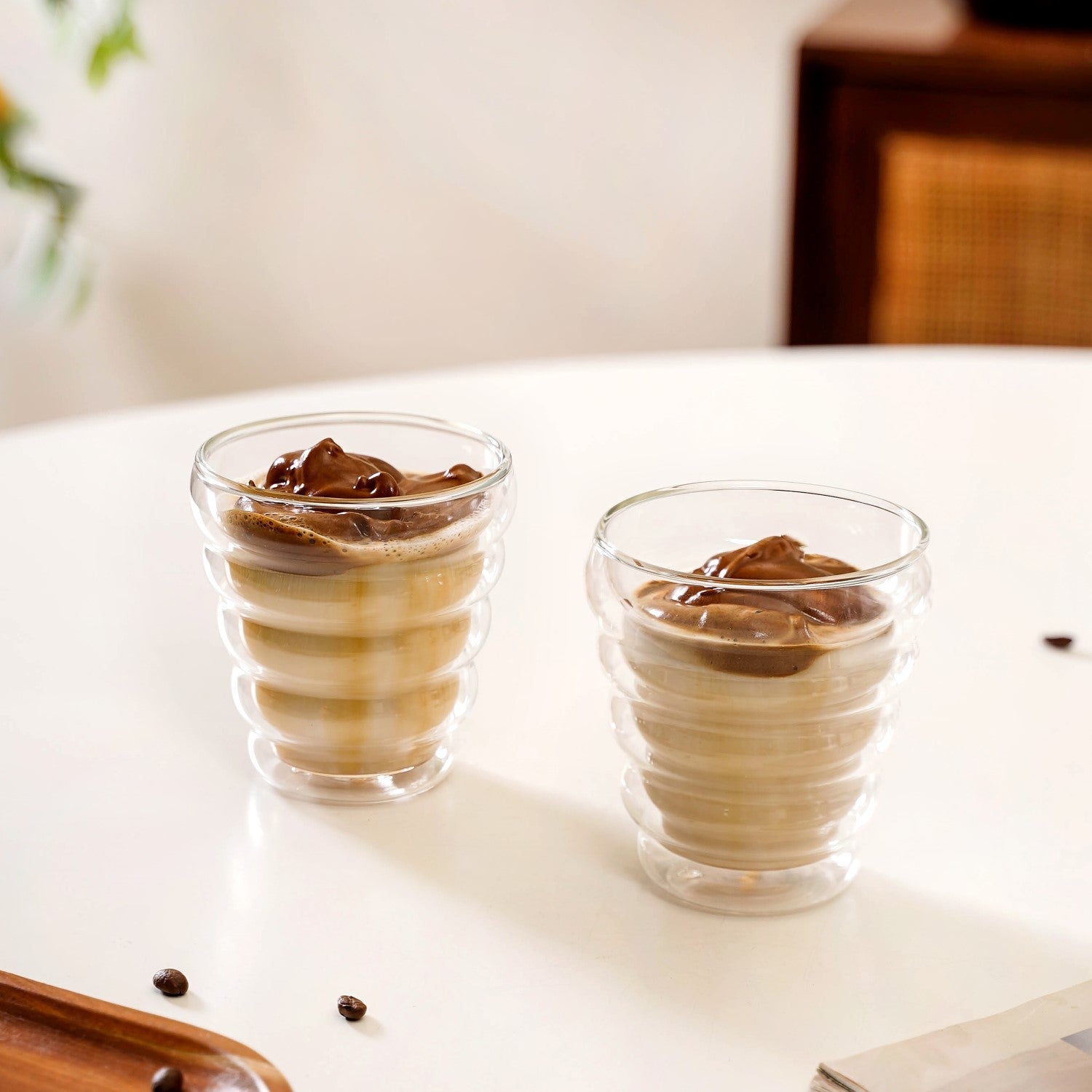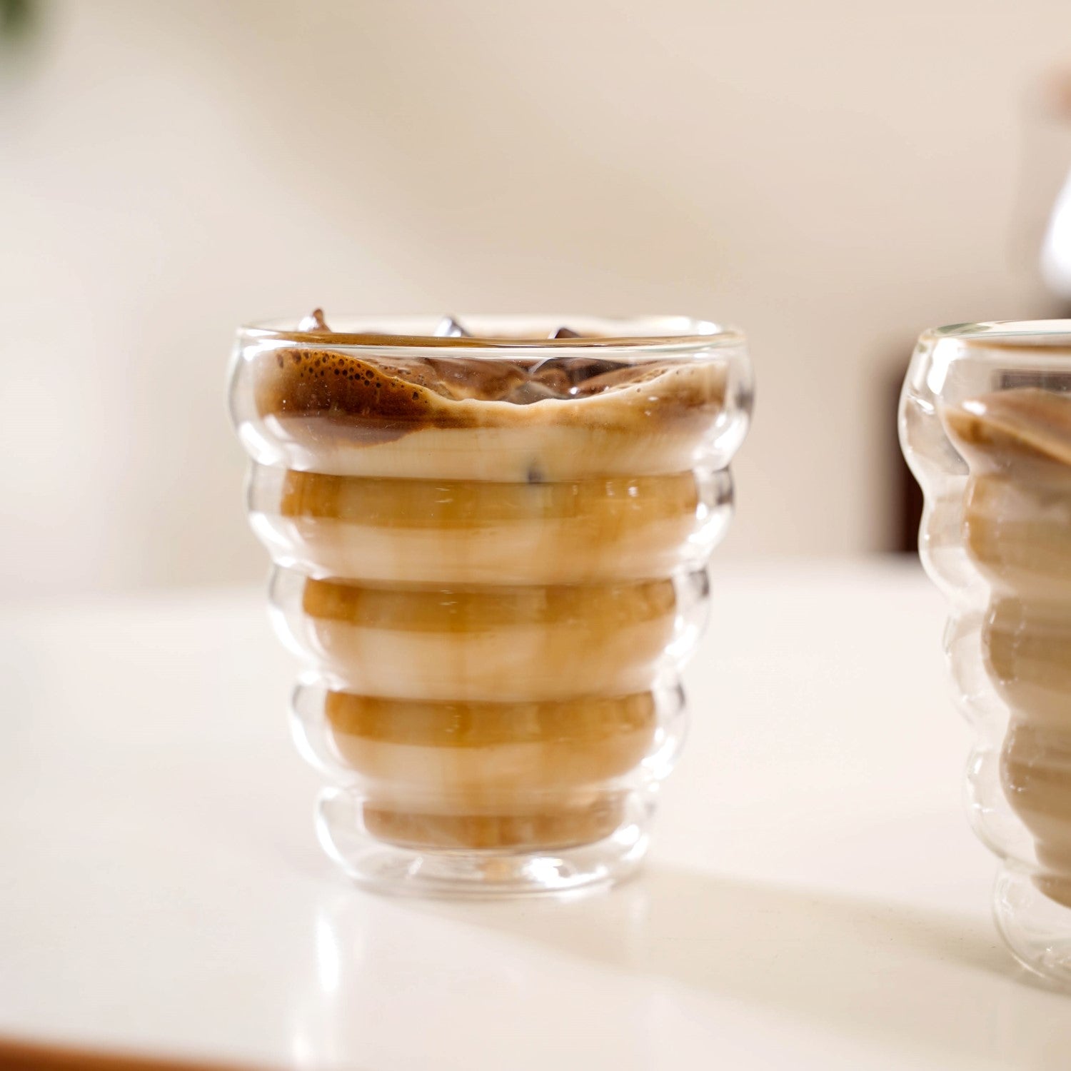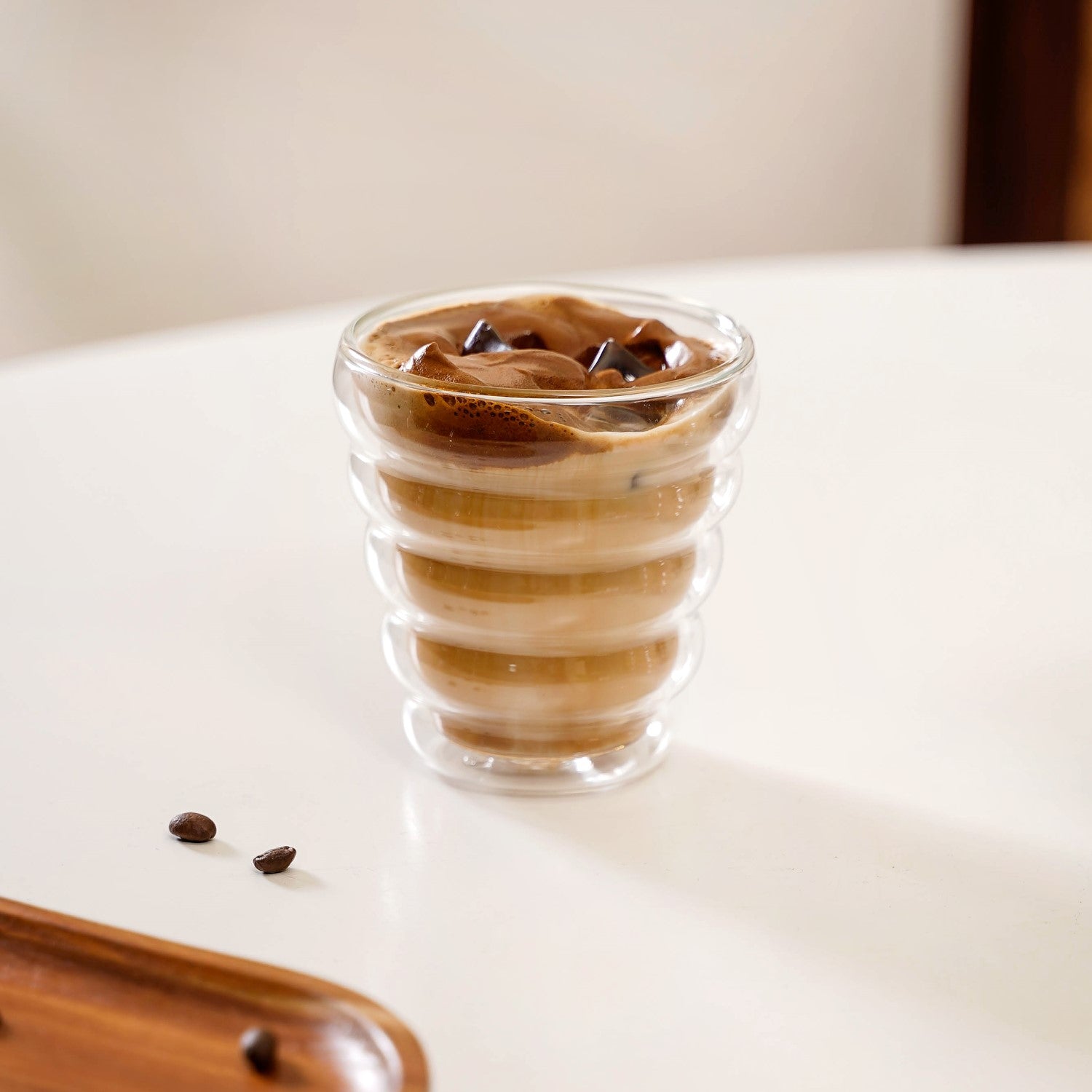 Design: The glass tumblers feature a stacked tyre design that effortlessly combines style with functionality. The narrow base ensures a comfortable grip, while the broad mouth allows for easy sipping and serving of various beverages, making them perfect as mocktail or cocktail glasses. The double wall construction adds a striking visual element and helps to maintain the temperature of your drinks, whether hot or cold.
