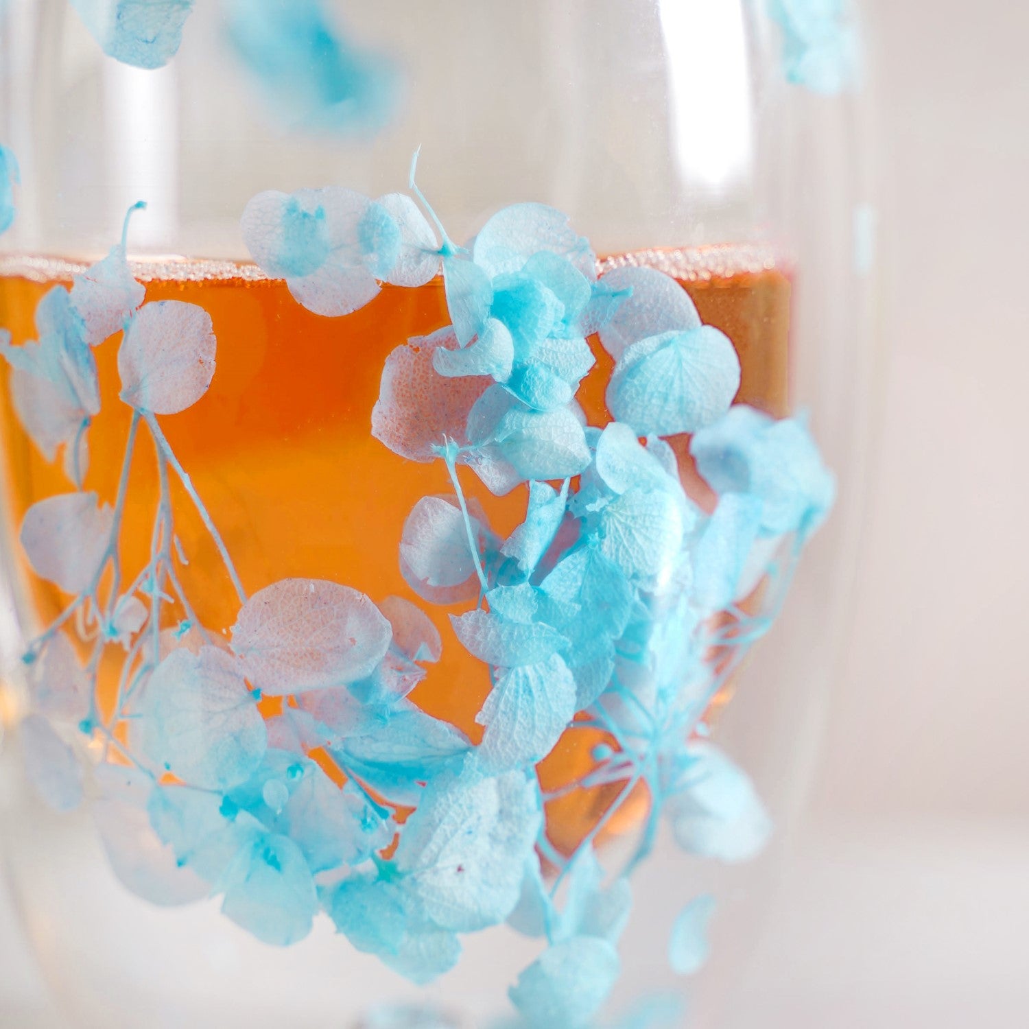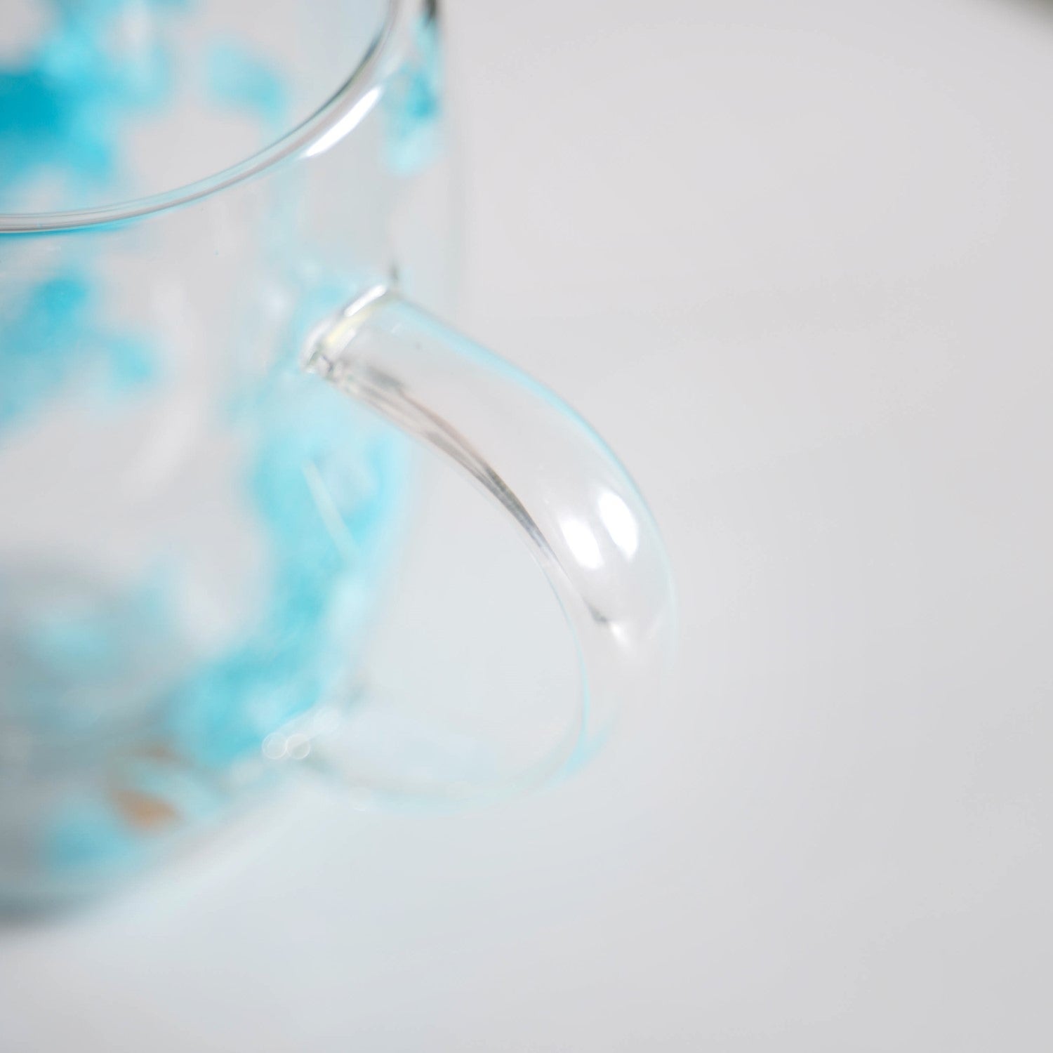 Design: This elegant glass coffee mug set features a clean, transparent design with smooth, rounded edges and a double-wall construction that enhances both style and function. Its slightly bulbous shape narrows gently towards the bottom, while a clear, curved handle completes the look. Inside the base of the double wall, delicate blue dried leaves and airy sprigs create a soft, floating effect, adding a unique decorative touch. The mug also has scattered blue fragments along the inner wall, lending an artistic, whimsical charm.