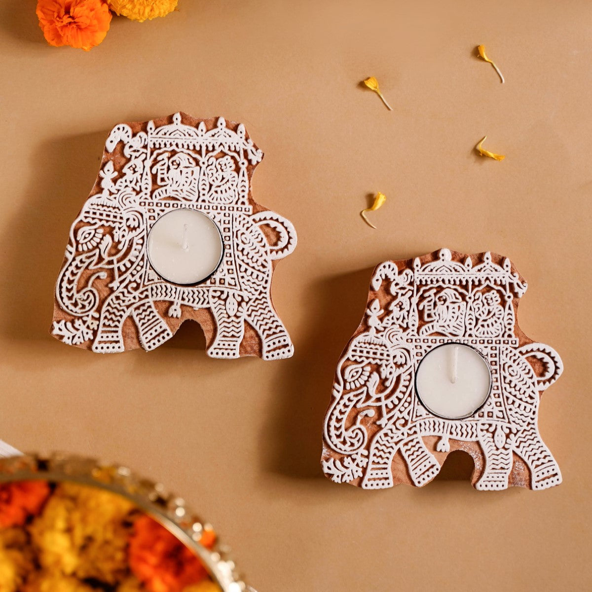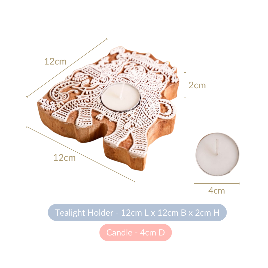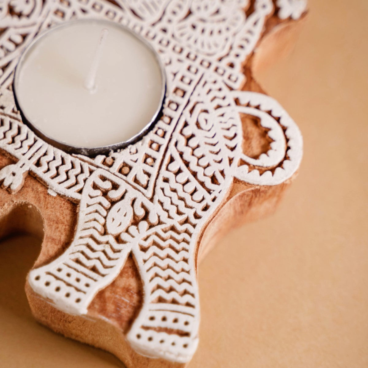 Elephants hold significant symbolism in various cultures, often representing strength, wisdom, and prosperity. In this design, the elephant carrying a howdah symbolises royalty and auspiciousness, adding the cultural richness of traditional Indian artistry to the wooden tea light holders.