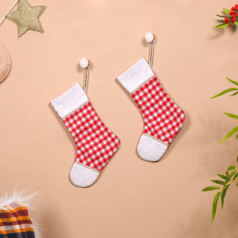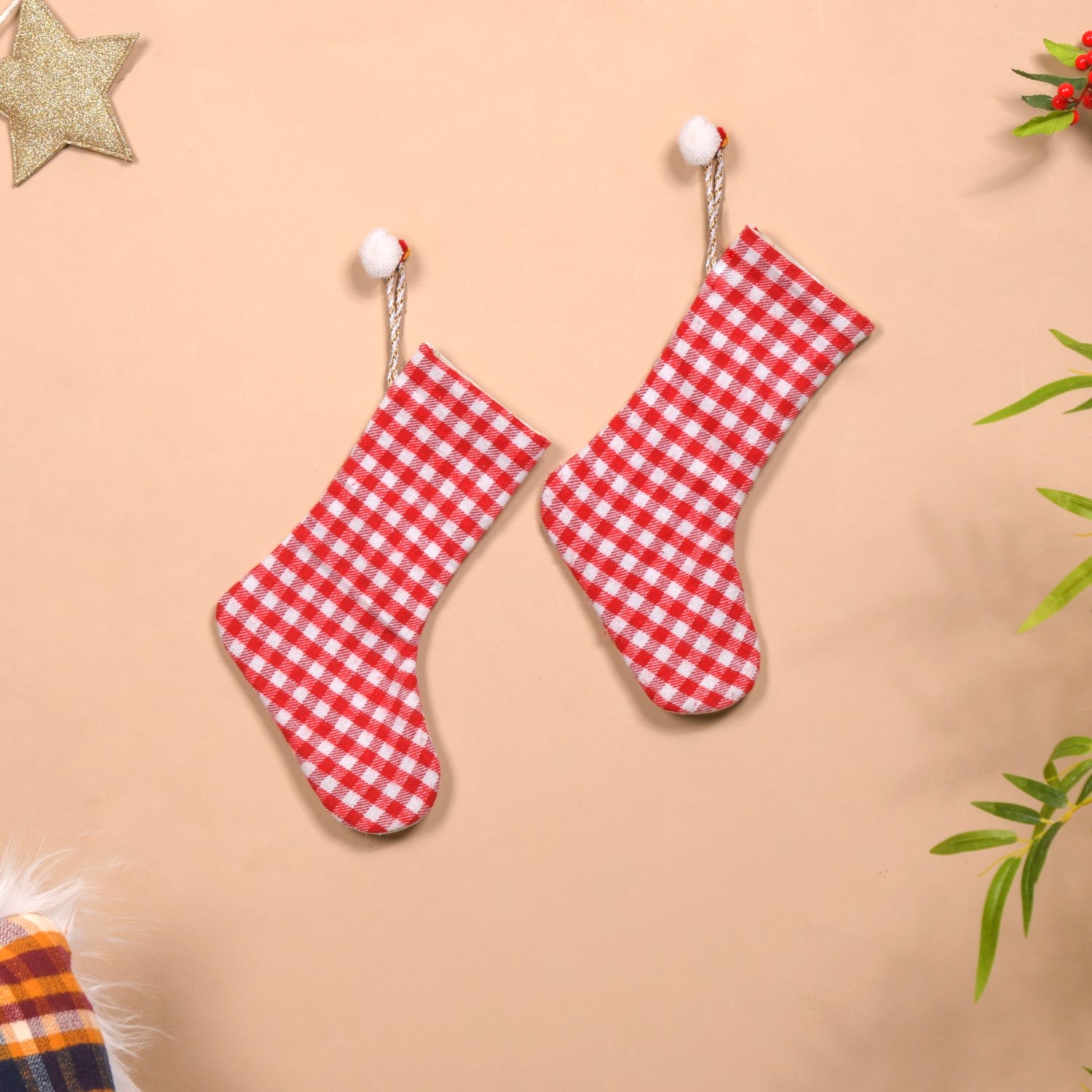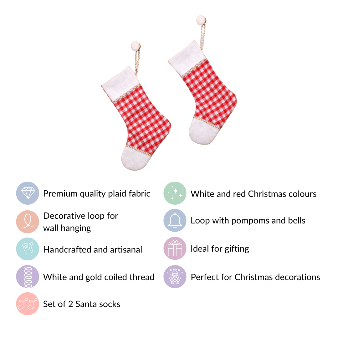 Each sock comes with a decorative loop. Simply hang them on hooks, mantles, doorknobs, or walls using these loops. The loops, adorned with pompoms and bells, add an extra touch of holiday cheer.